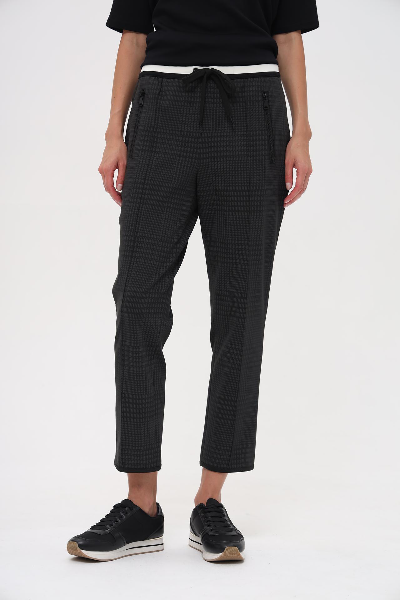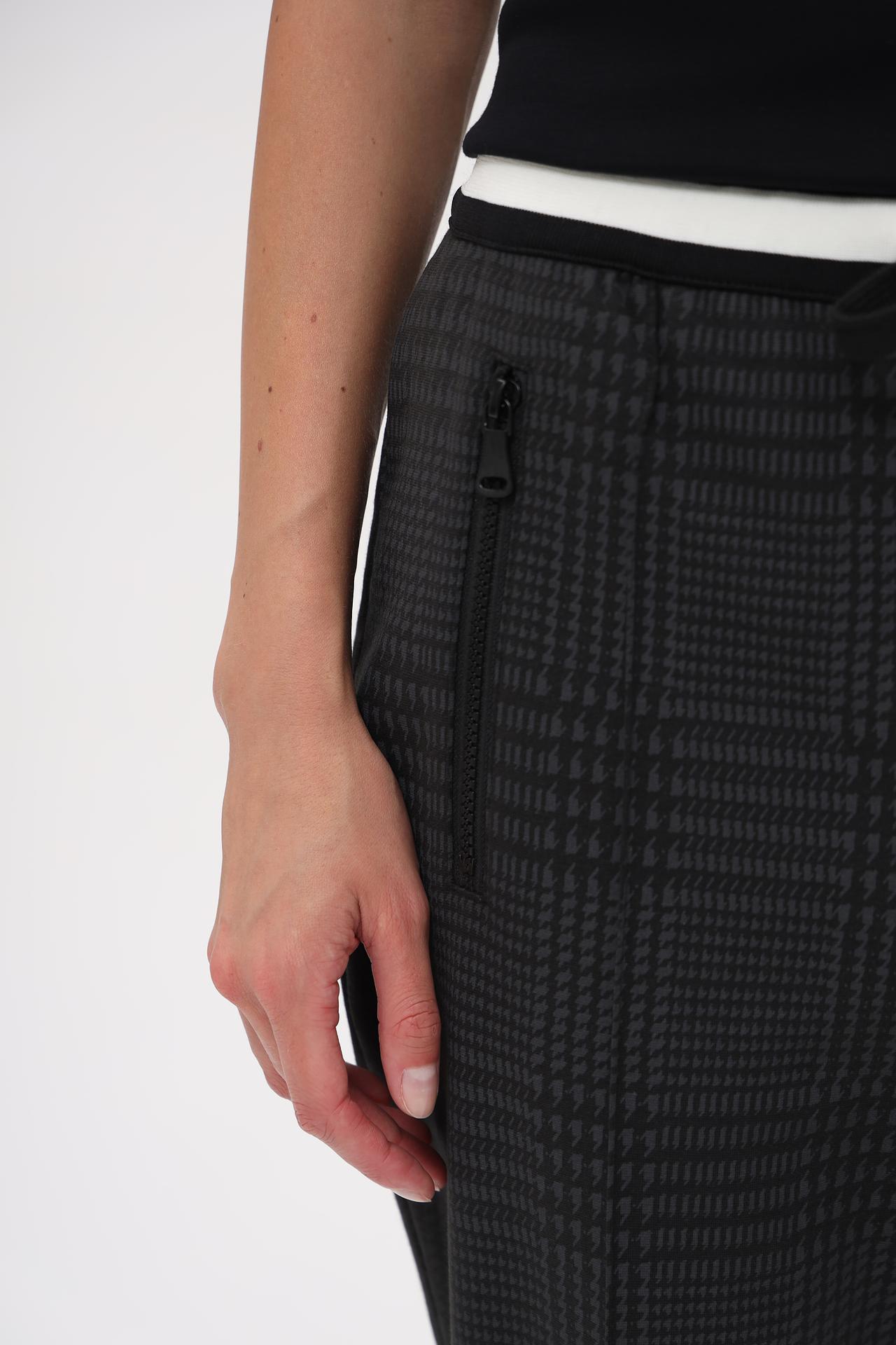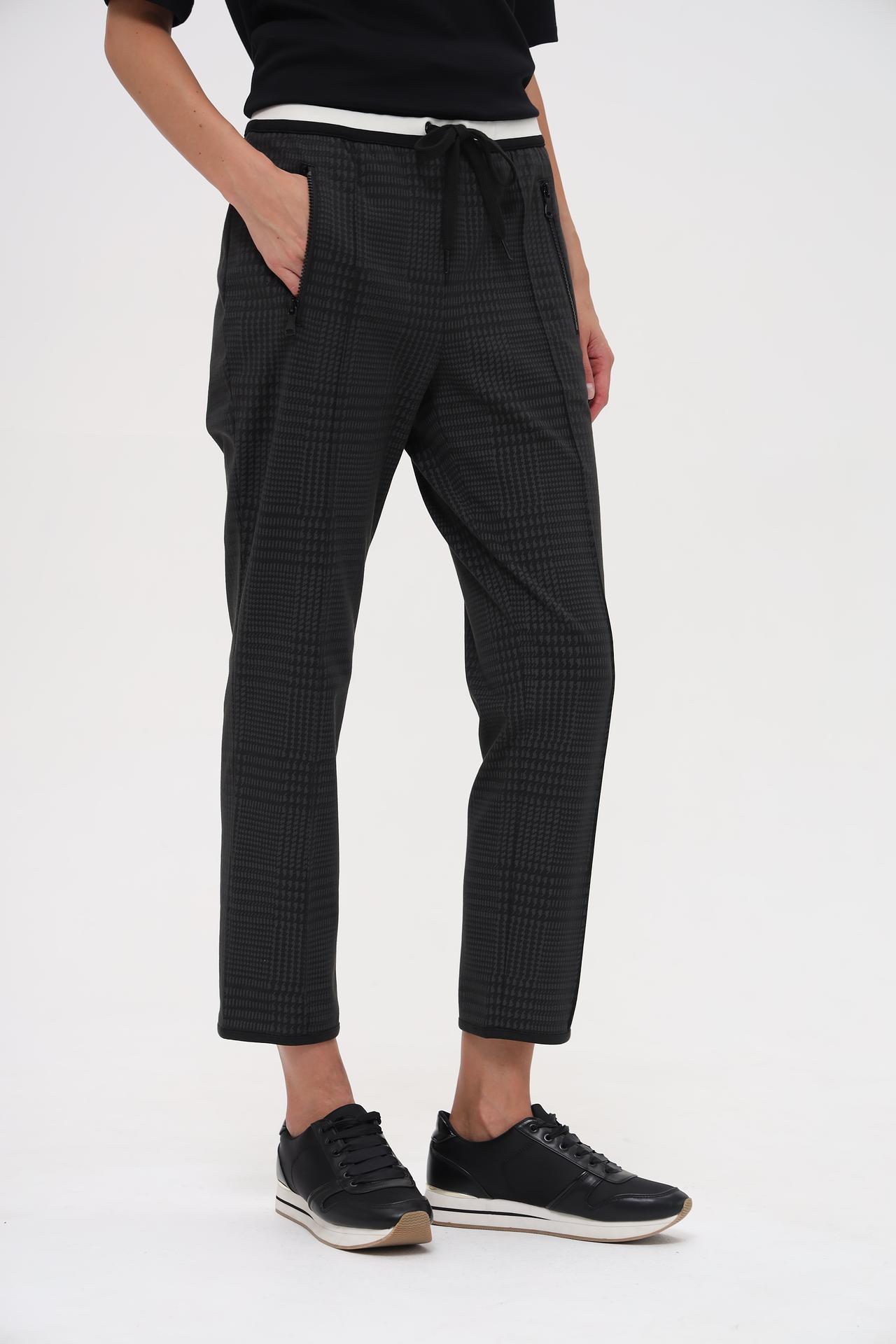 - Дизайн: Брюки отличаются стильным принтом "гусиная лапка" и актуальным кроем. Декоративные молнии на карманах добавляют изделию современный акцент.