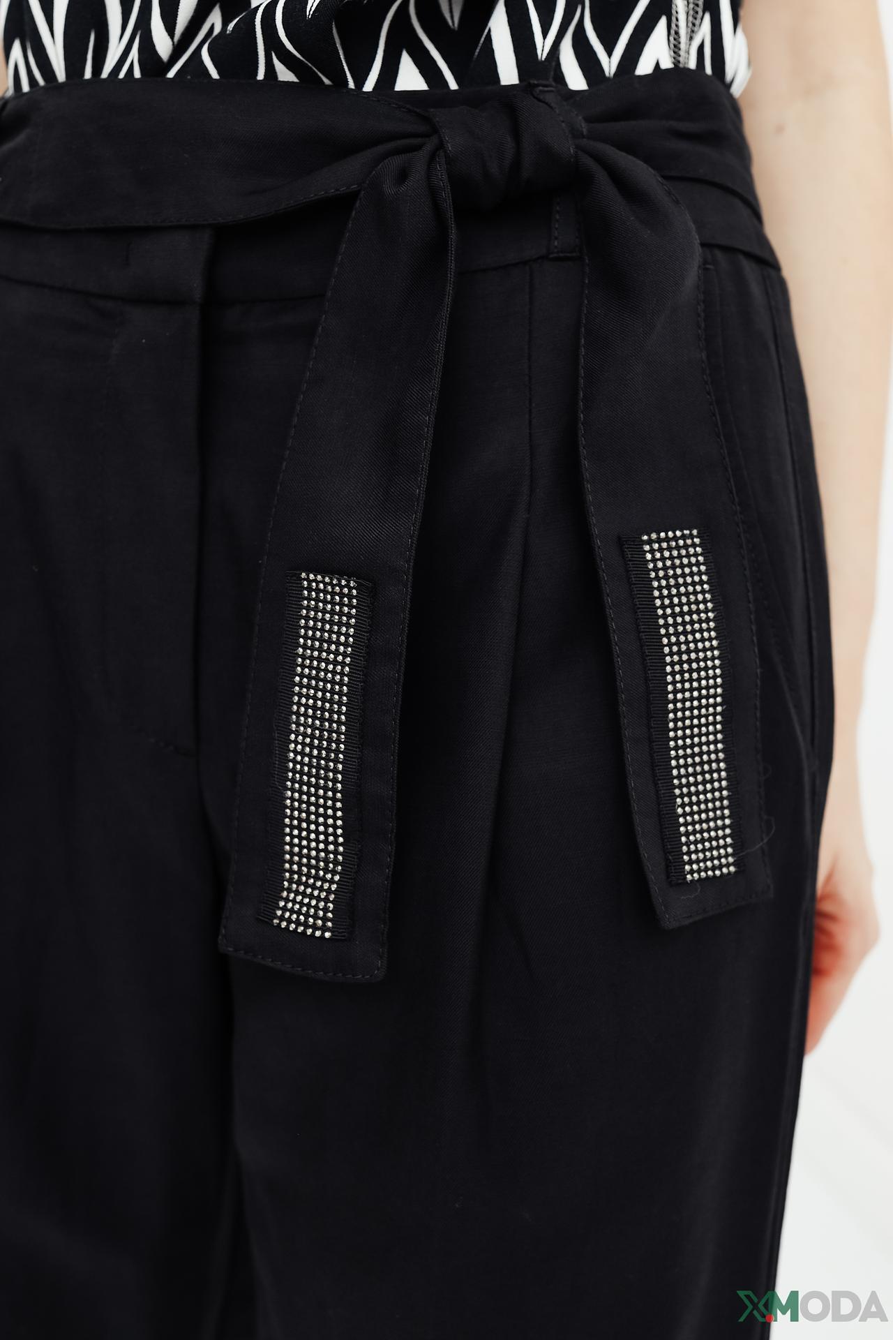 - Высокая посадка и пояс: Модель с высокой посадкой идеально сидит на фигуре, создавая выразительный силуэт. Съемный пояс-бант с блестящим декором на концах добавляет изысканности и позволяет регулировать посадку по талии.