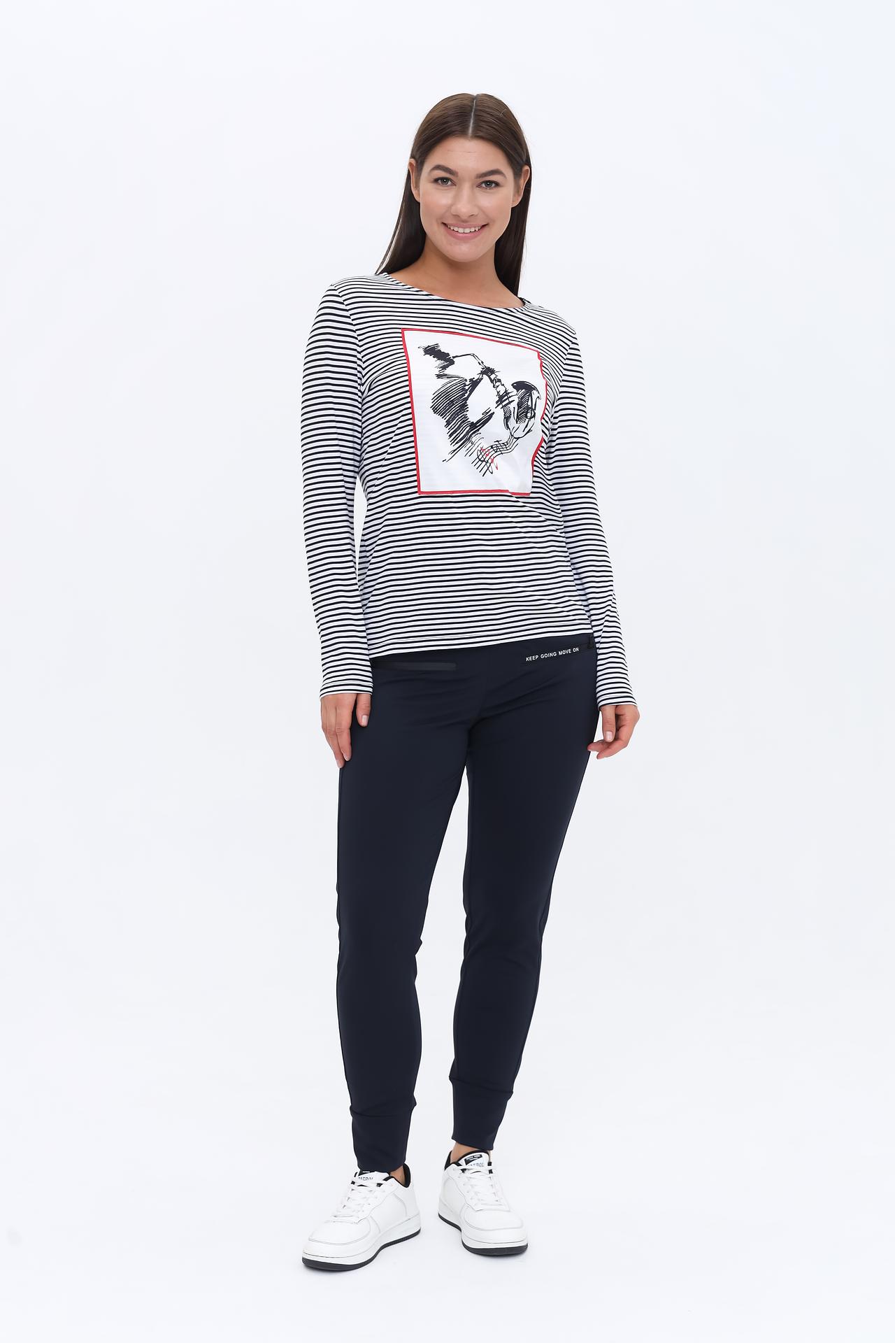 - Современный крой: Зауженный силуэт брюк с аккуратными манжетами по низу создает стильный и актуальный образ. Минималистичная надпись "KEEP GOING MOVE ON" на штанине придает изделию динамичный акцент.