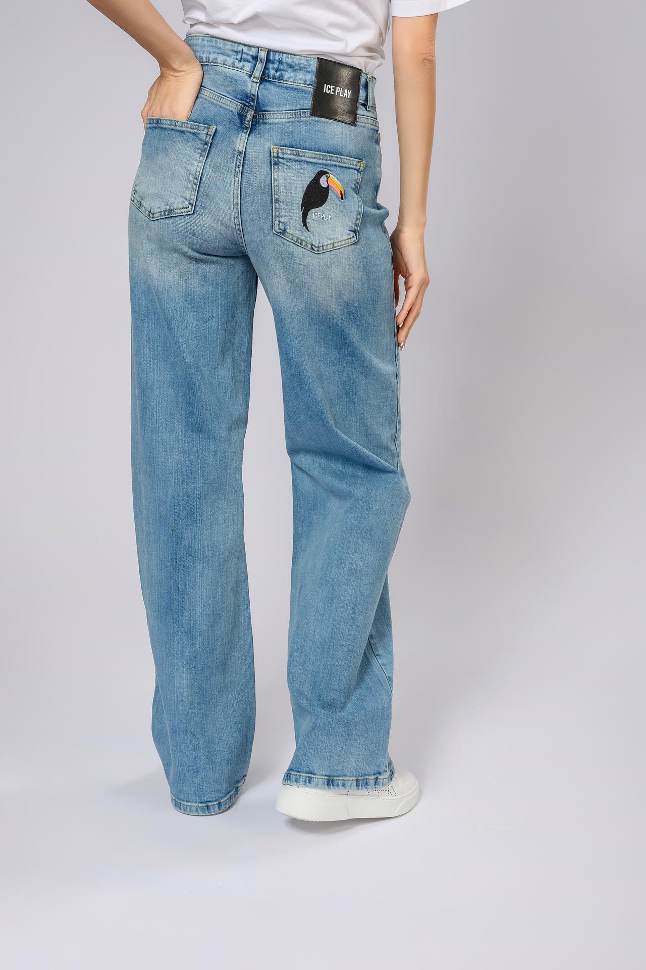Джинсы Ice Play голубые с вышивкой тукан и патчем