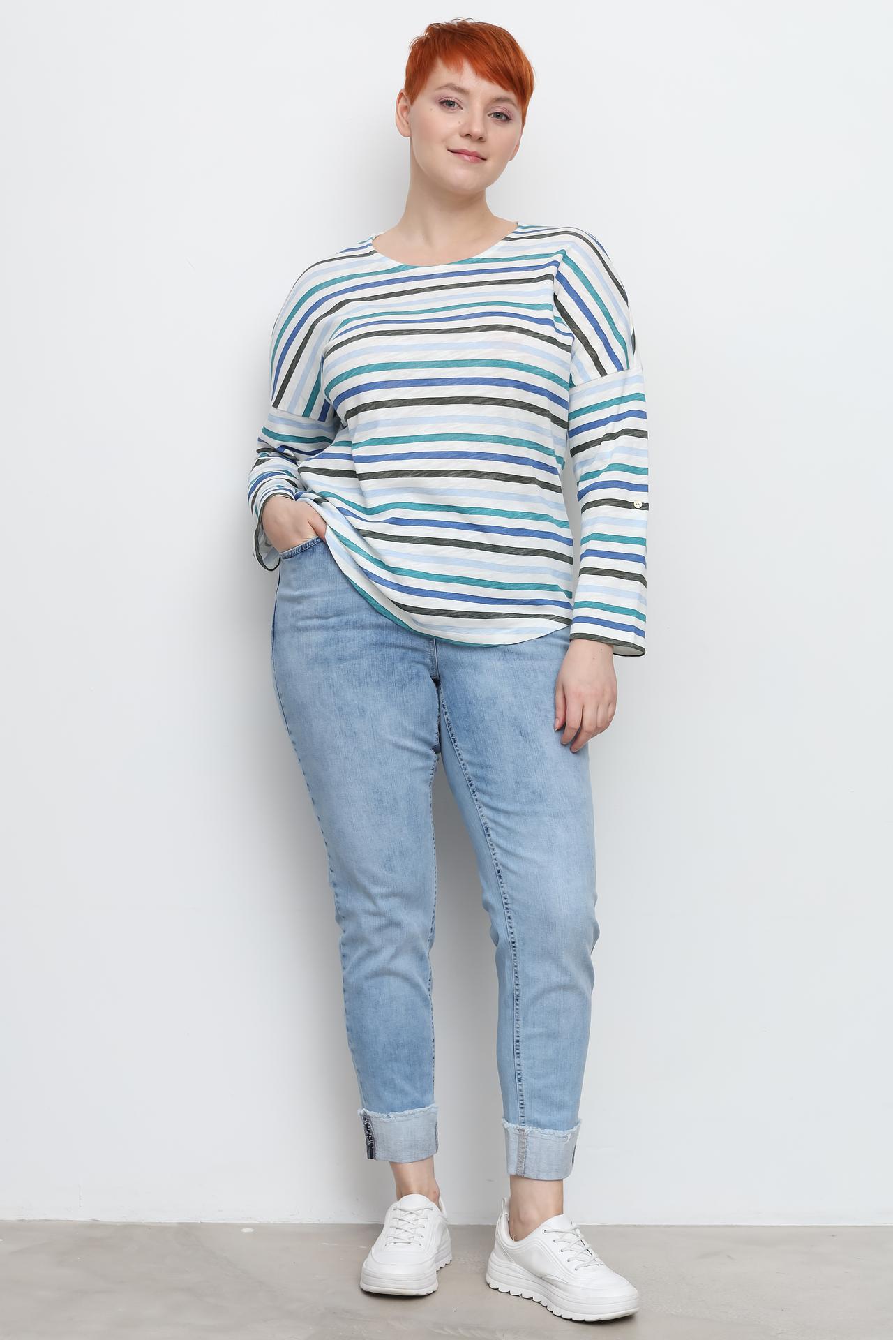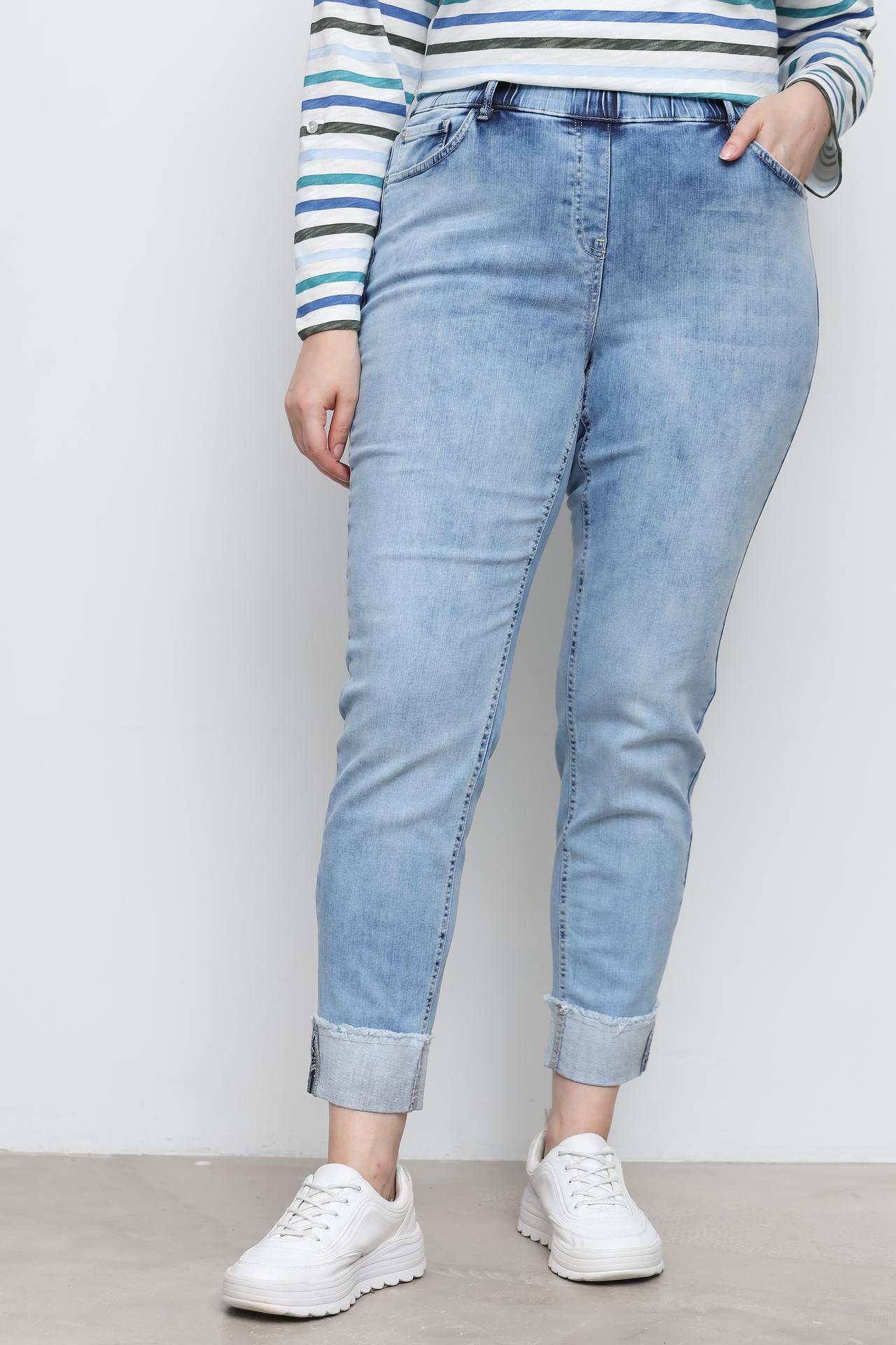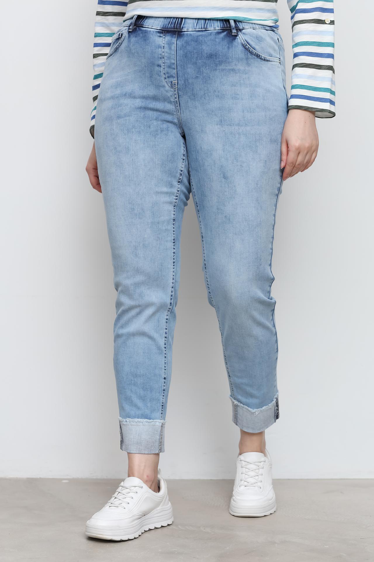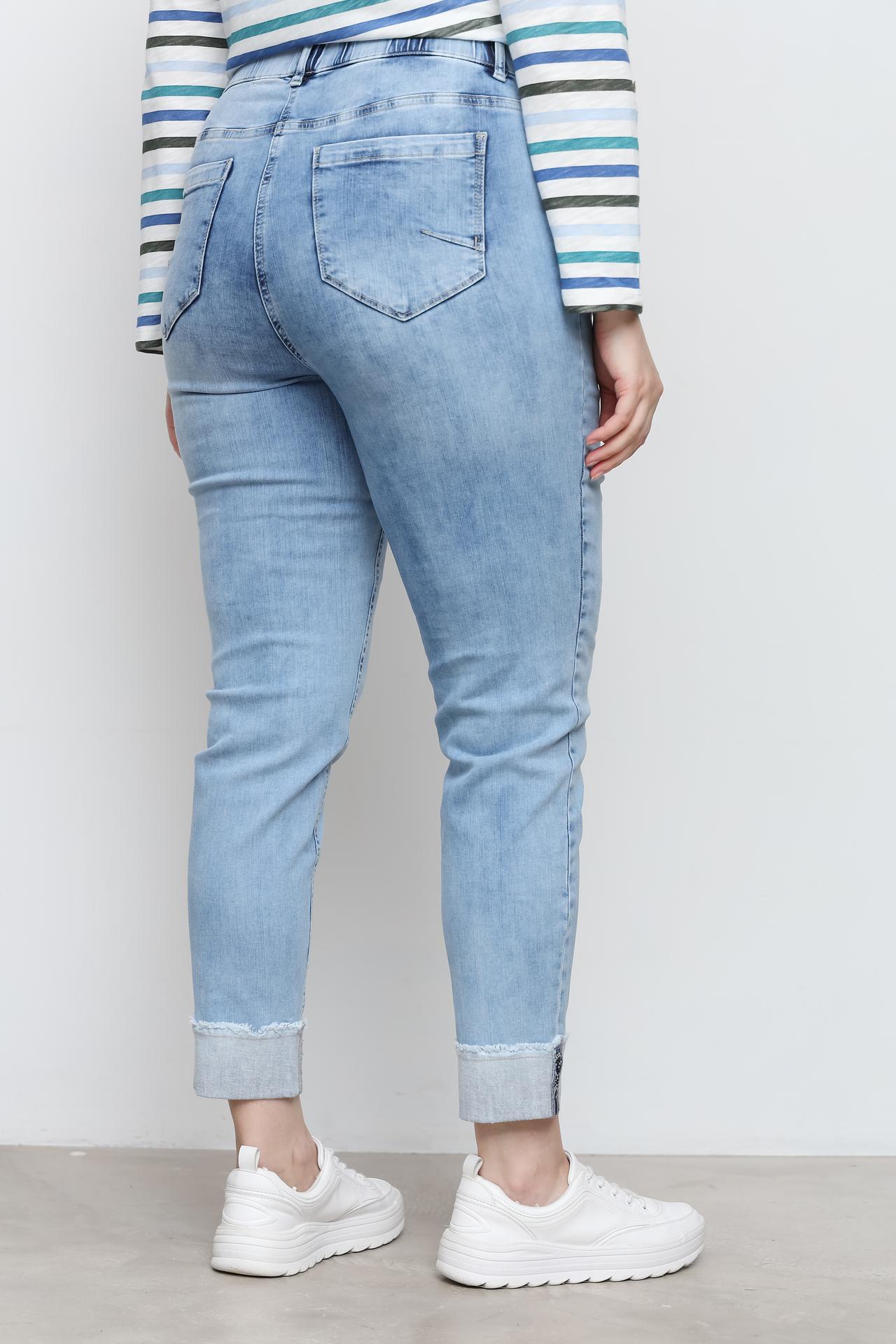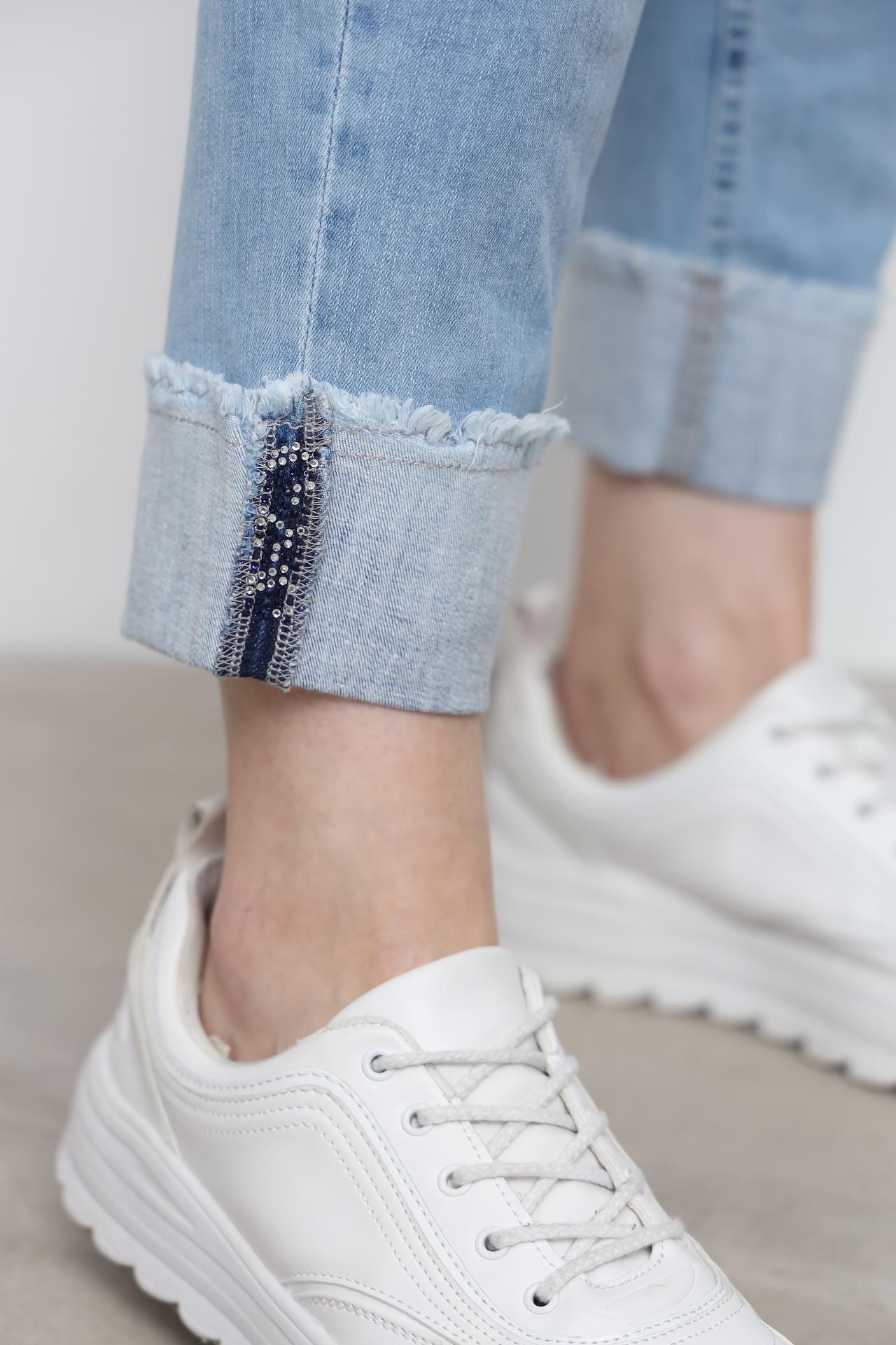 Джинсы имеют светло-голубой оттенок с эффектом легкой потертости, что придает им модный и актуальный вид. Они прекрасно сочетаются с различными видами верха, от простых футболок до элегантных блуз, создавая гармоничные и запоминающиеся комбинации. Подвернутые манжеты с декоративной отделкой из страз добавляют изысканности и индивидуальности, делая модель уникальной.
