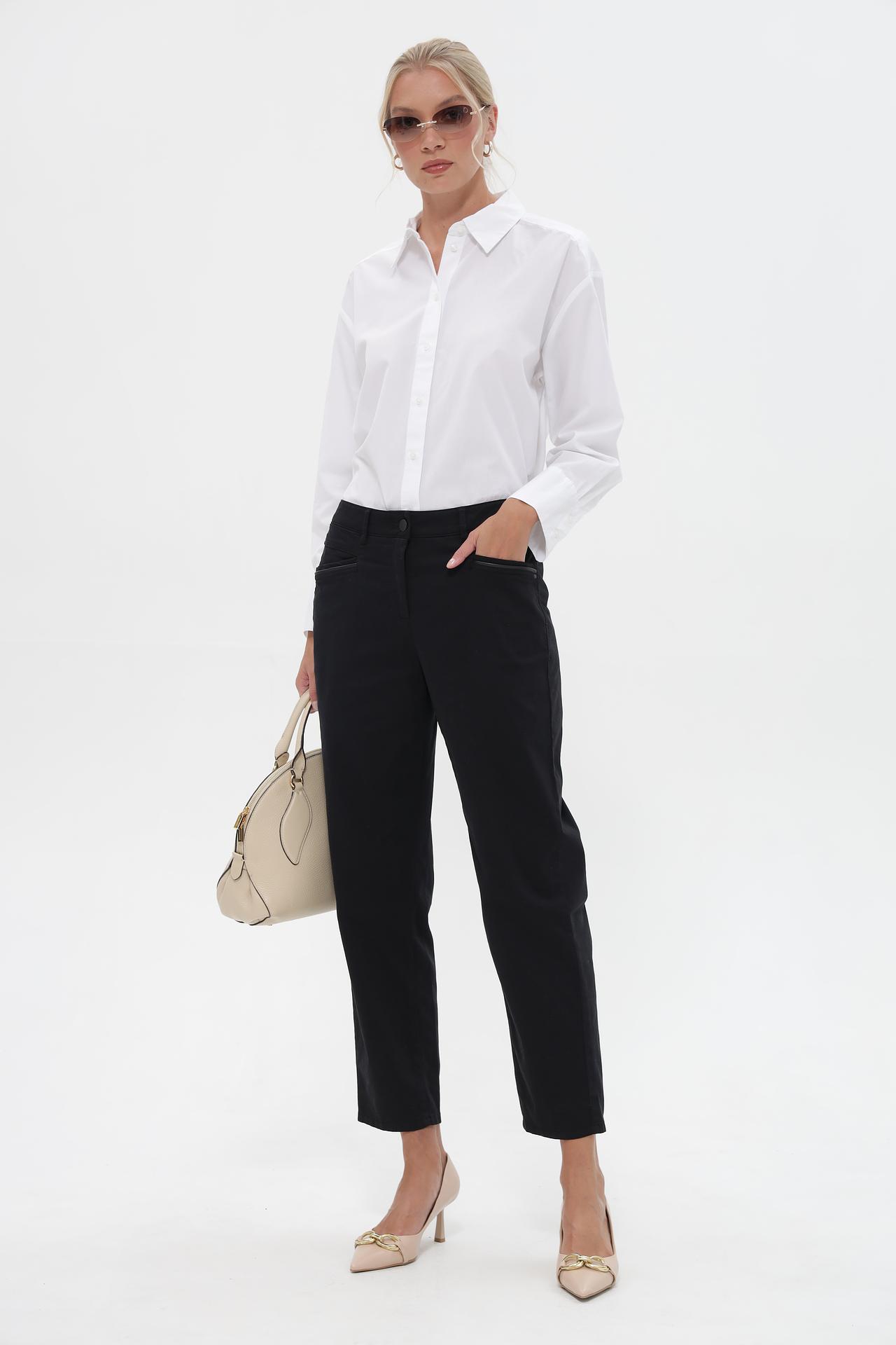 - Крой: Прямой крой с слегка зауженными к низу штанинами создает современный силуэт, который визуально стройнит и подходит к различным типам фигур.