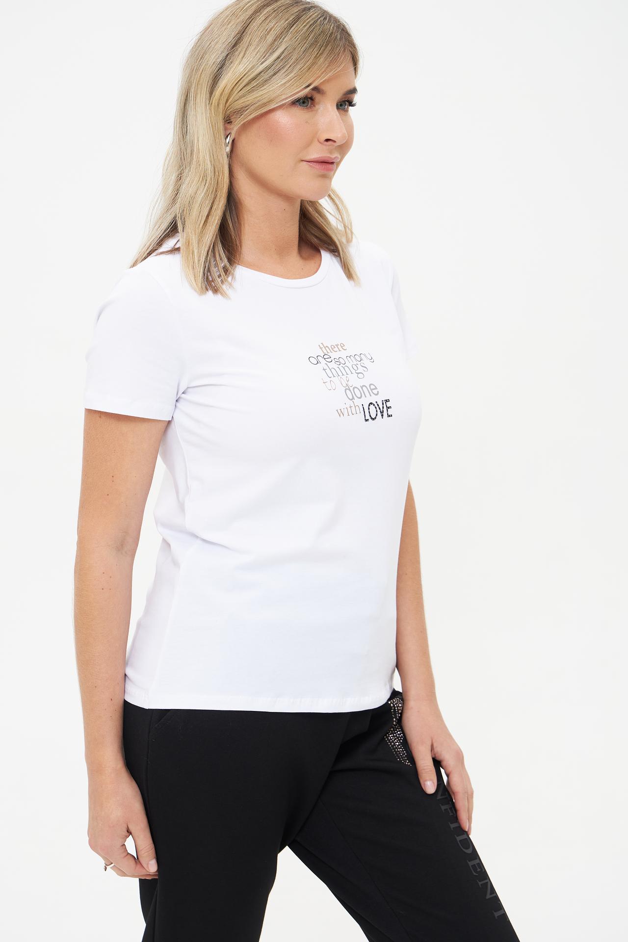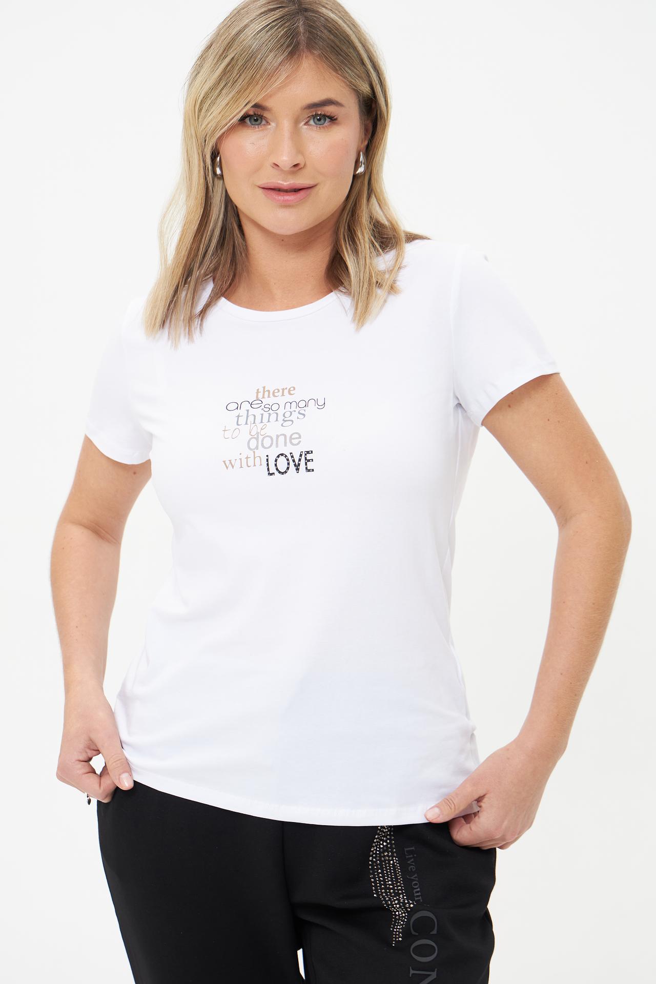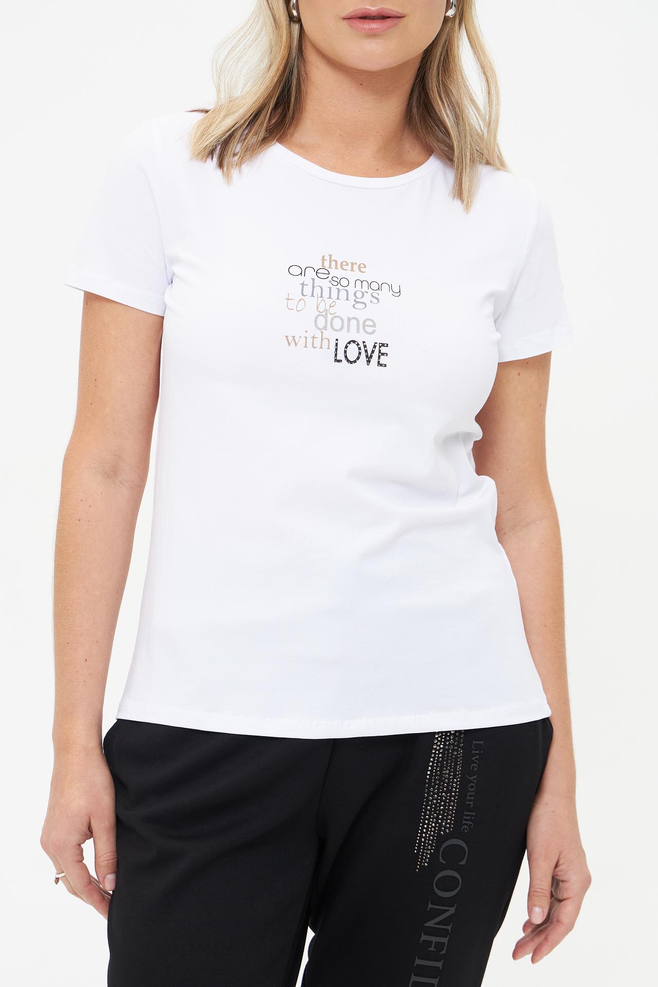 Элегантная белая футболка от MORE and MORE – идеальное дополнение к вашему гардеробу. Выполнена из мягкого и приятного к телу материала, обеспечивающего комфорт в течение всего дня. Лаконичный дизайн с оригинальной надписью добавляет образу изюминку и позволяет легко сочетать её с различными элементами одежды, создавая стильные и актуальные образы. Прекрасно подойдет для повседневной носки и для особых случаев.
