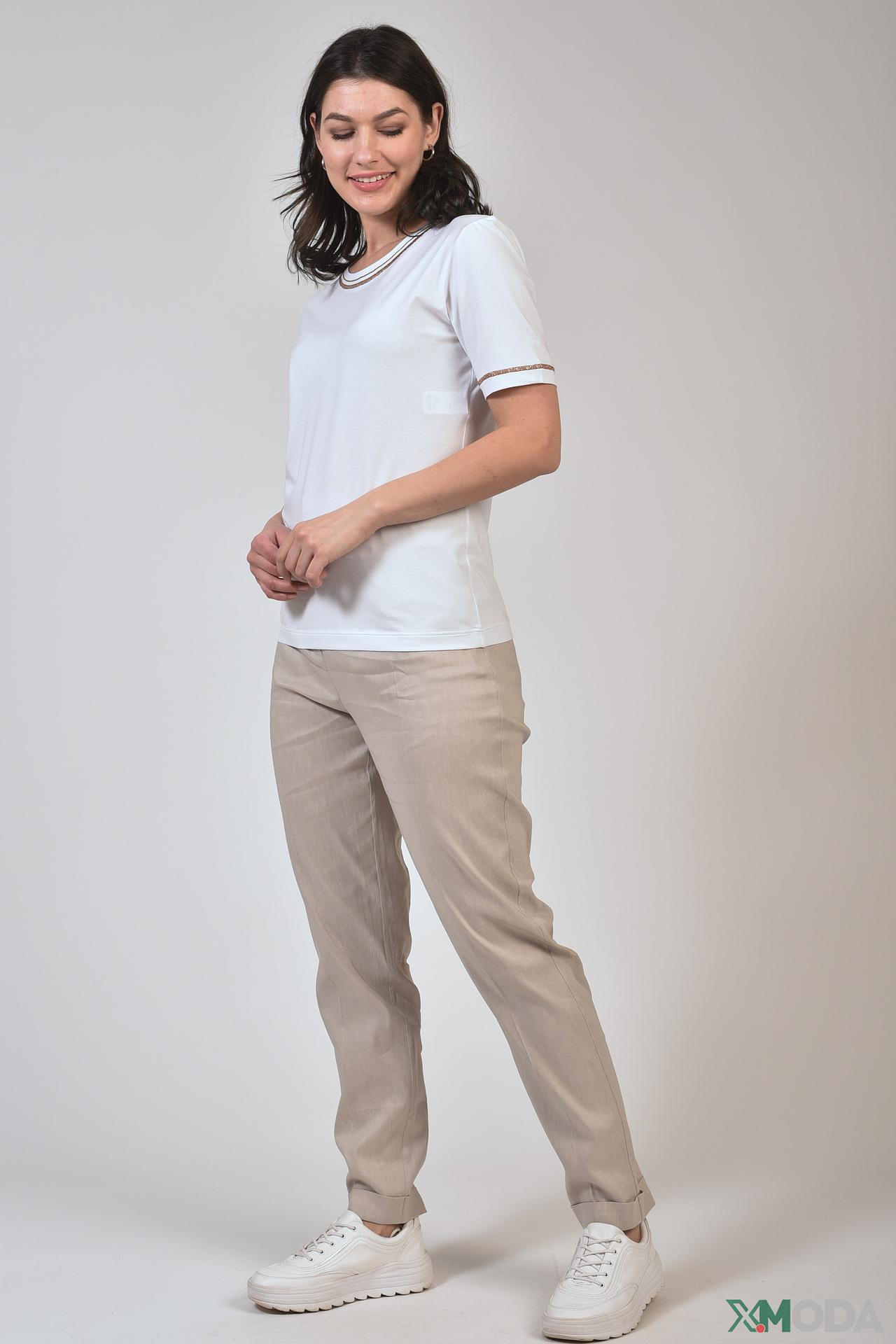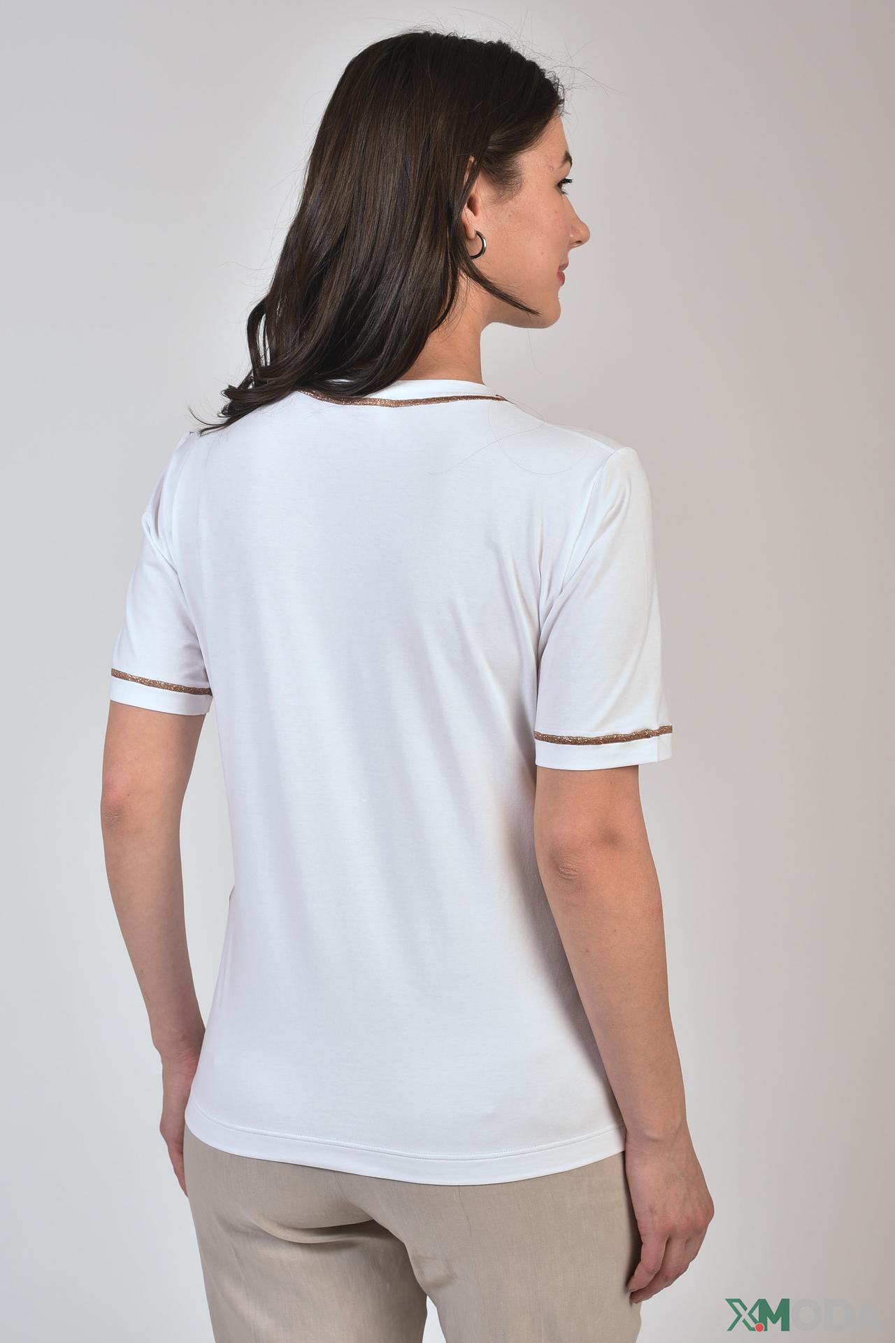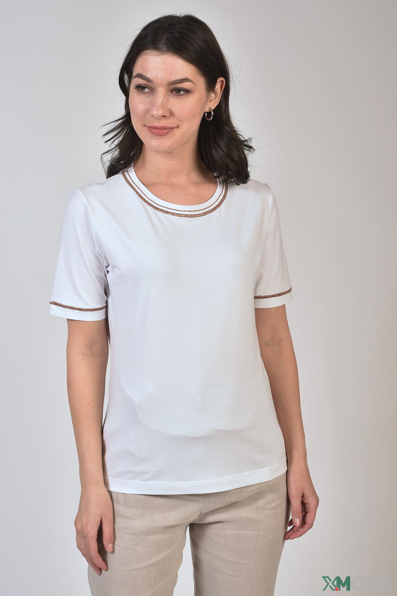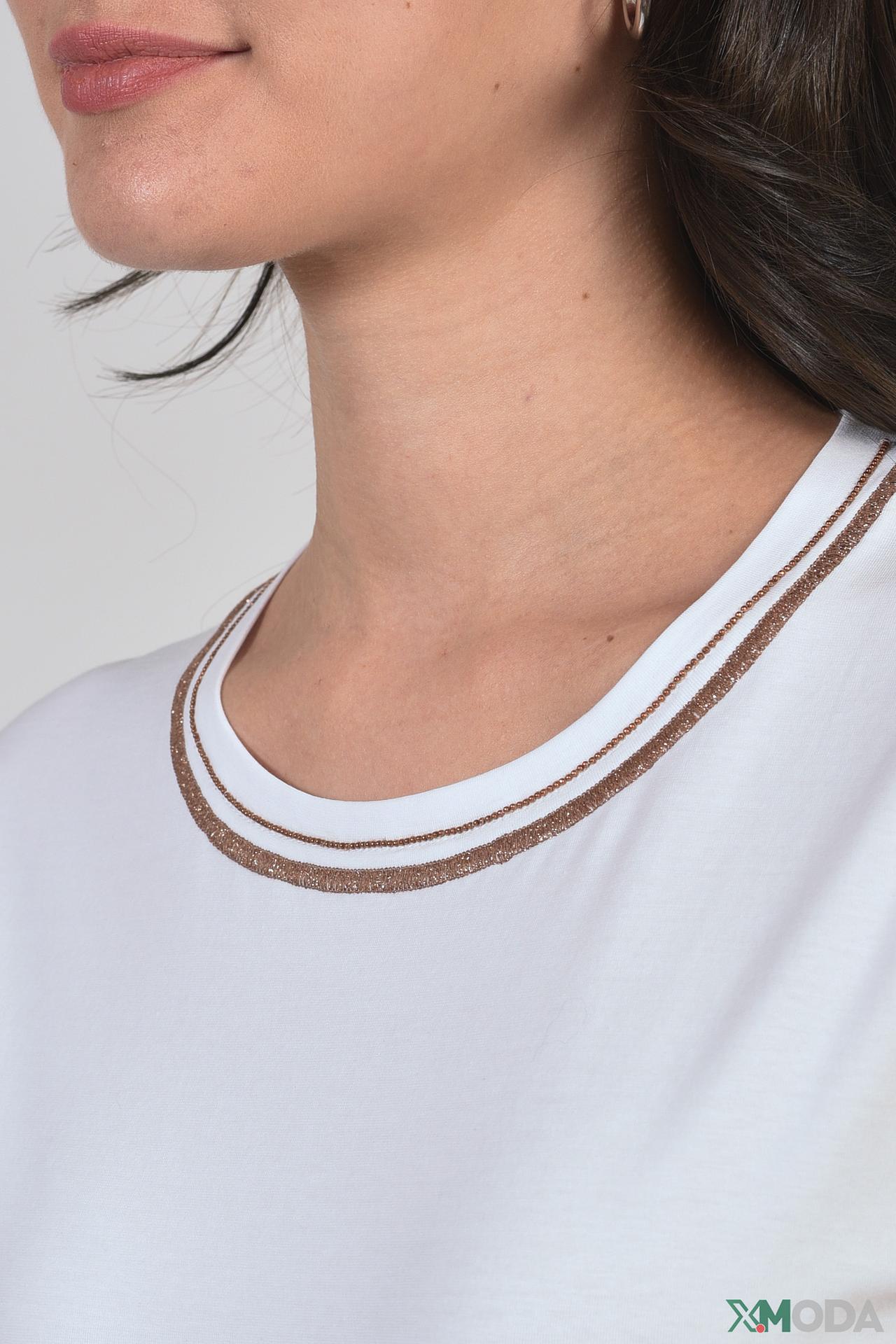 - Элегантный дизайн: Белая футболка с классическим кроем и изящной отделкой в виде металлизированных полос на вороте и рукавах подчеркивает индивидуальность и придает образу завершенность. Это идеальная базовая вещь в гардеробе.