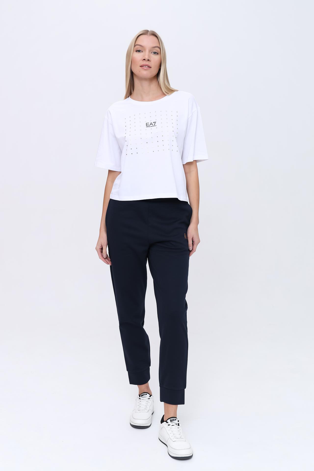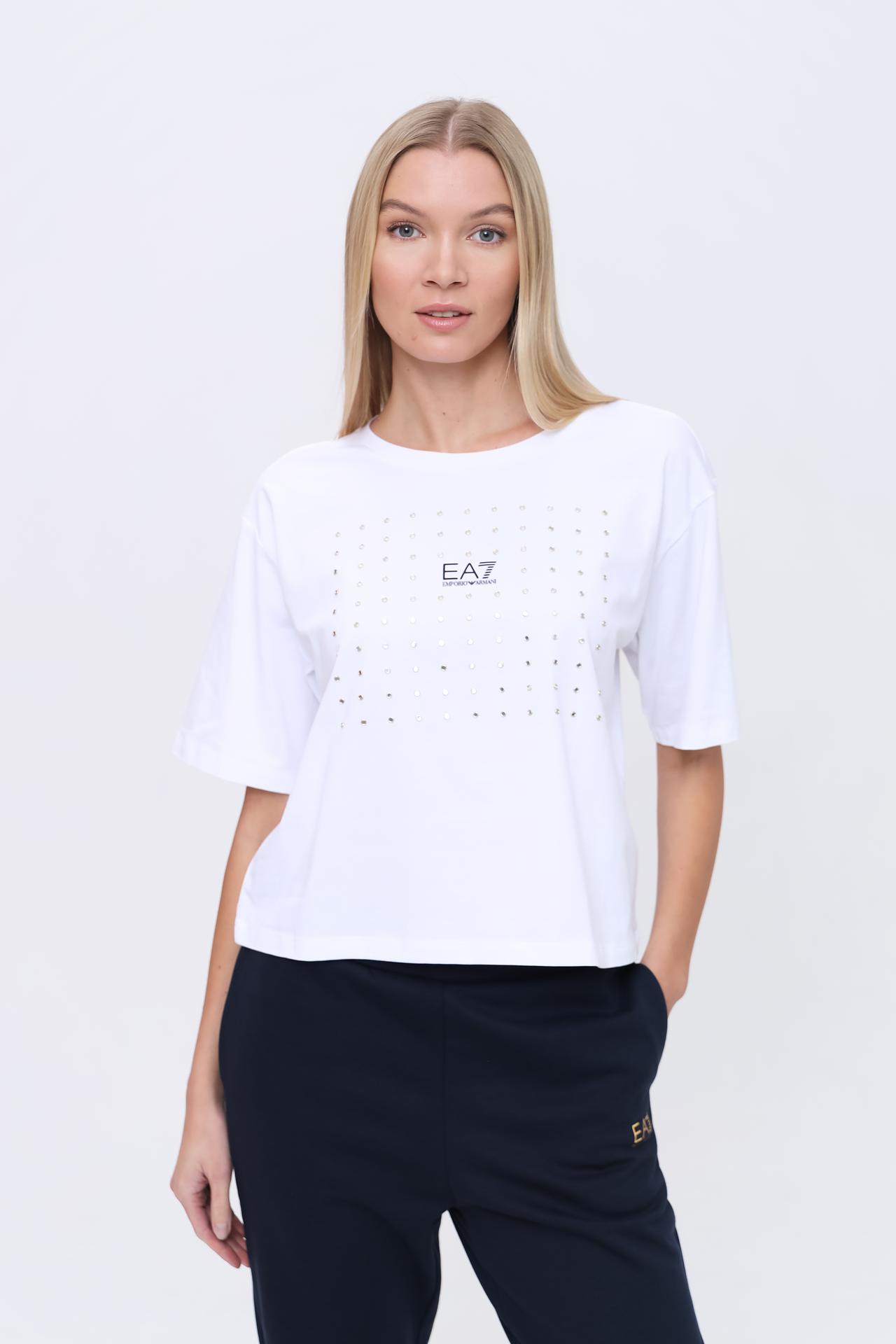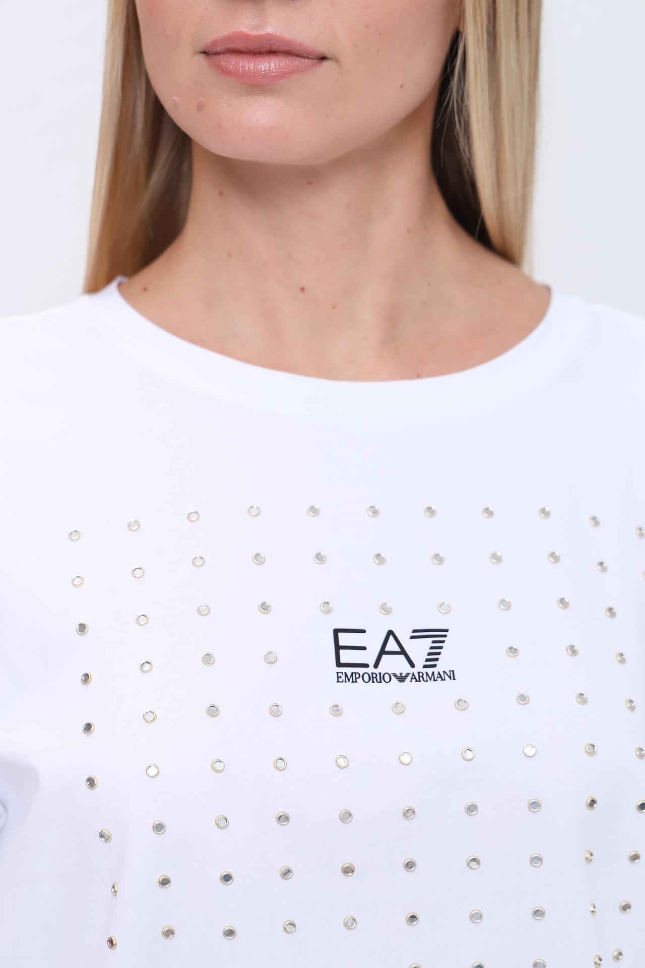 - Яркие акценты. Центральное место занимает фирменный черный логотип EA7, окруженный россыпью мелких металлических заклепок или страз. Этот декор придает изделию изысканный блеск и узнаваемость бренда, делая футболку EA7 заметной частью гардероба.