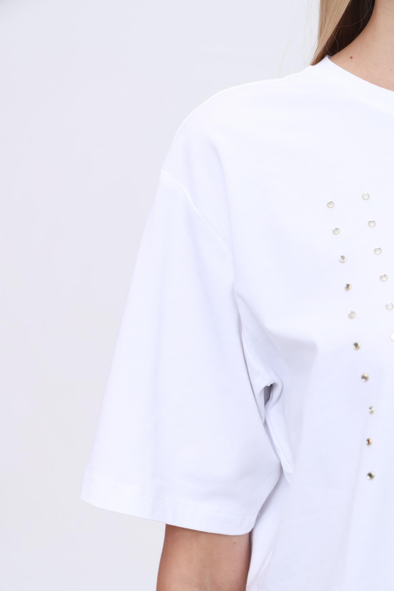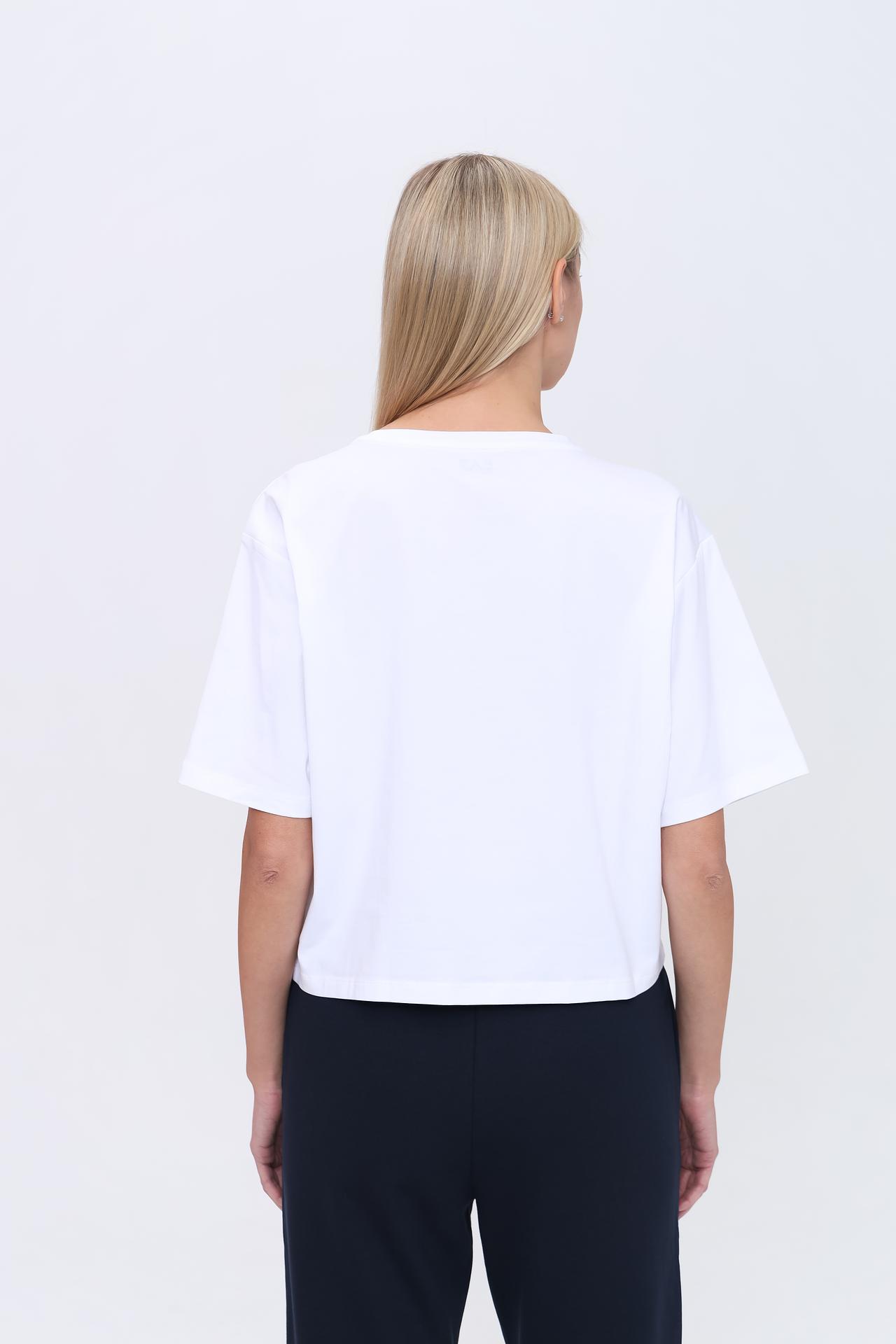 - Стильный дизайн. Футболка прямого кроя с укороченной длиной и спущенной линией плеча подчеркнет современный вкус. Лаконичный круглый вырез горловины и широкие короткие рукава создают расслабленный силуэт для женщин.