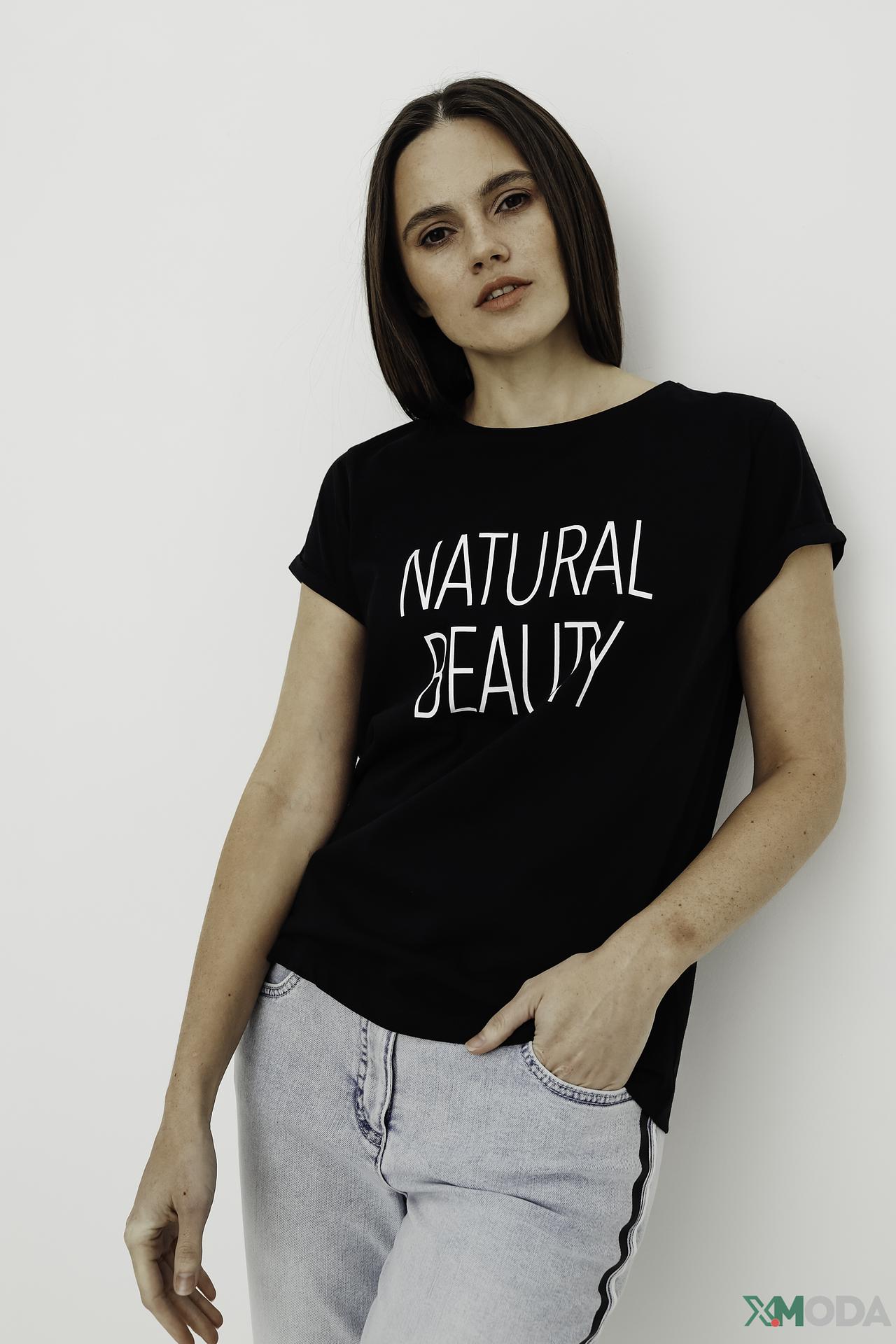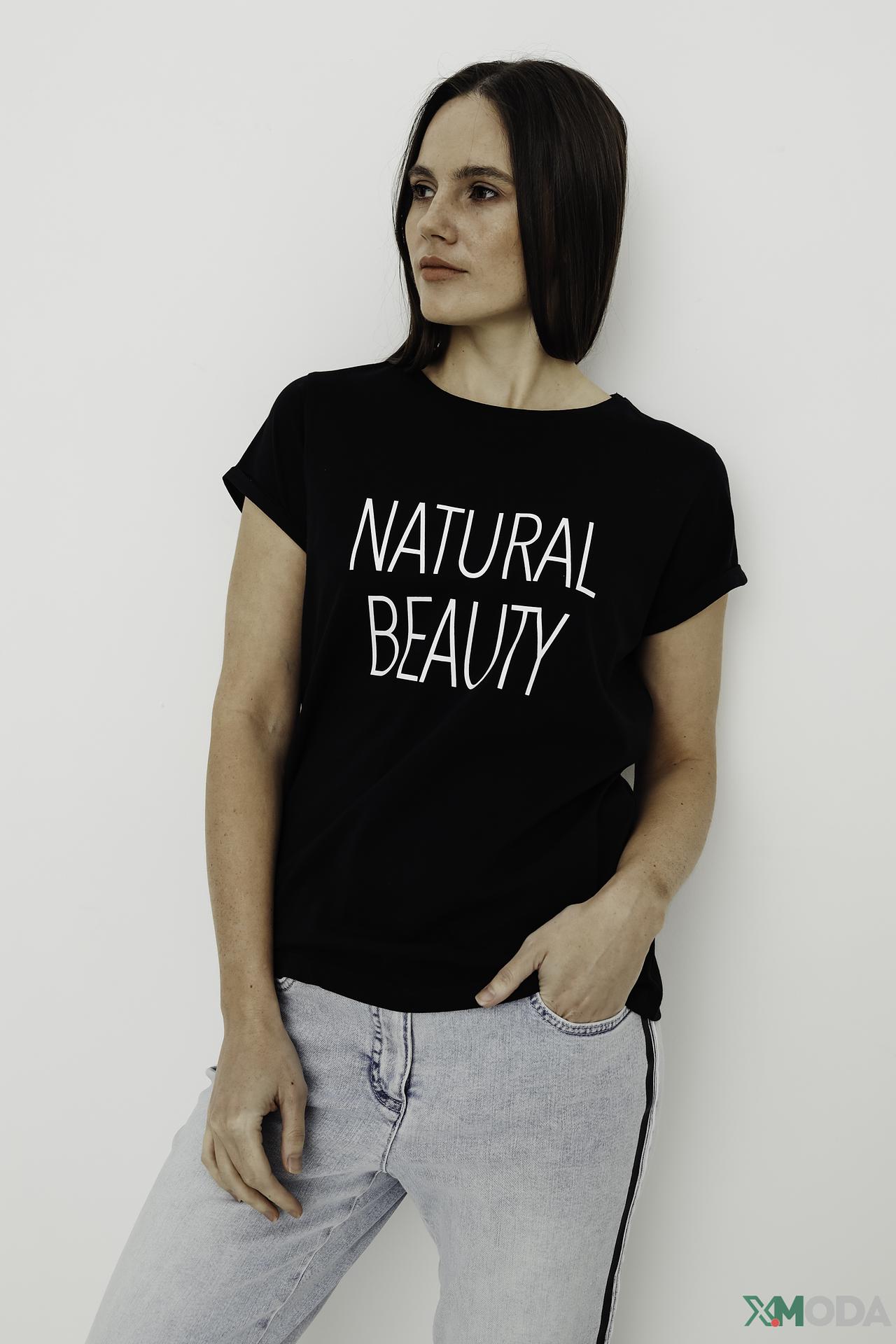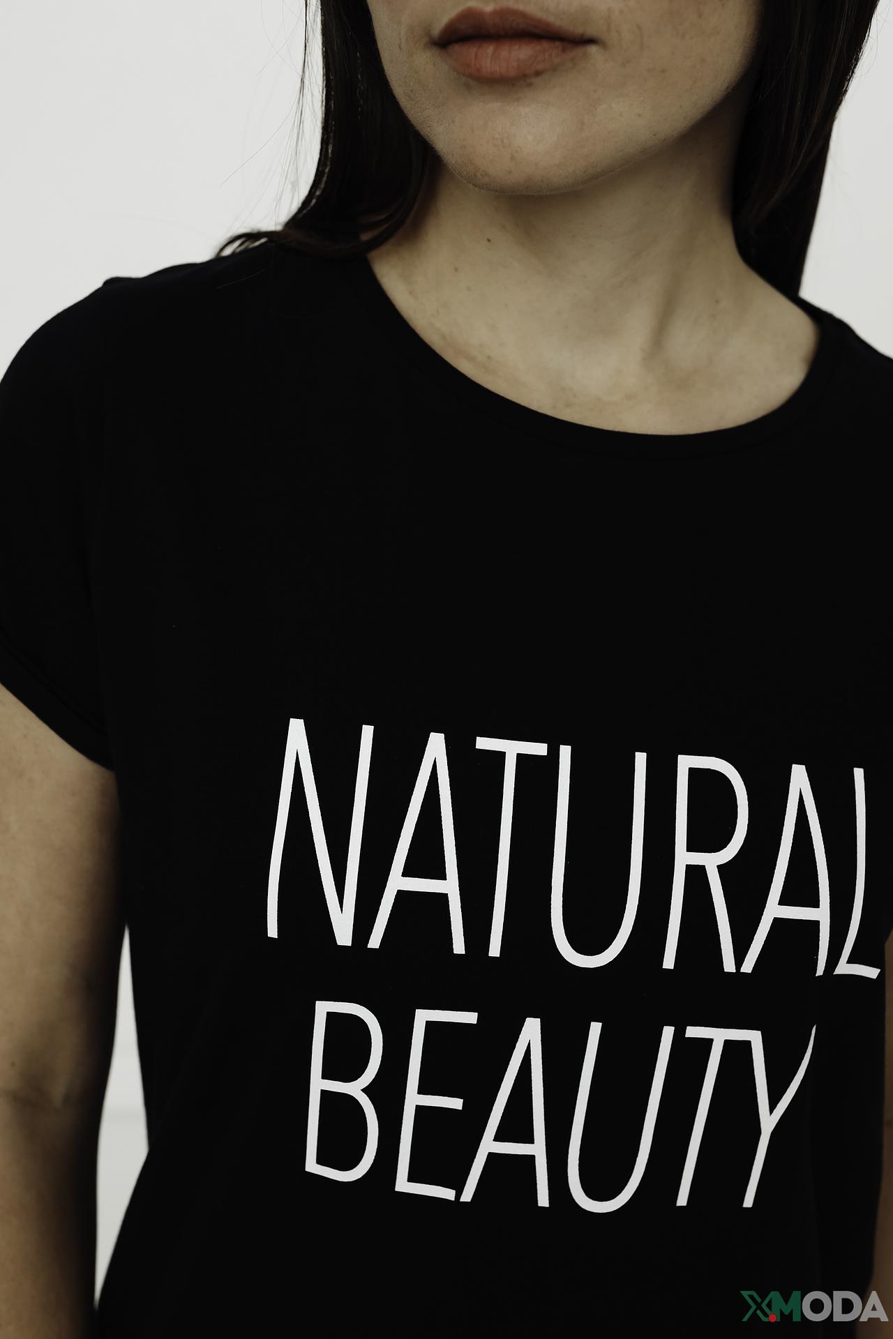 - Дизайн: Стильный принт "NATURAL BEAUTY" придает футболке выразительность и индивидуальность.