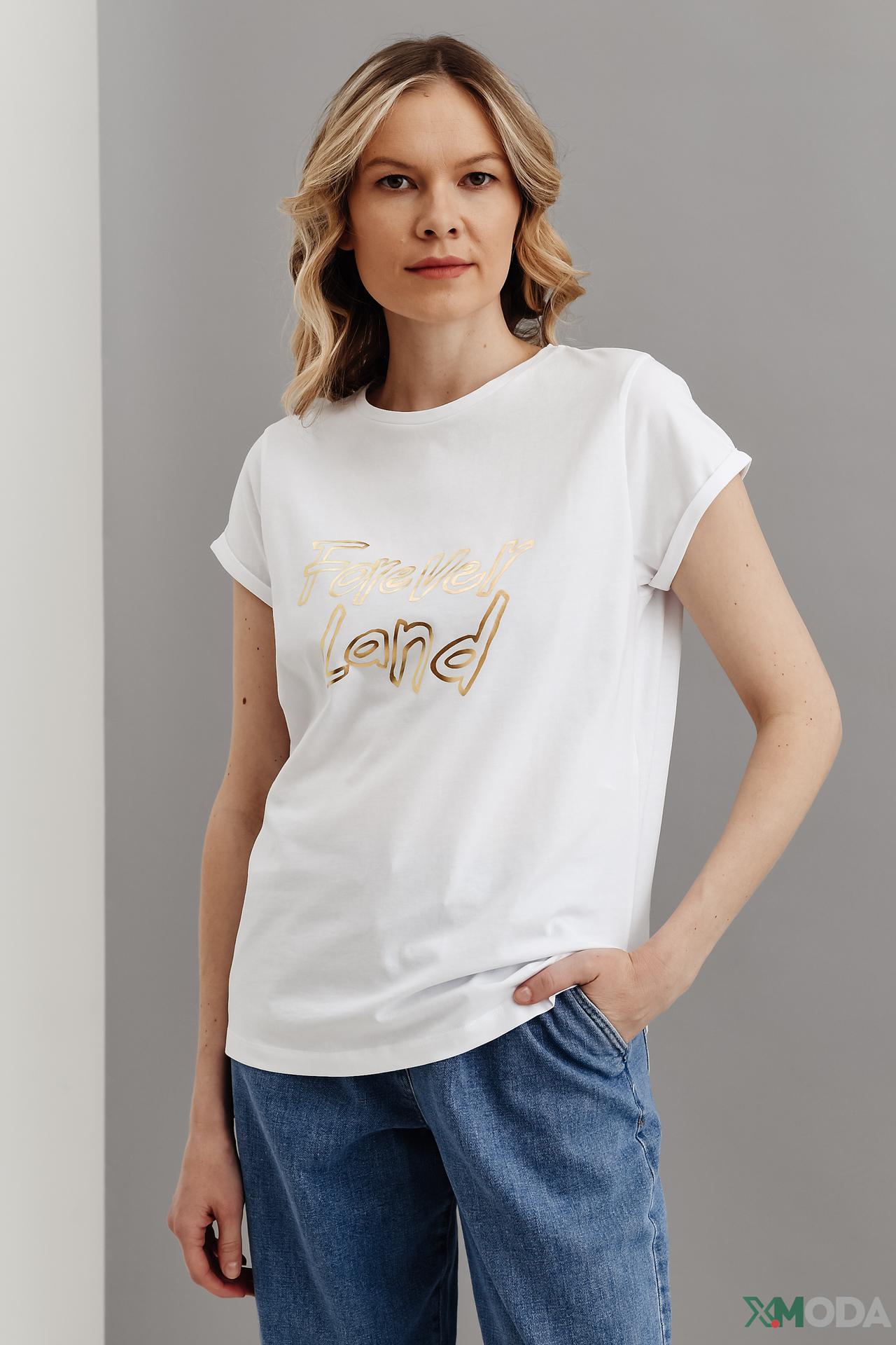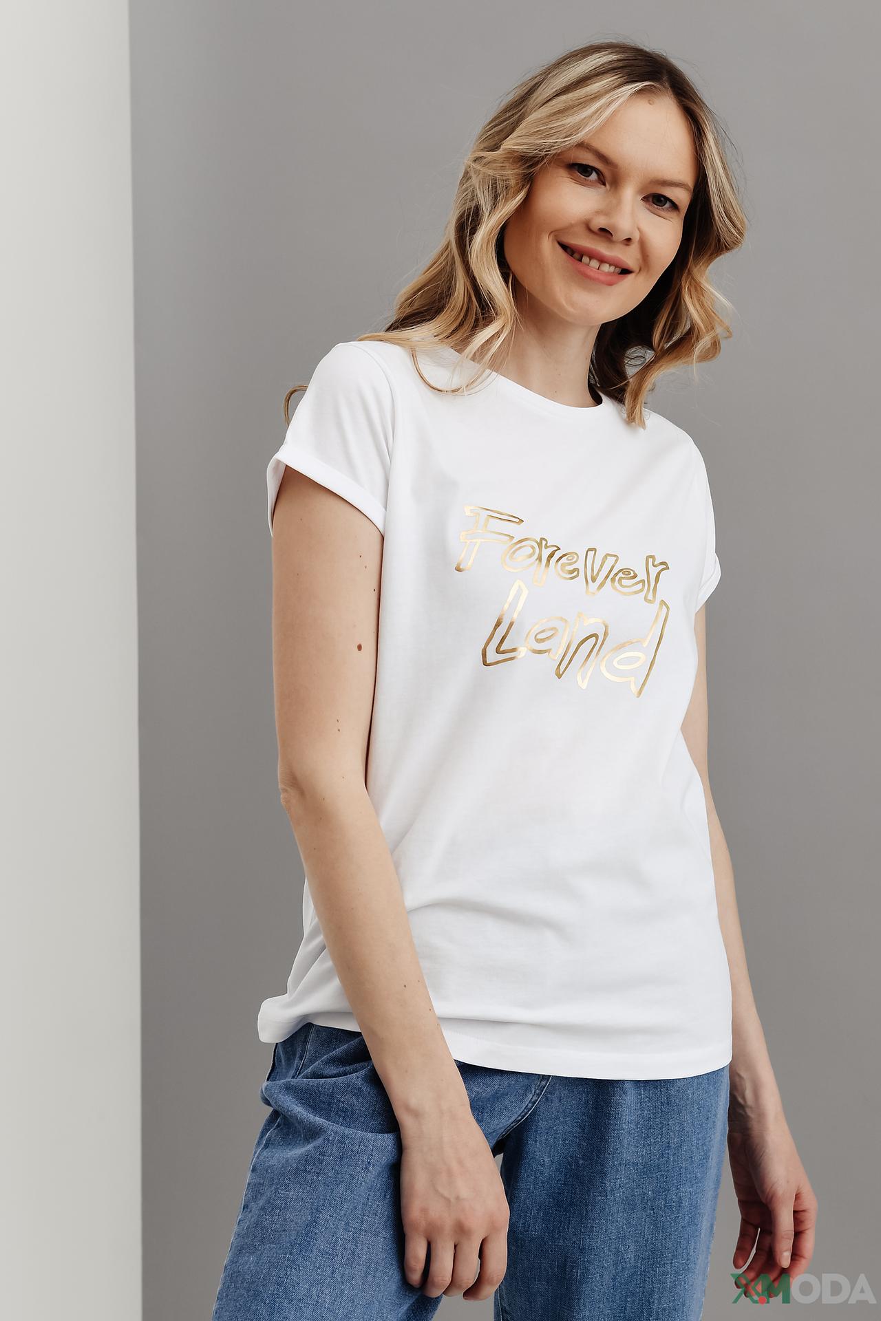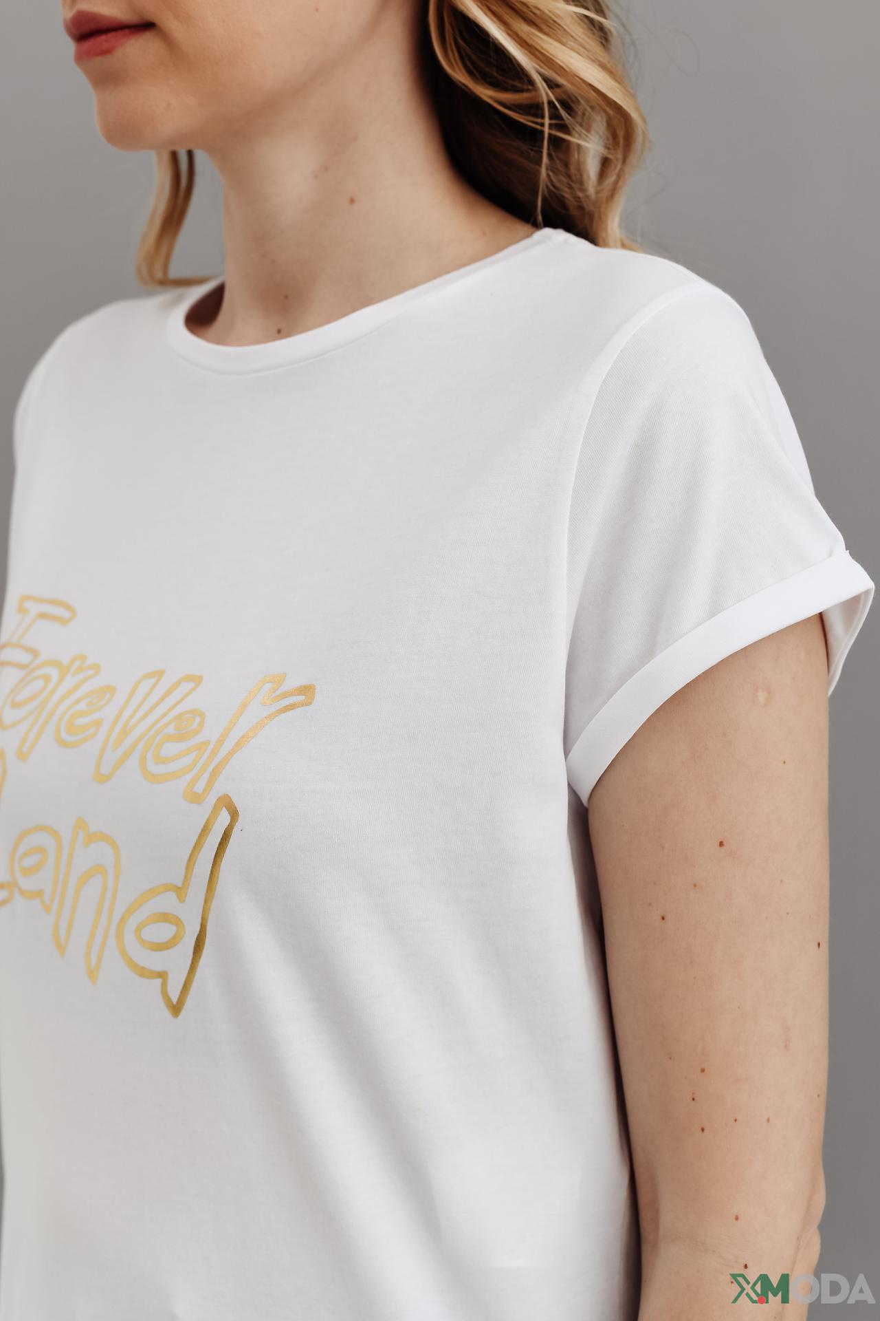 - Дизайн: Белая футболка с модным золотым принтом "Forever land" – это тренд сезона, который добавит изюминку вашему стилю.