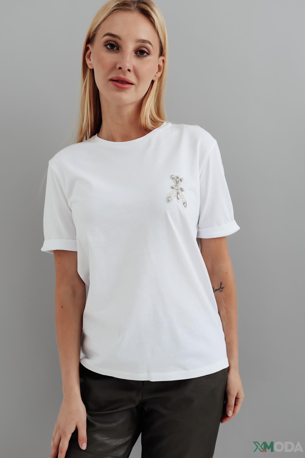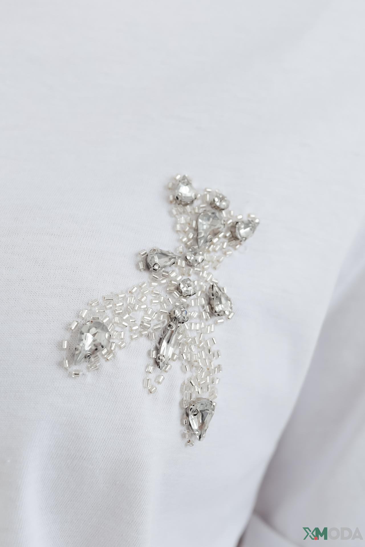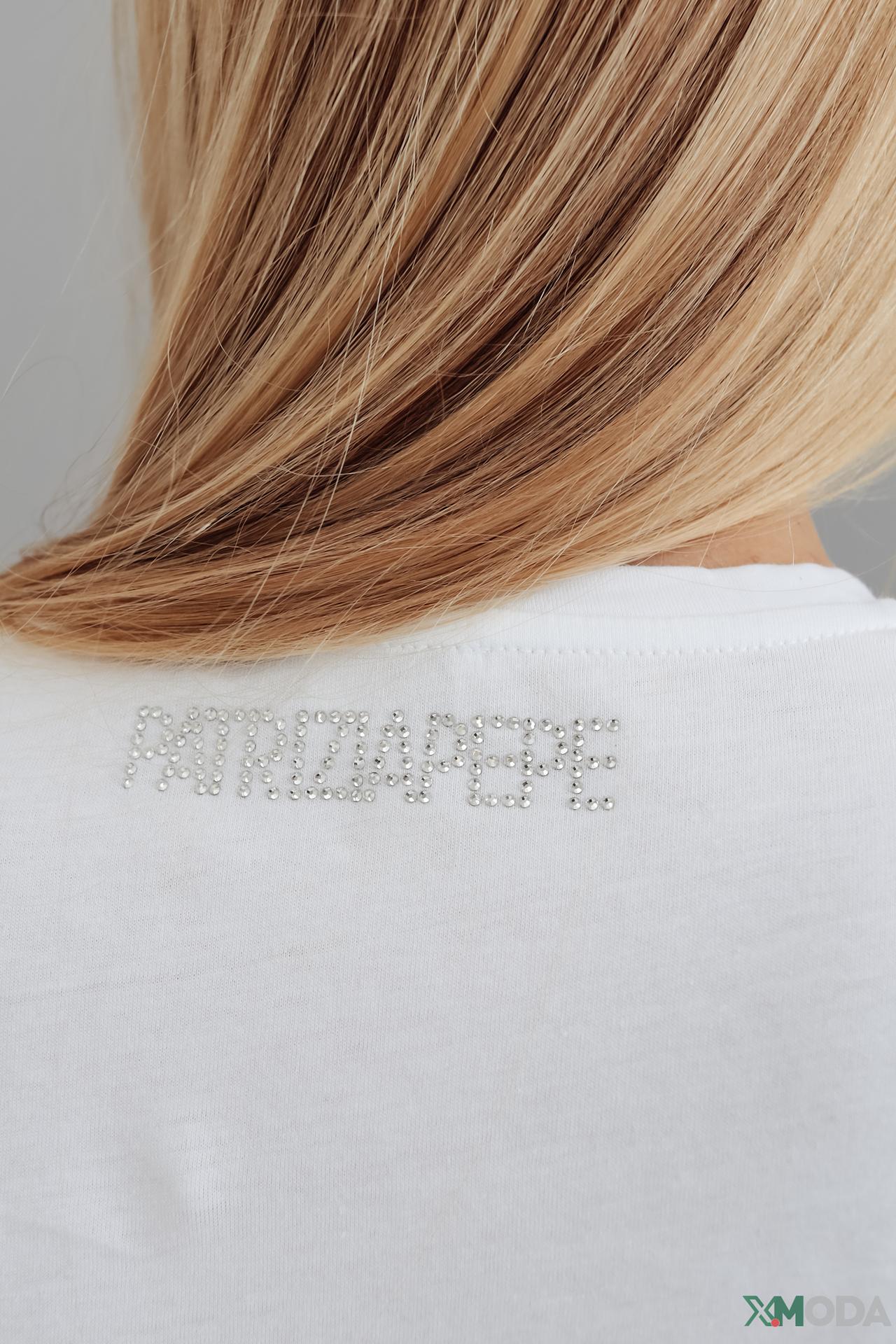 - Дизайн: Классический белый цвет и прямой силуэт делают эту футболку универсальной. Оригинальный декор в виде страз и бусин на груди и логотип на спине добавляют модели эксклюзивности.