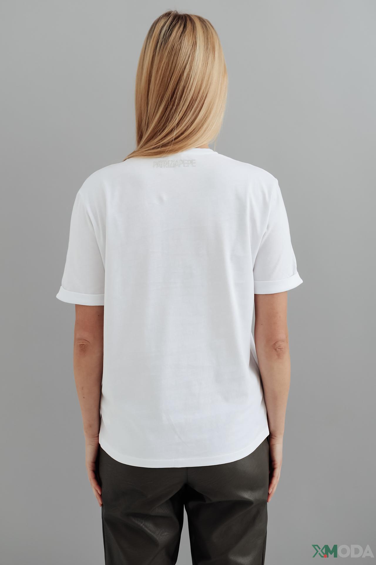 Базовая белая футболка от Patrizia Pepe – незаменимый элемент гардероба, который добавит изысканности повседневному образу. Модель прямого кроя с короткими рукавами и округлым вырезом горловины выполнена из высококачественного 100% хлопка, что гарантирует комфорт в течение всего дня. Оригинальное украшение в виде изящного узора из страз и бусин на груди придает футболке особый шарм и делает ее актуальной для создания как расслабленных, так и более нарядных луков. На спине расположен логотип бренда, выполненный из мелких страз.