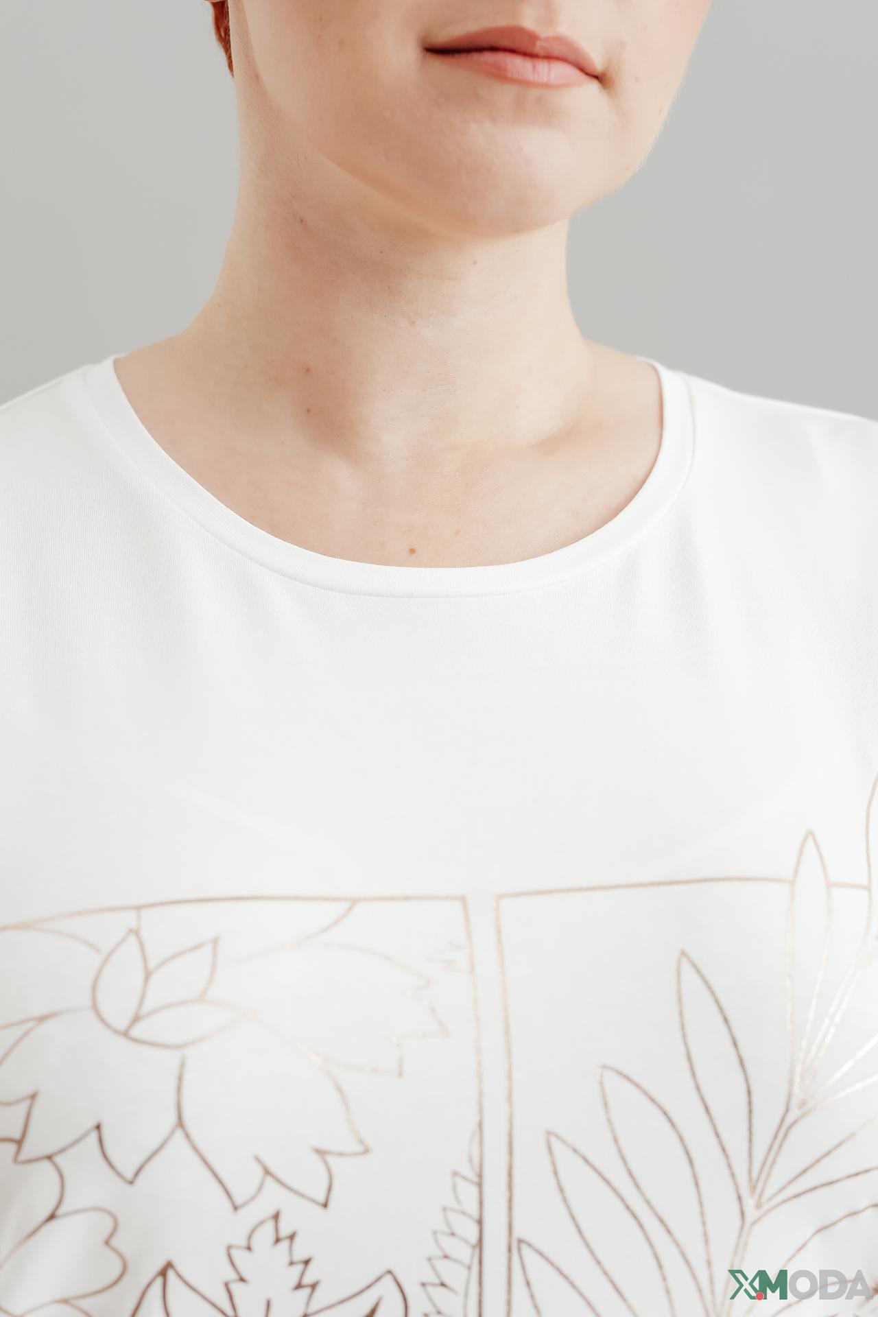 - Элегантный и современный дизайн. Круглый вырез горловины и стандартные короткие рукава создают универсальный силуэт, подходящий для различных типов фигур. Принт, выполненный в спокойных тонах, легко сочетается с базовыми элементами гардероба.