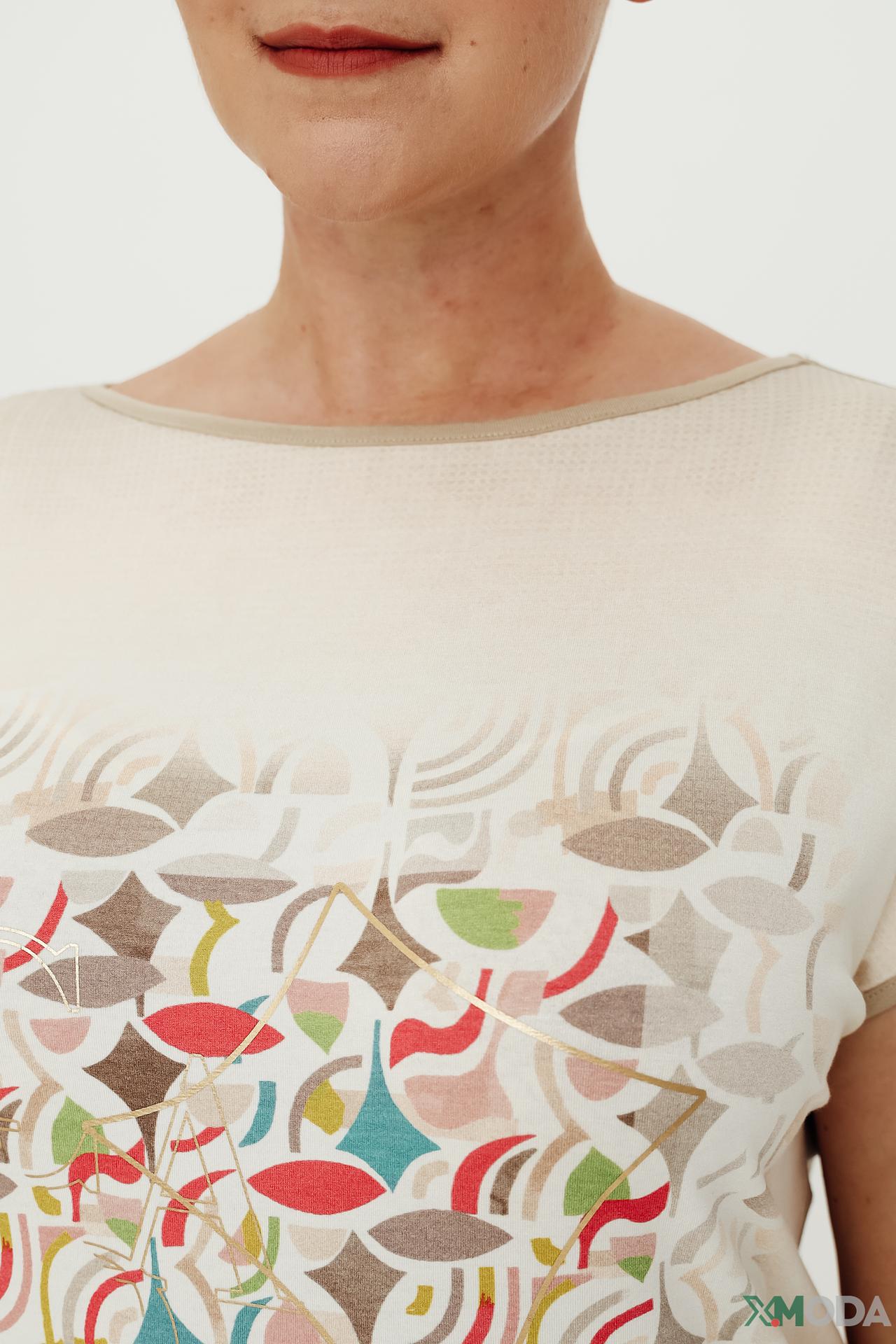 - Стильный дизайн. Модель выполнена в нежном бежевом оттенке с широким вырезом-лодочкой и короткими рукавами. Передняя часть украшена эксклюзивным геометрическим принтом в ярких тонах, который добавляет уникальности. Боковые завязки позволяют регулировать посадку по низу изделия.