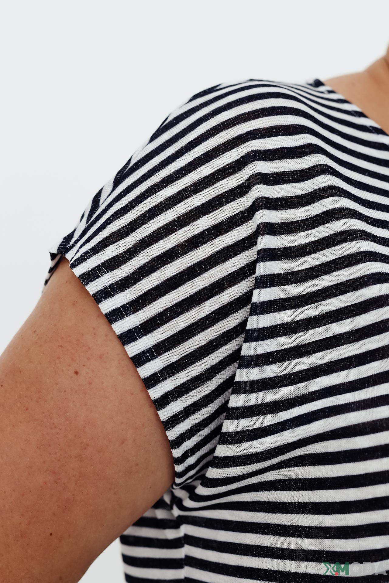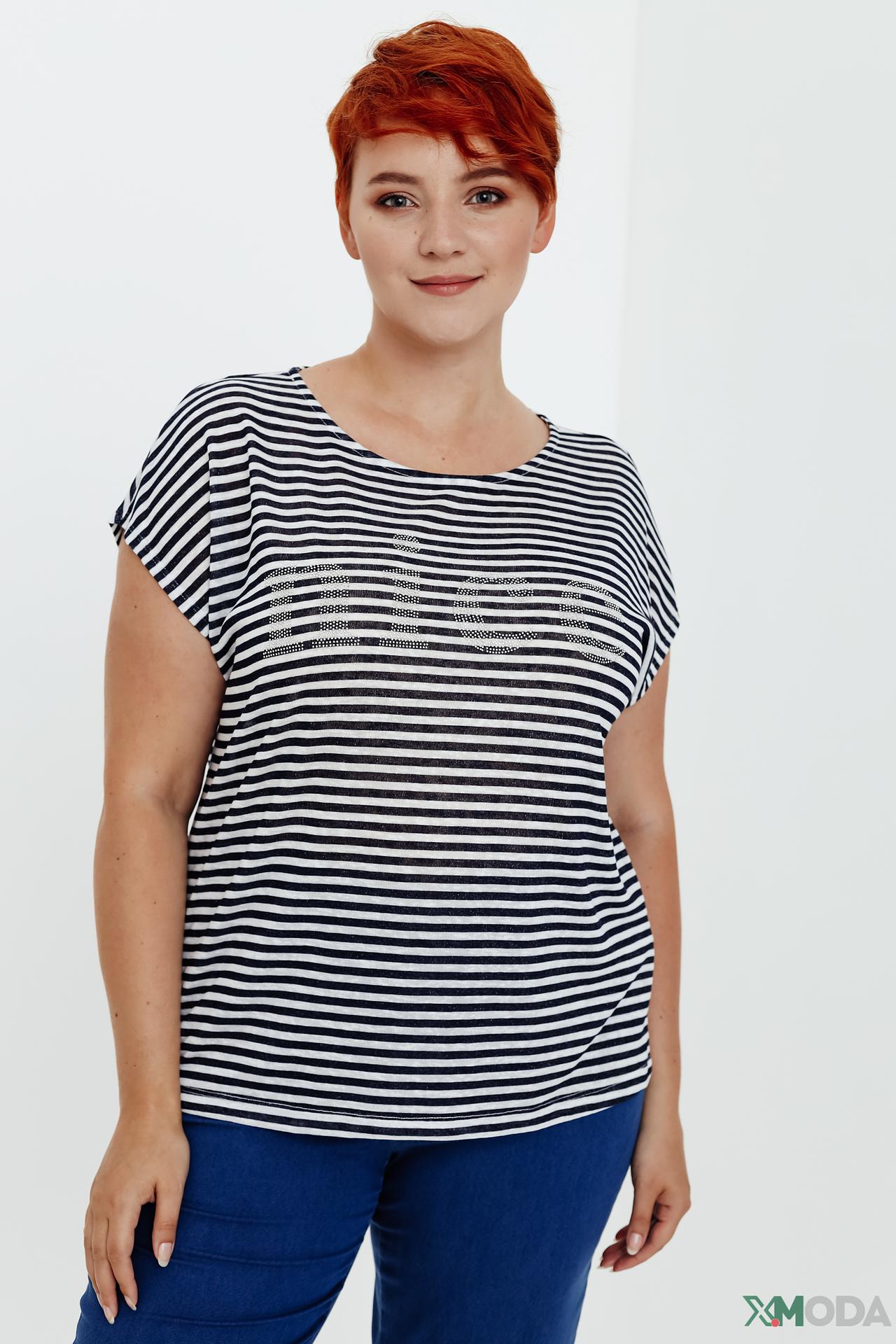 Особое очарование модели придает декоративная надпись из страз, добавляющая образу нотку гламура и женственности. Полосатый принт – это классика, которая всегда в моде. Футболка отлично сочетается с джинсами, юбками или шортами, позволяя создавать разнообразные образы для любого случая.