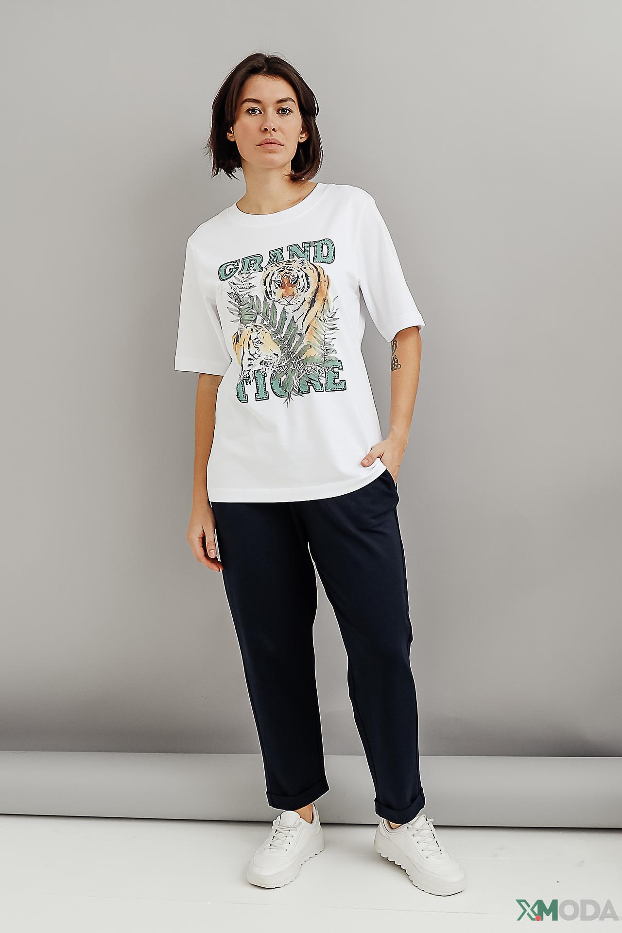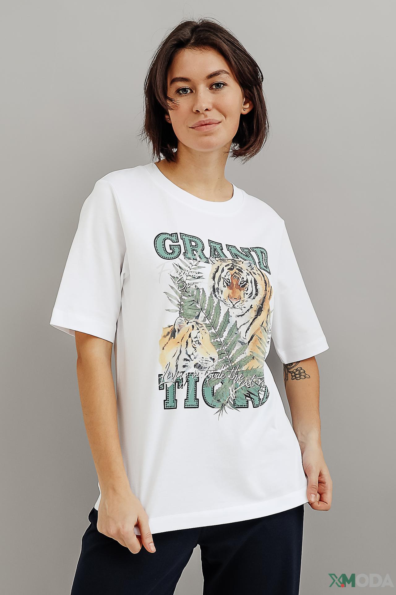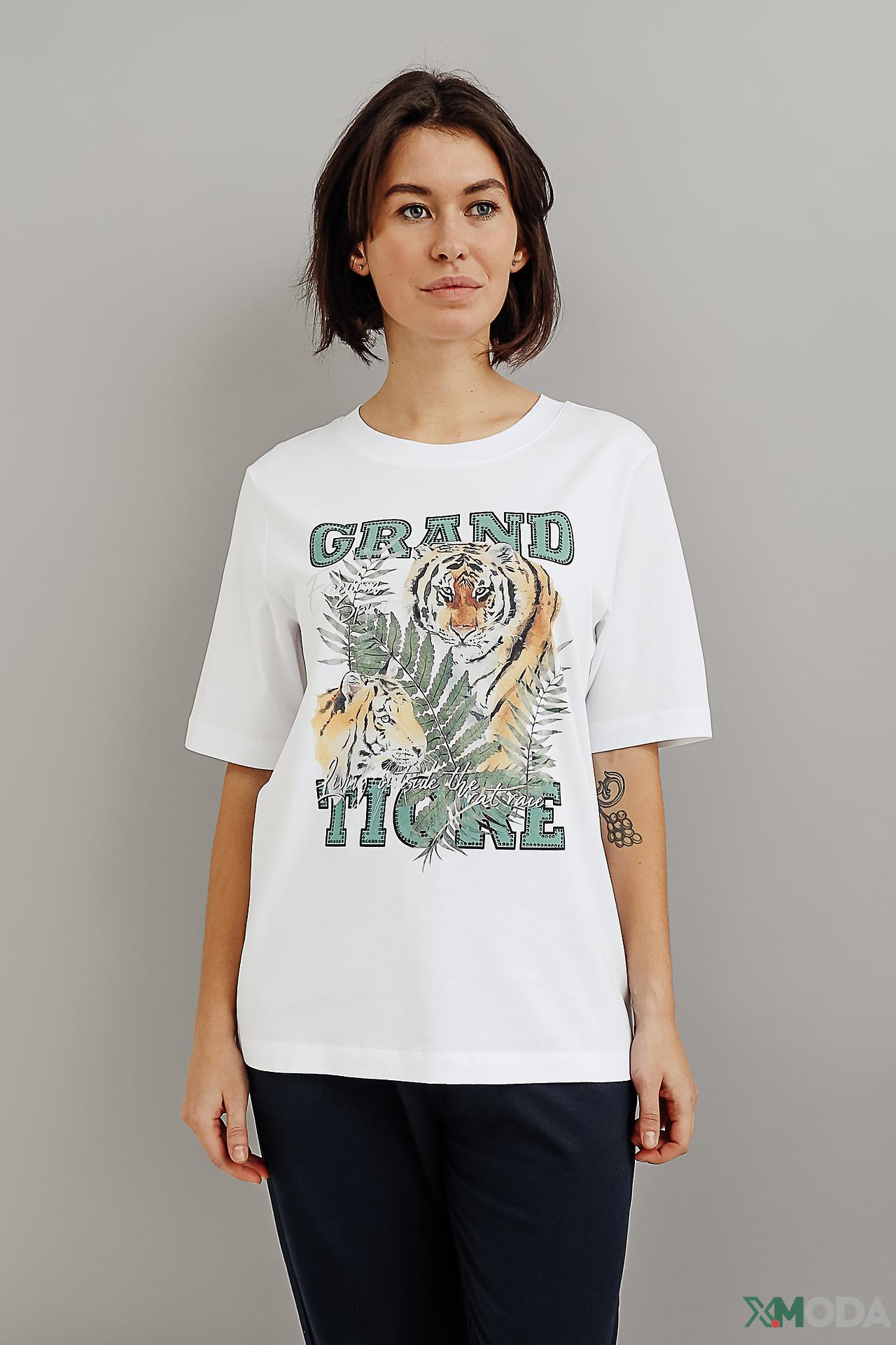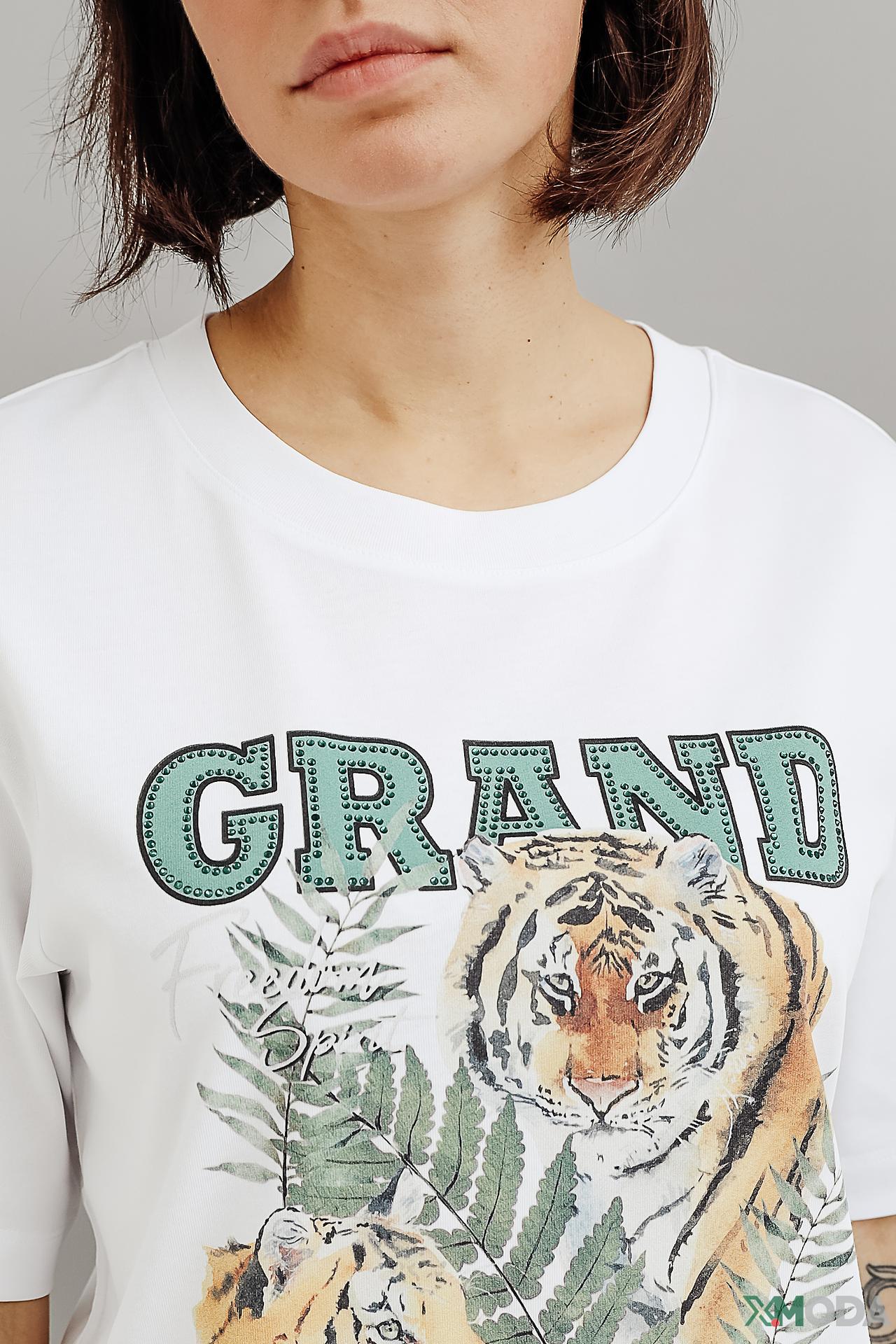 Центральным элементом дизайна является яркий принт с изображением величественных тигров среди тропических листьев и надписью "GRAND TIGRE", который придает изделию индивидуальность и акцент. Уникальный графический рисунок делает эту футболку стильной и заметной, выделяя ее среди других базовых моделей.