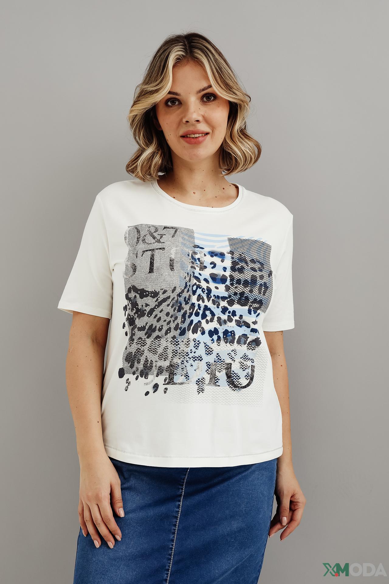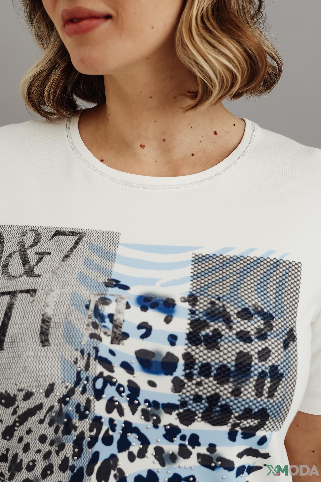 - Оригинальный принт: Центральный принт с анималистическим узором в сине-серых тонах, дополненный блестящими элементами, придает этой футболке уникальный и запоминающийся вид.