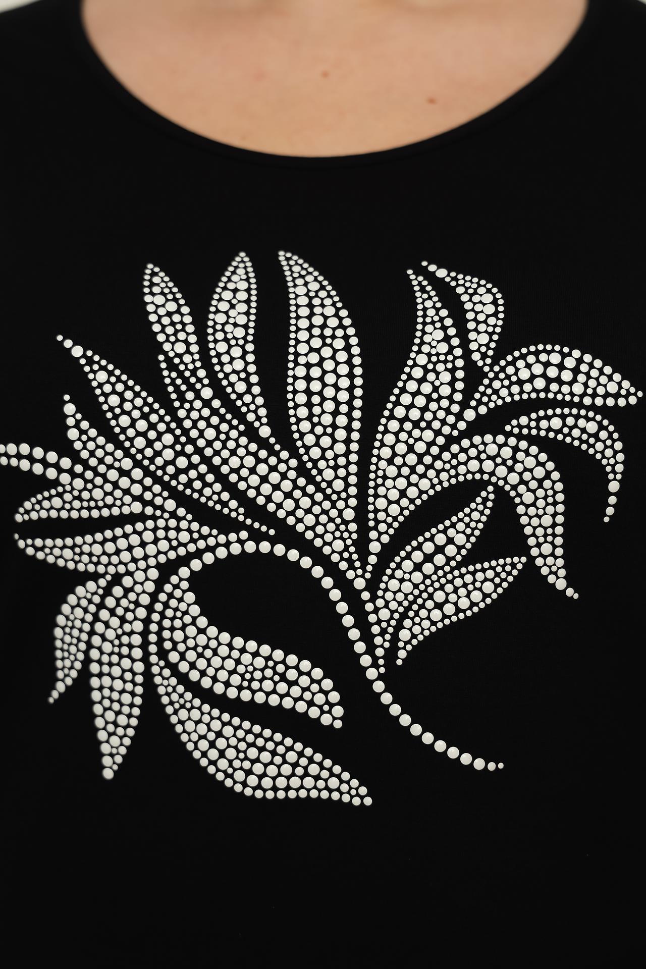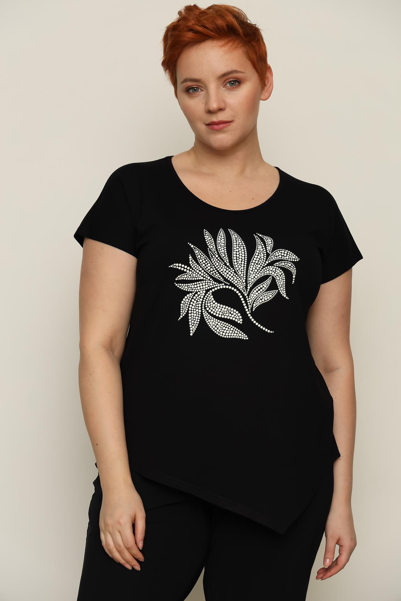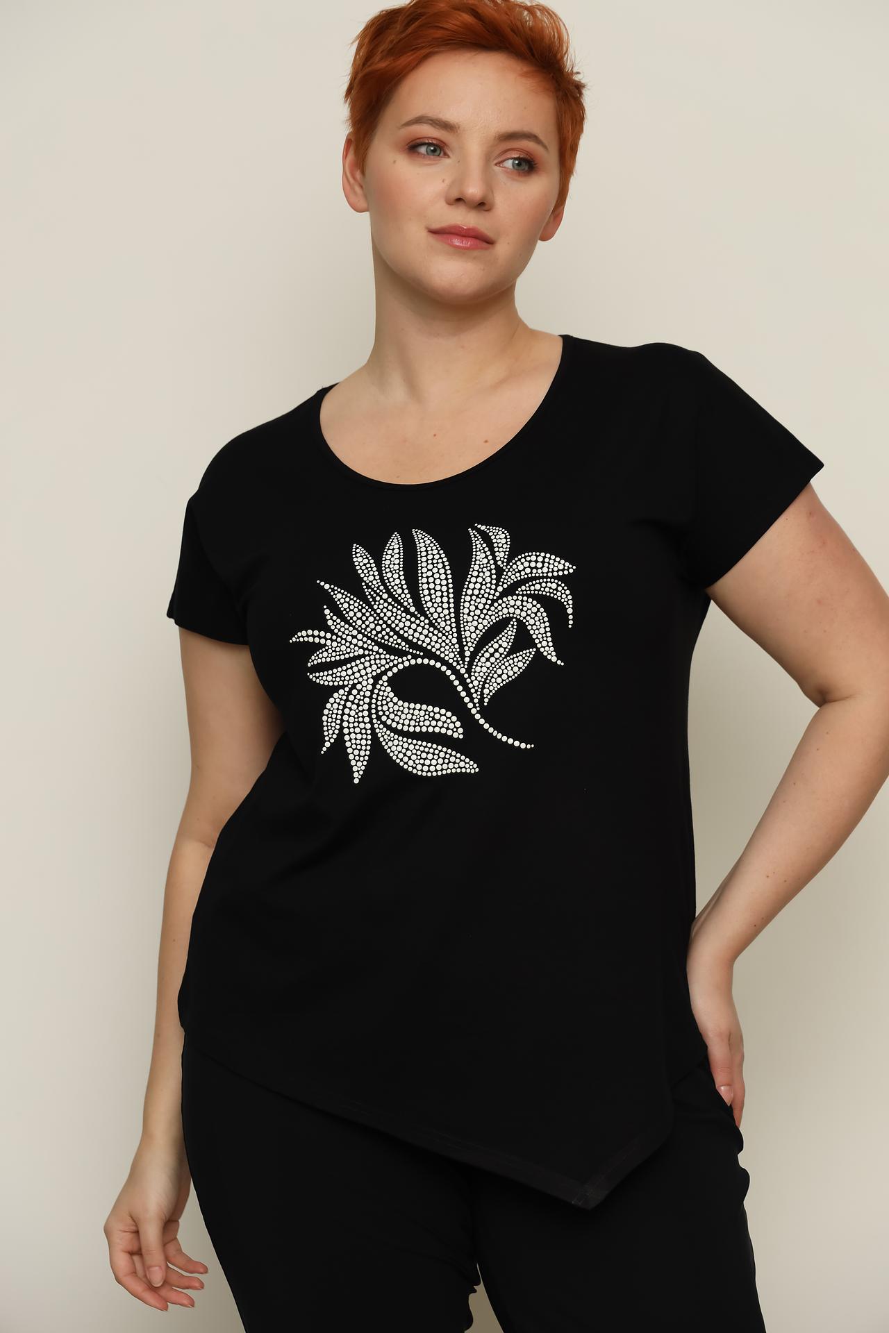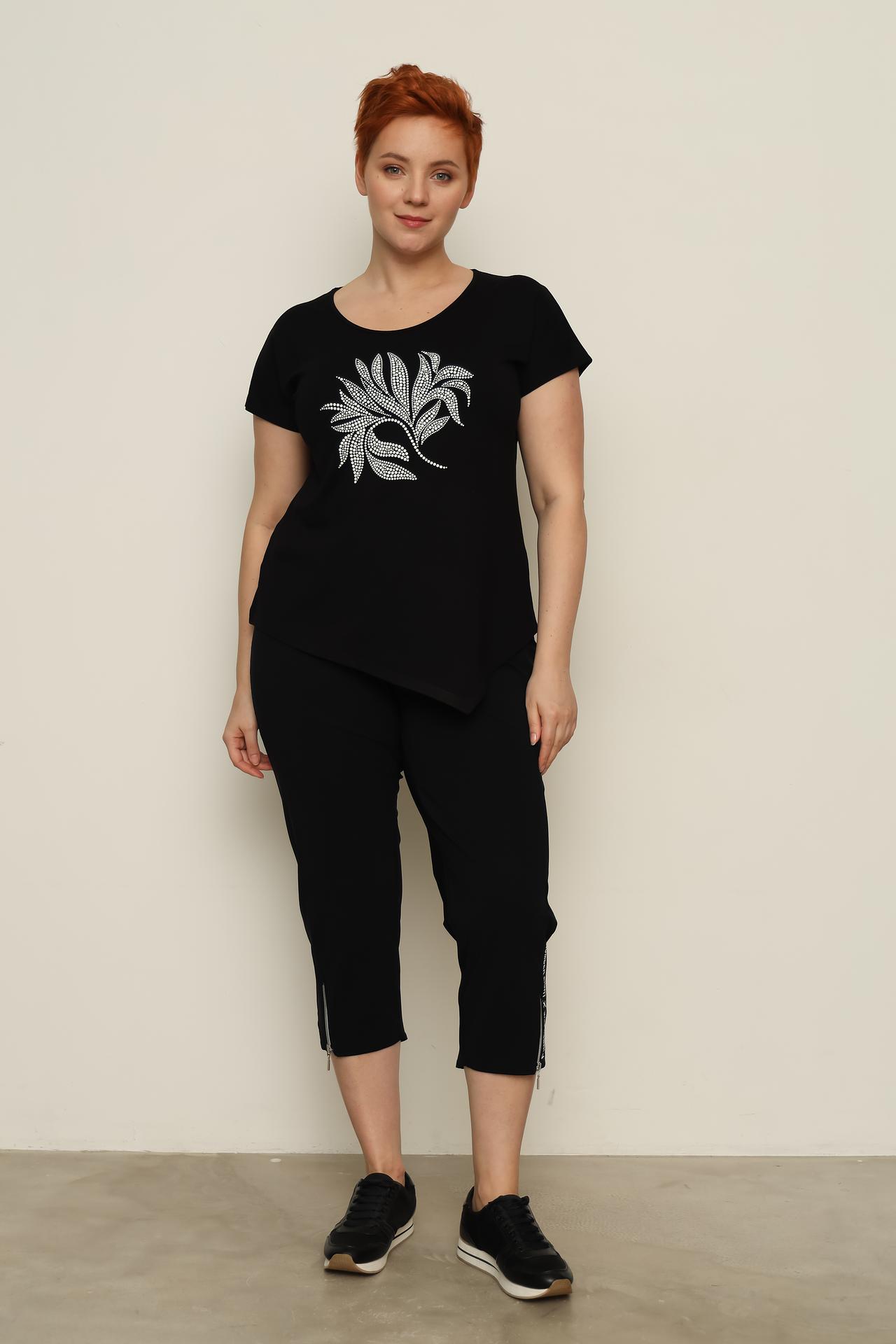 - Дизайн: Модель имеет короткие рукава, круглый вырез горловины и стильный асимметричный подол. Декоративный элемент в виде узора из мелких белых страз на груди придает футболке изысканный вид.