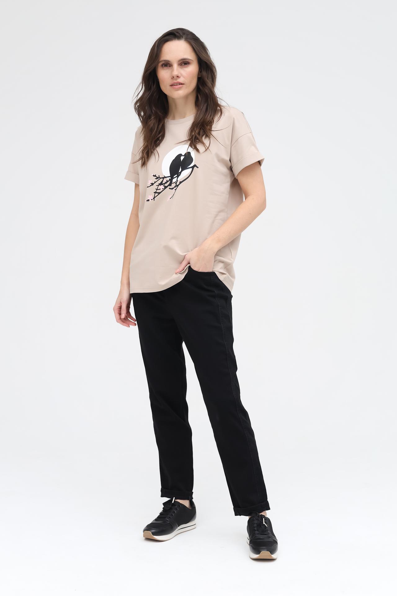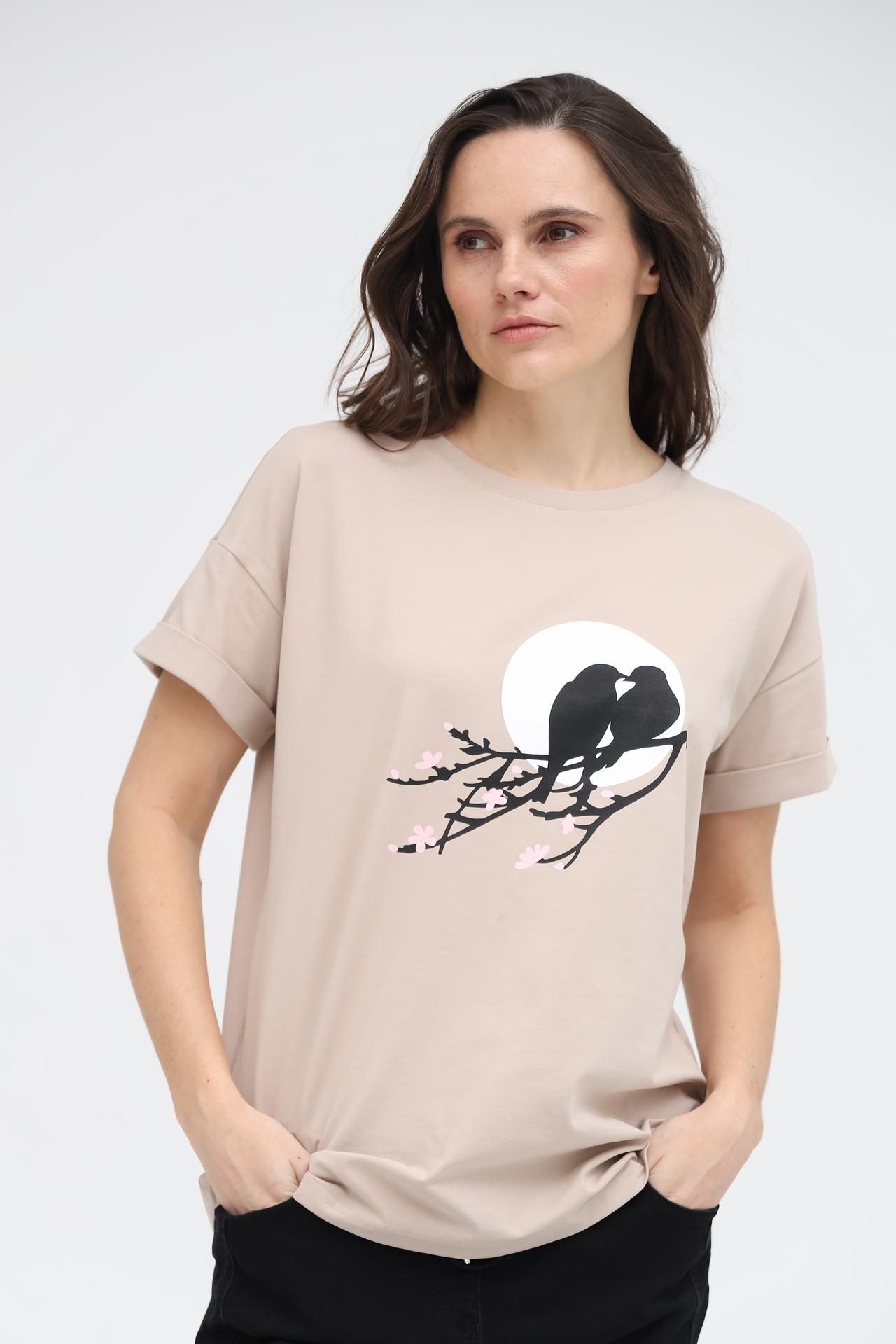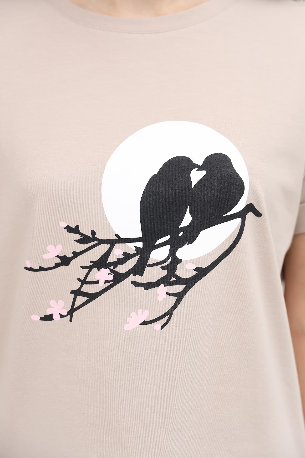 - Принт: Стильный принт с птицами и цветами на груди добавляет изюминку и делает футболку акцентной деталью образа.