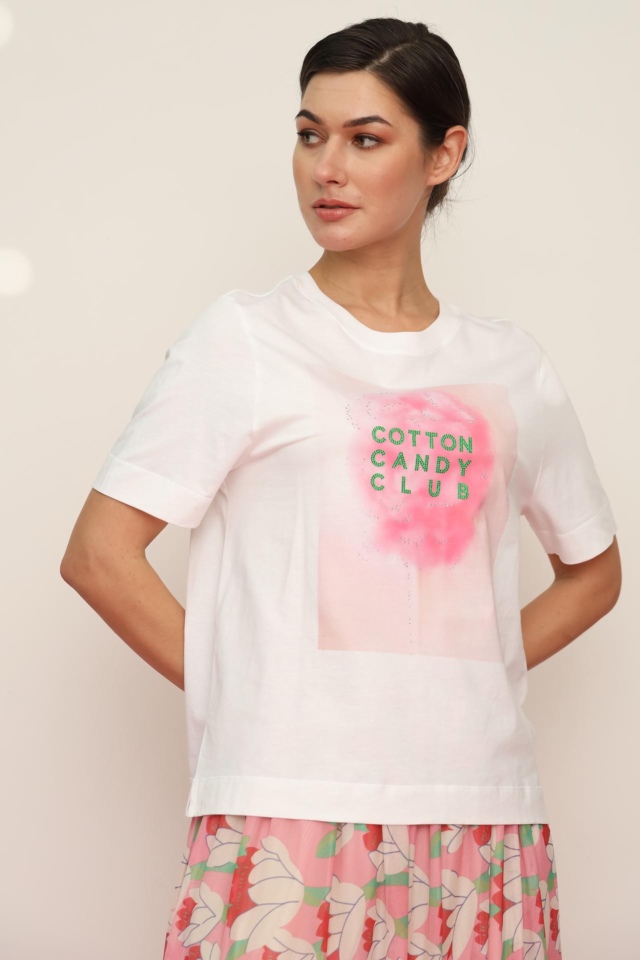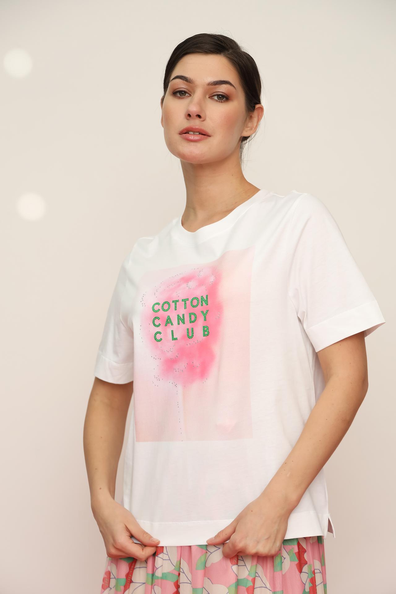 - Дизайн: Оригинальный принт "Cotton Candy Club". Нежный акварельный фон с контрастной надписью и мерцающими деталями придает футболке уникальный вид.