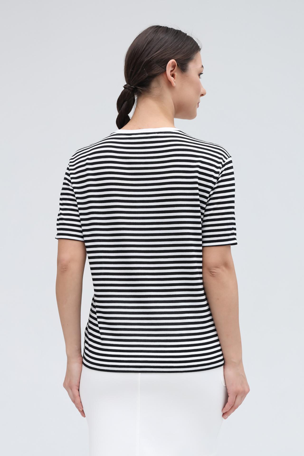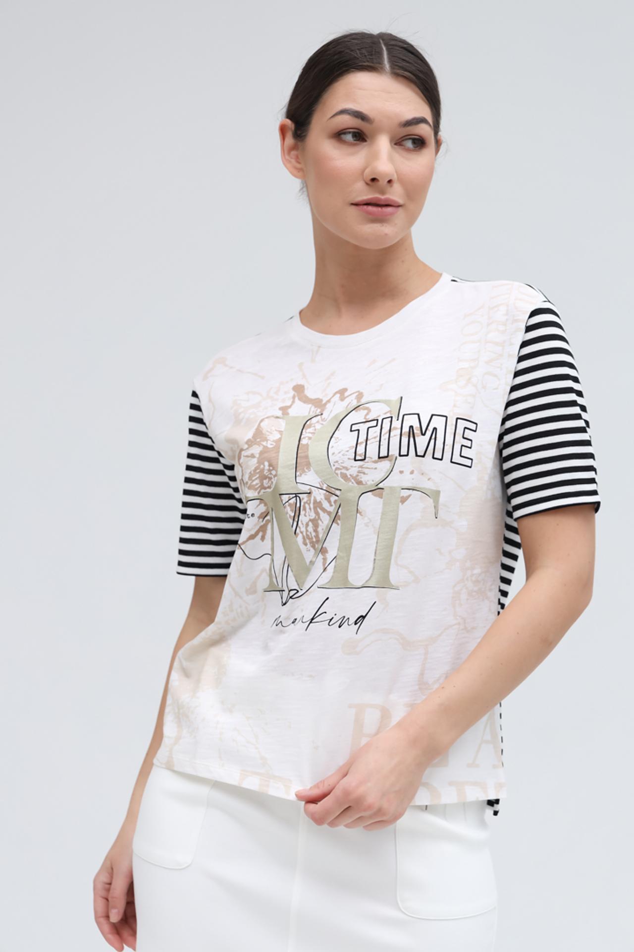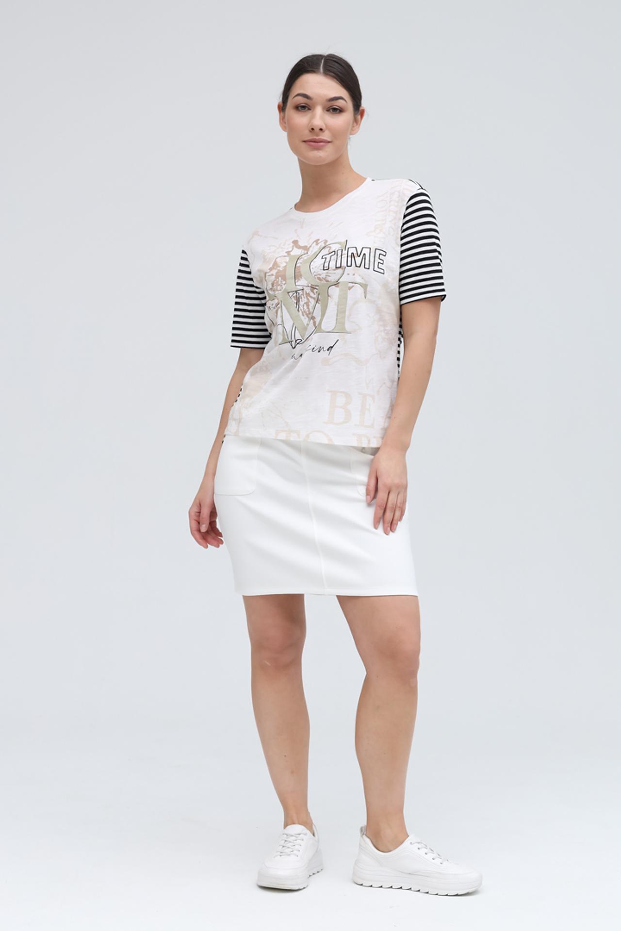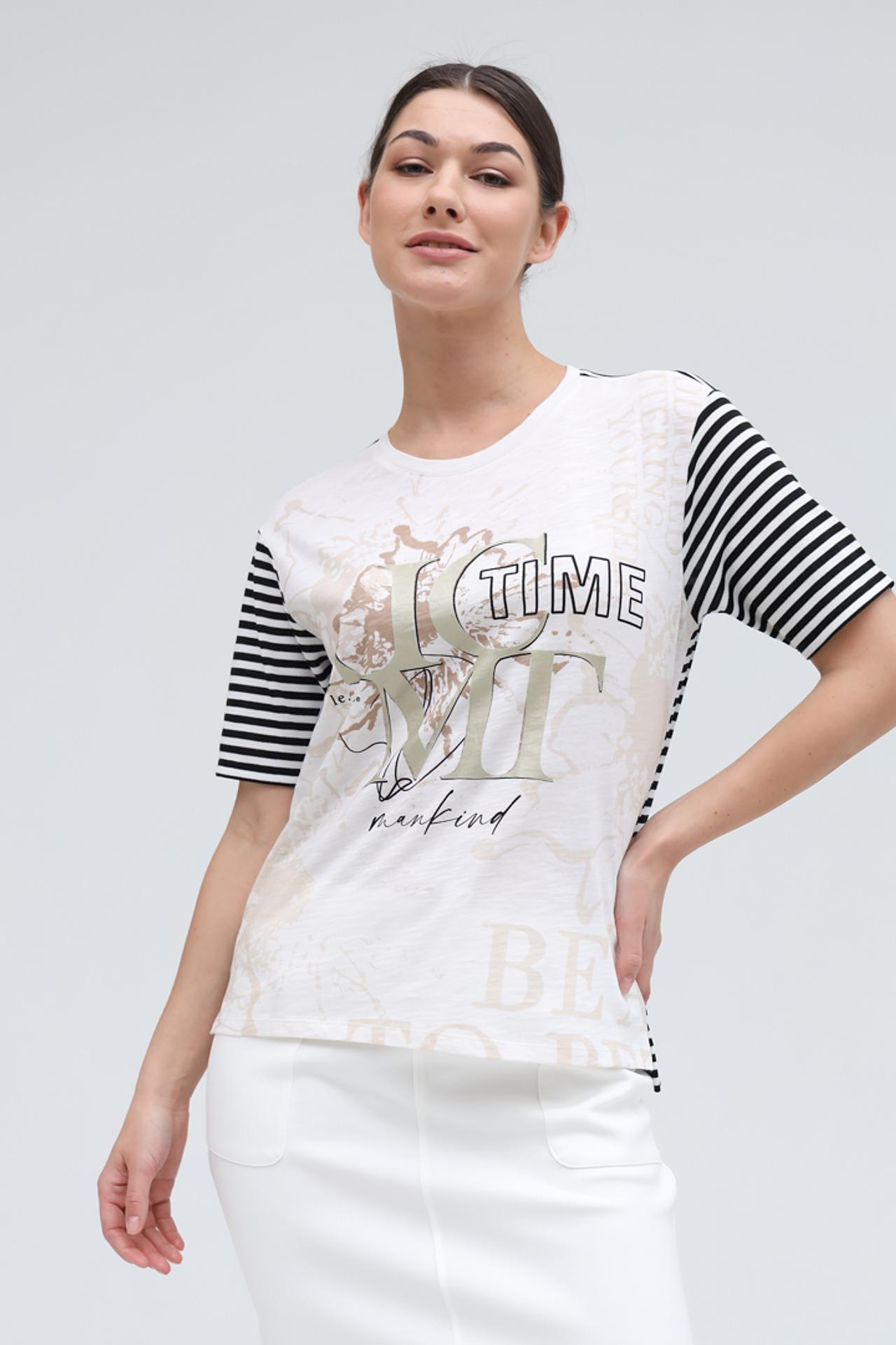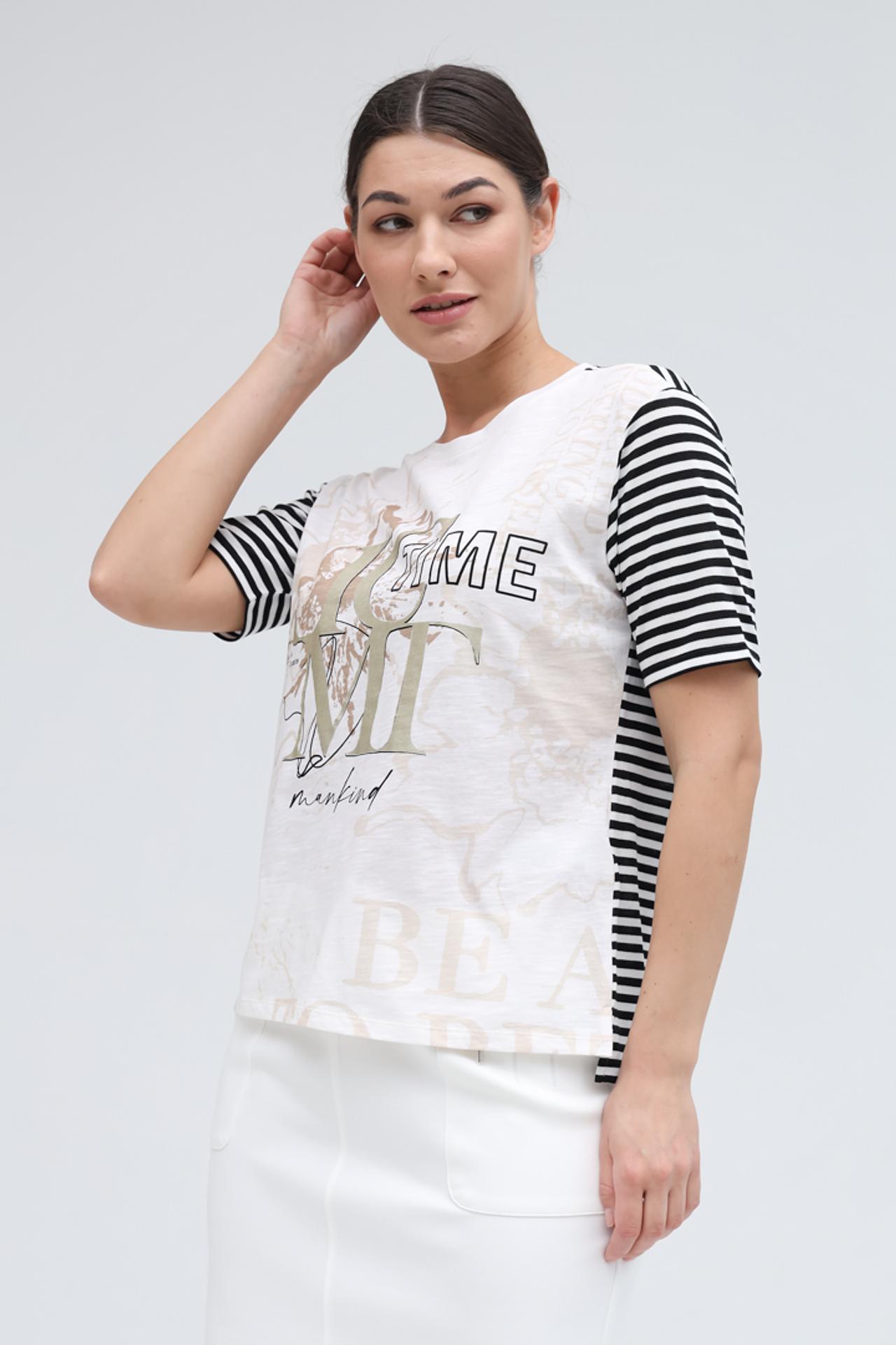 - Дизайн: Футболка украшена оригинальным принтом и полосатыми вставками.