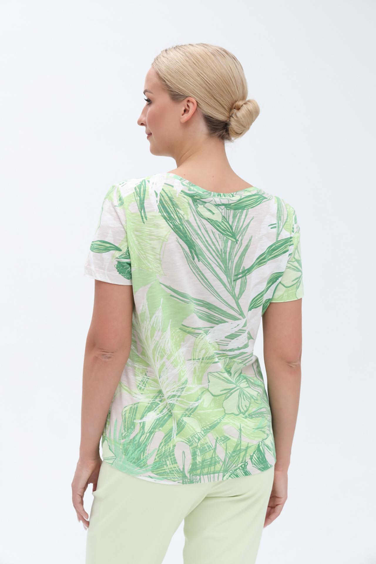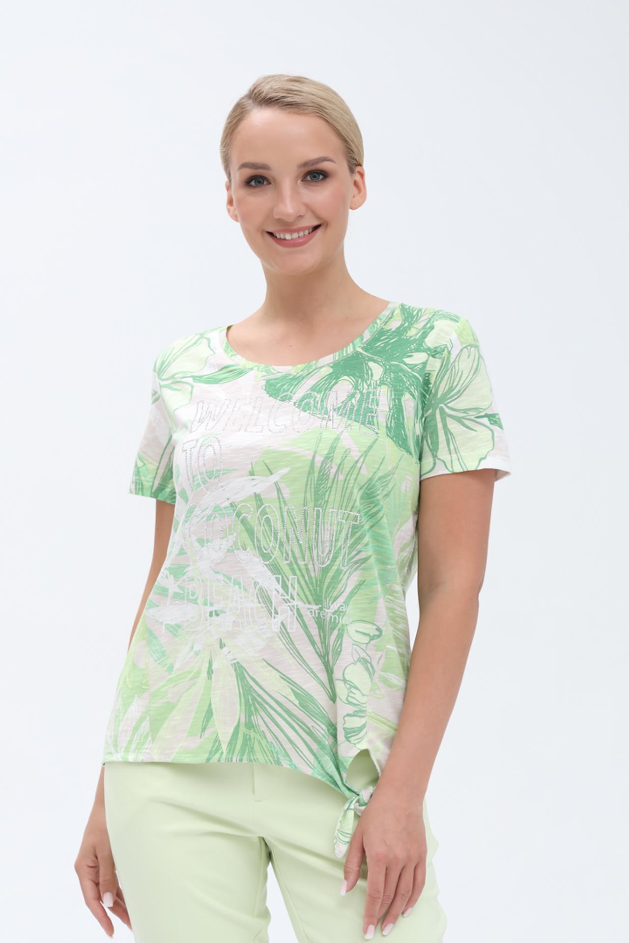 Эта футболка от Monari – идеальное сочетание комфорта и стиля. Выполнена из мягкой ткани (50% хлопок, 50% модал), она приятна к телу и обеспечивает отличную воздухопроницаемость. Яркий принт с тропическими мотивами и оригинальный узел сбоку добавляют образу свежести и индивидуальности. Подходит для создания модных летних образов.