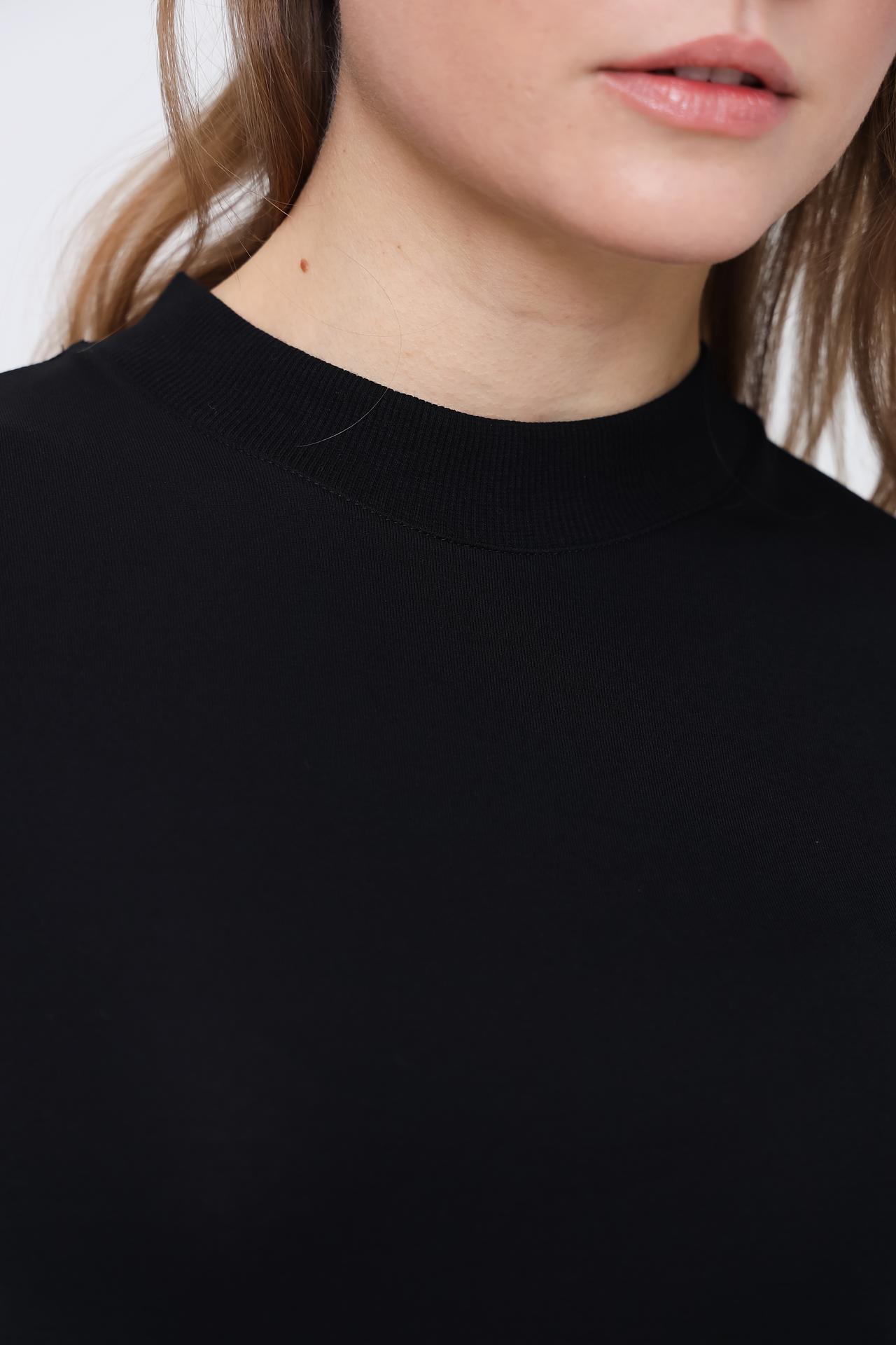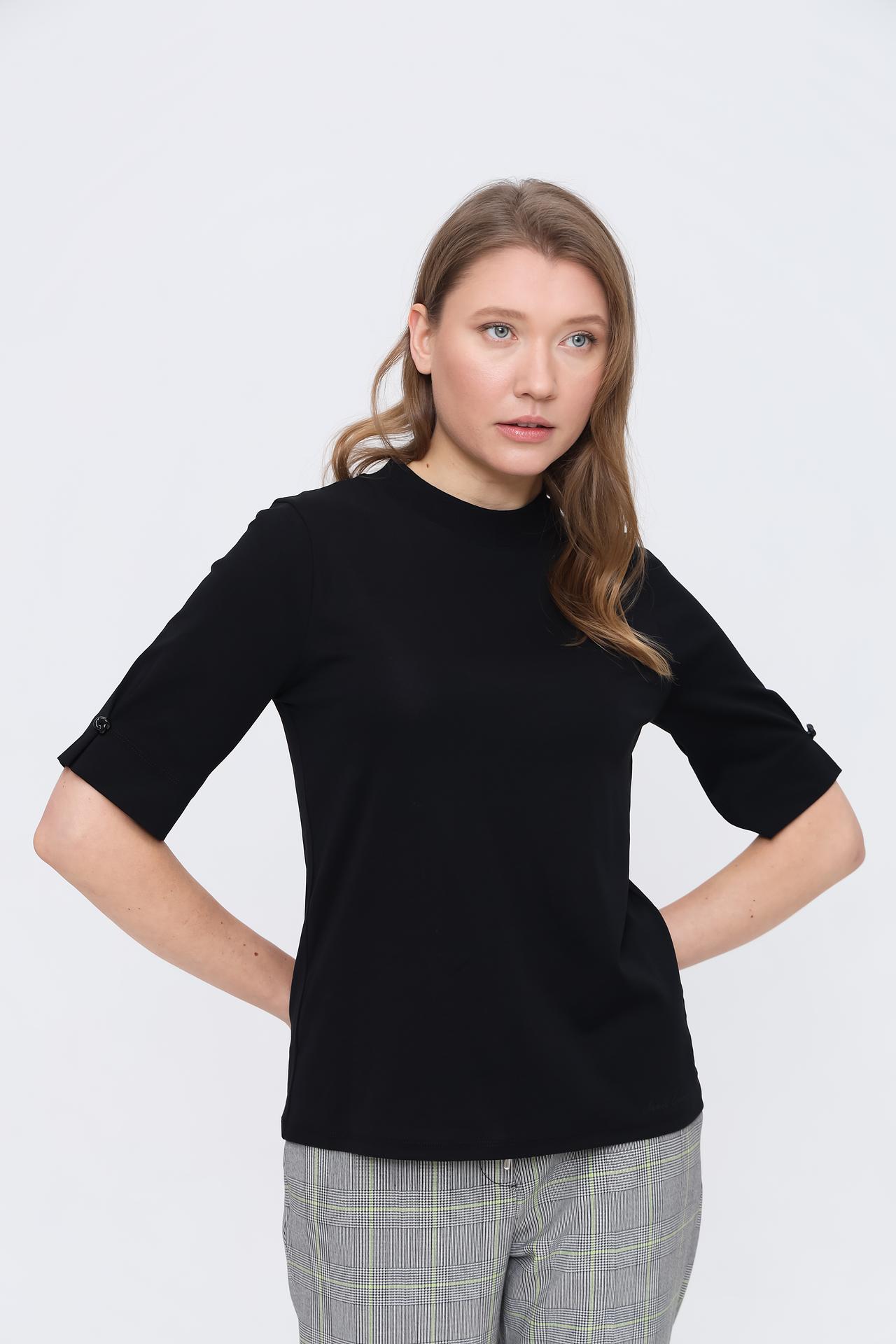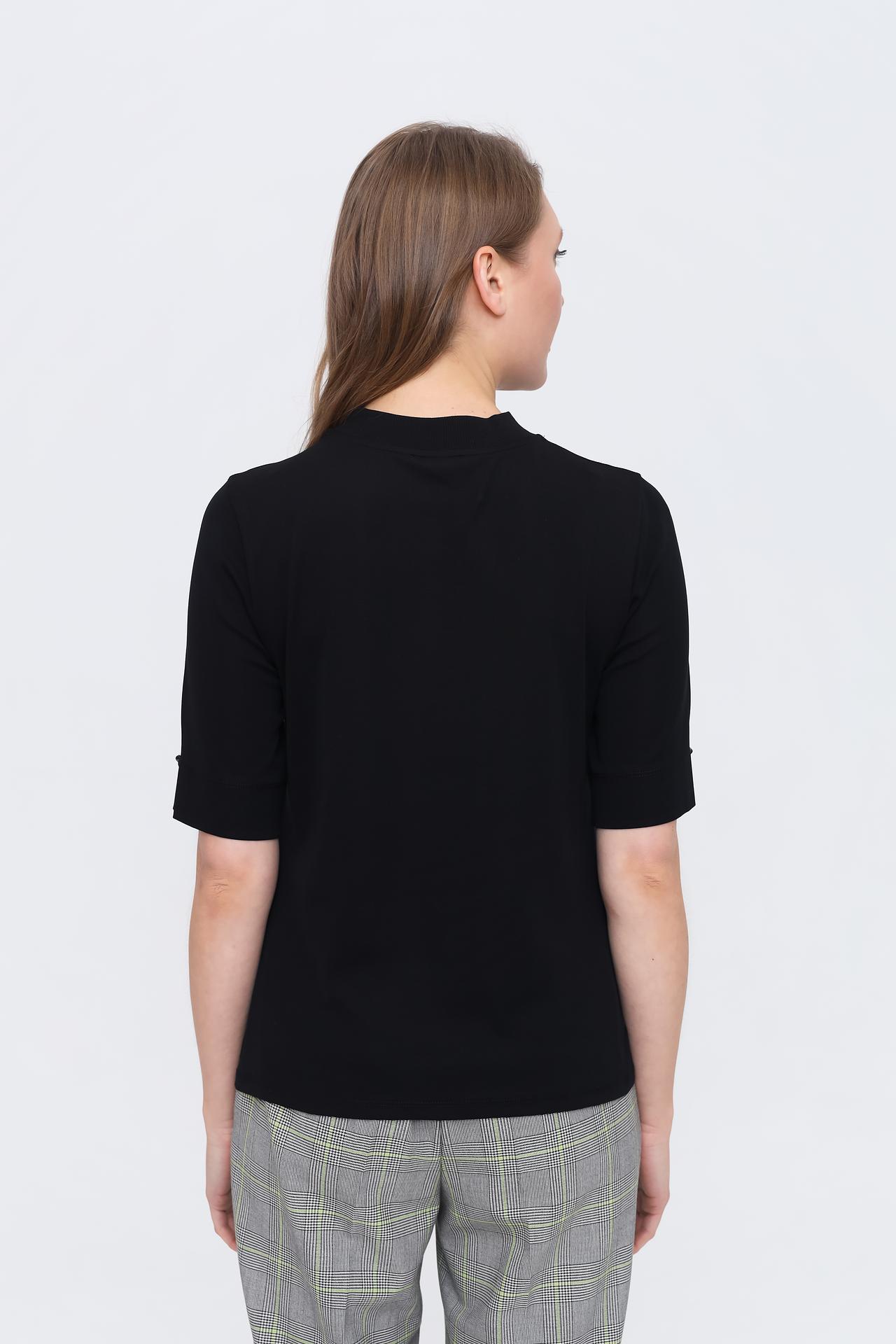 - Изысканный дизайн: Классический черный цвет и элегантный воротник-стойка делают эту футболку универсальной основой для множества ансамблей. Она идеально подходит как для офиса, так и для неформальных встреч, создавая законченный образ.