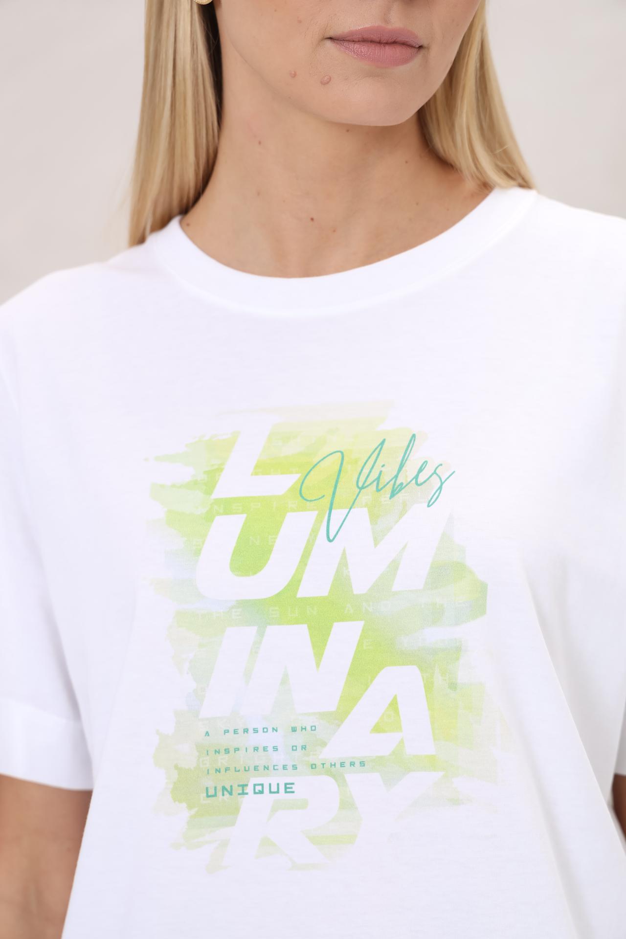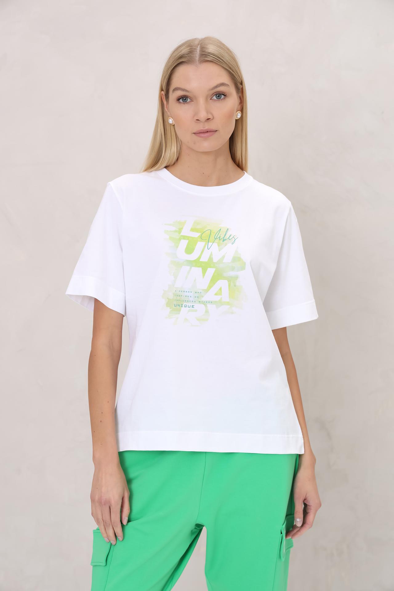 Особый шарм изделию придает стильный графический принт на груди, выполненный в современных оттенках. Надпись "Lumina Vibes" добавляет уникальности и выражает индивидуальность, делая эту хлопковую футболку не просто элементом одежды, а акцентом вашего стиля. Укороченные рукава с отворотами подчеркивают трендовый вид модели.