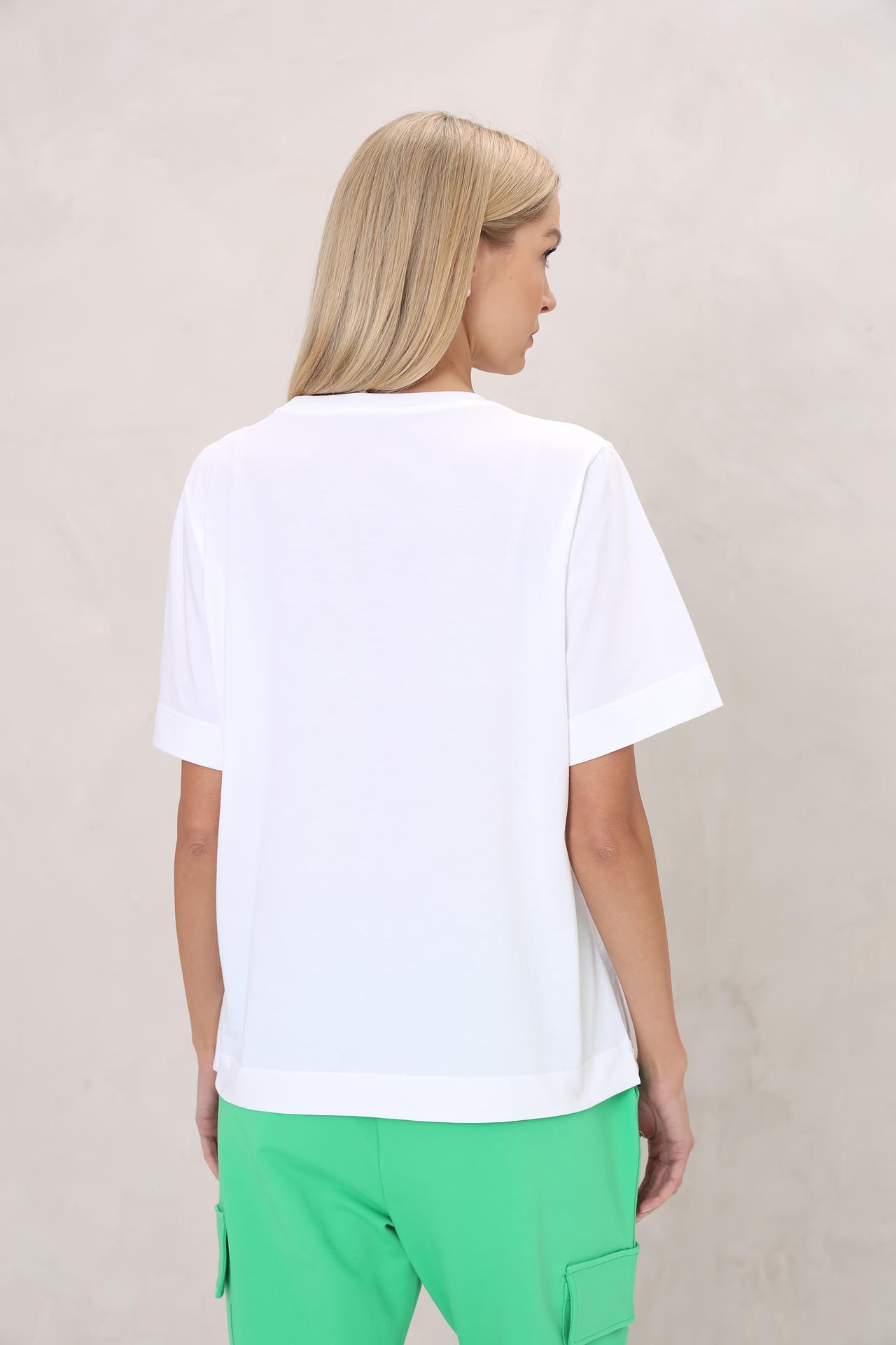 • Стильный дизайн: Модель дополнена выразительным графическим принтом, который придает изделию современный и динамичный вид. Сочетание белого фона с яркими акцентами принта делает футболку заметной деталью образа.