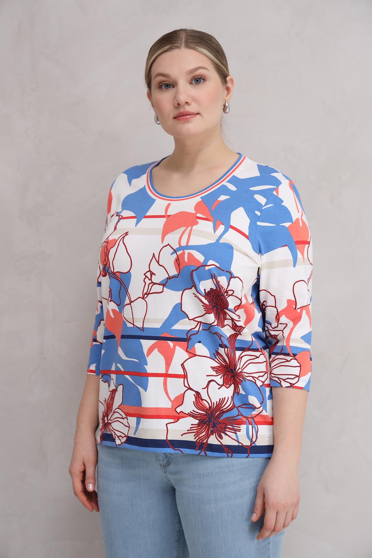 Футболка украшена ярким цветочным принтом, который добавит красок в ваш образ. Модель с тремя четвертями рукава отлично подходит для прохладной погоды и универсальна для любого случая.