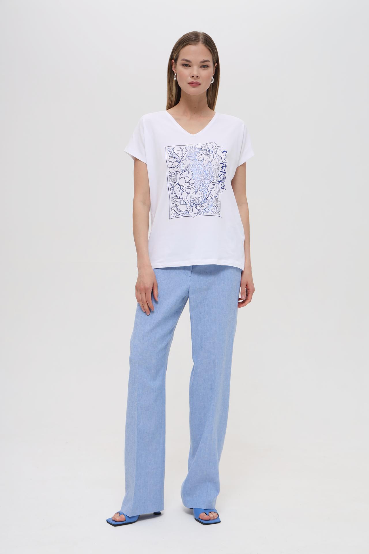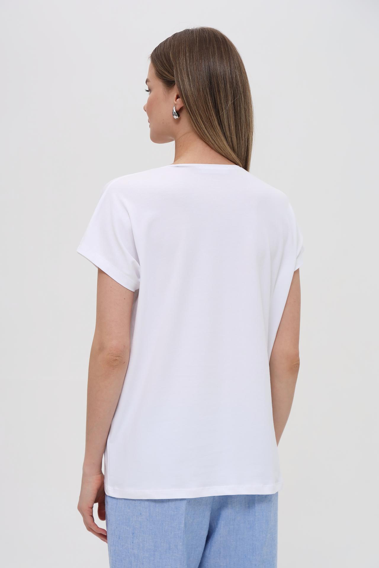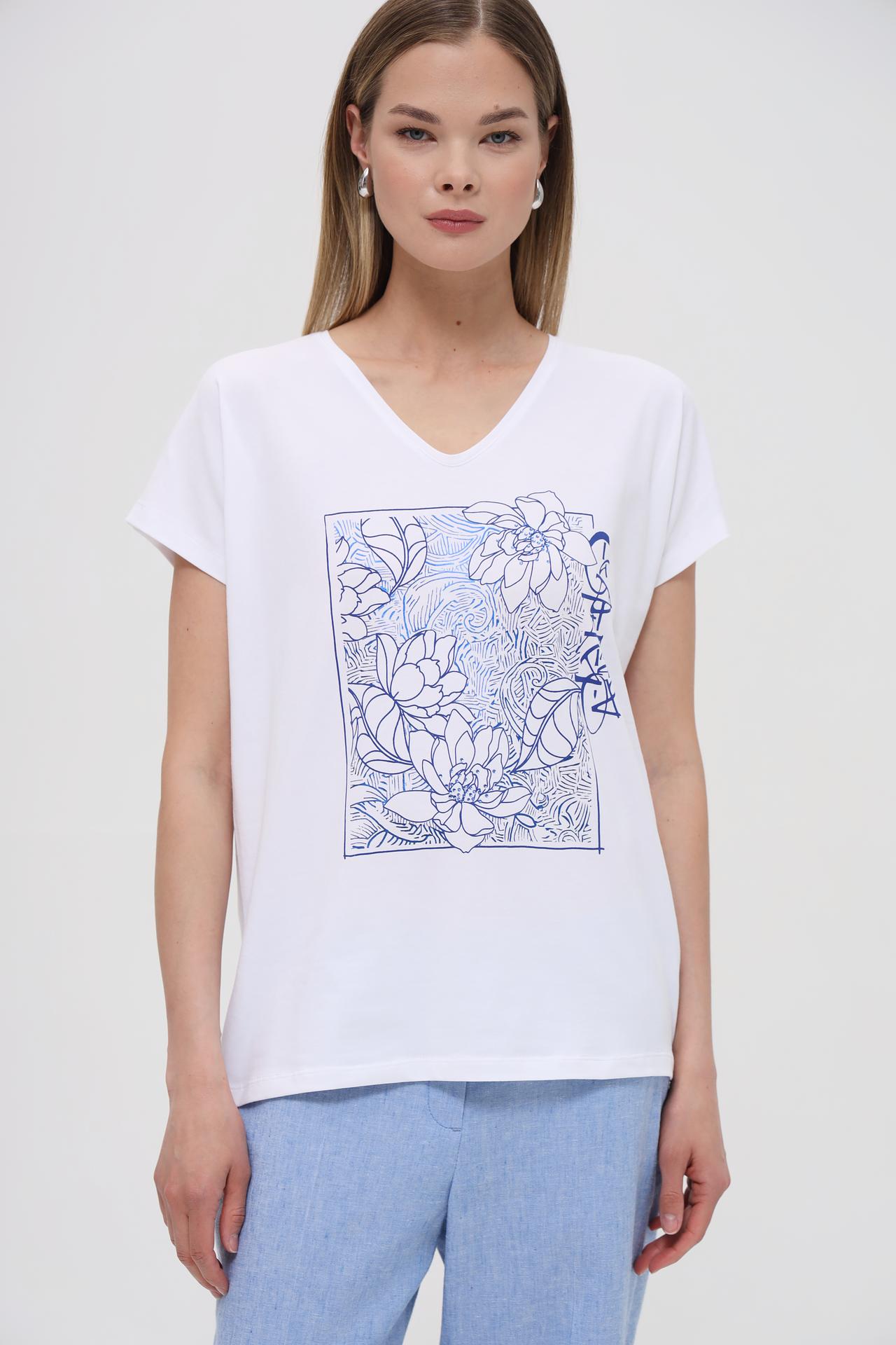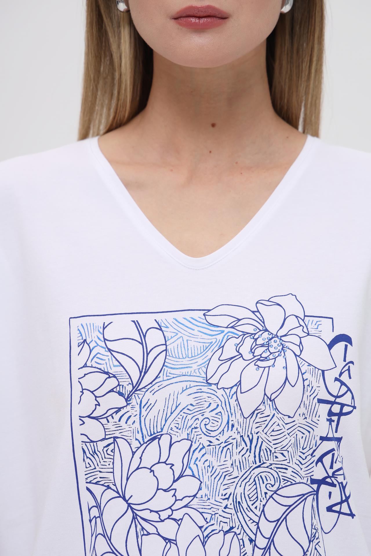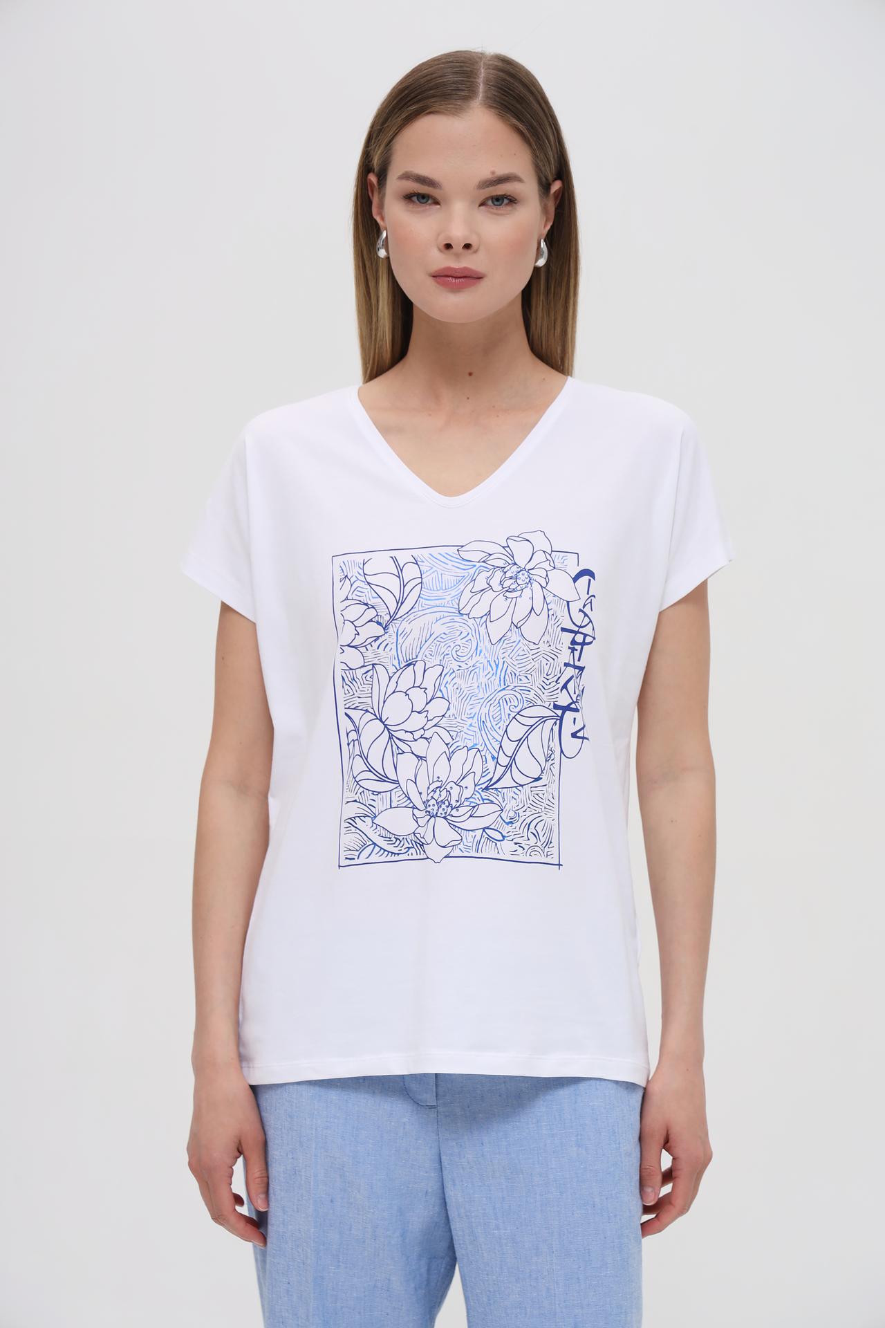 Белая футболка Bianca с V-образным вырезом – это идеальный выбор для создания легкого и женственного образа. Изготовленная из мягкого и приятного на ощупь материала, состоящего из 92% хлопка и 8% эластана, она обеспечивает комфорт и свободу движений на протяжении всего дня. Стильный цветочный принт добавляет футболке изюминку, делая ее отличным дополнением к вашему гардеробу.