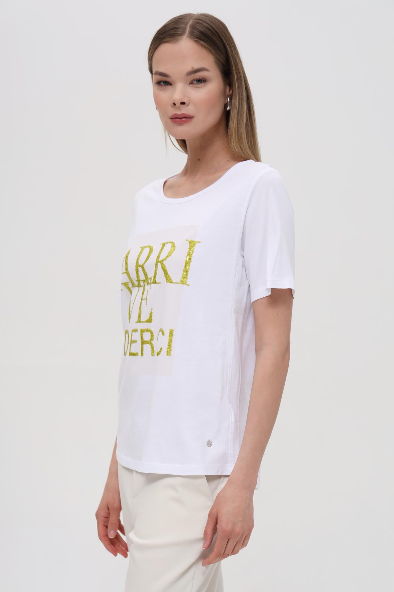 Футболка декорирована принтом с надписью, добавляющим образу индивидуальность. Прекрасный выбор для создания стильных и непринужденных образов в стиле casual.