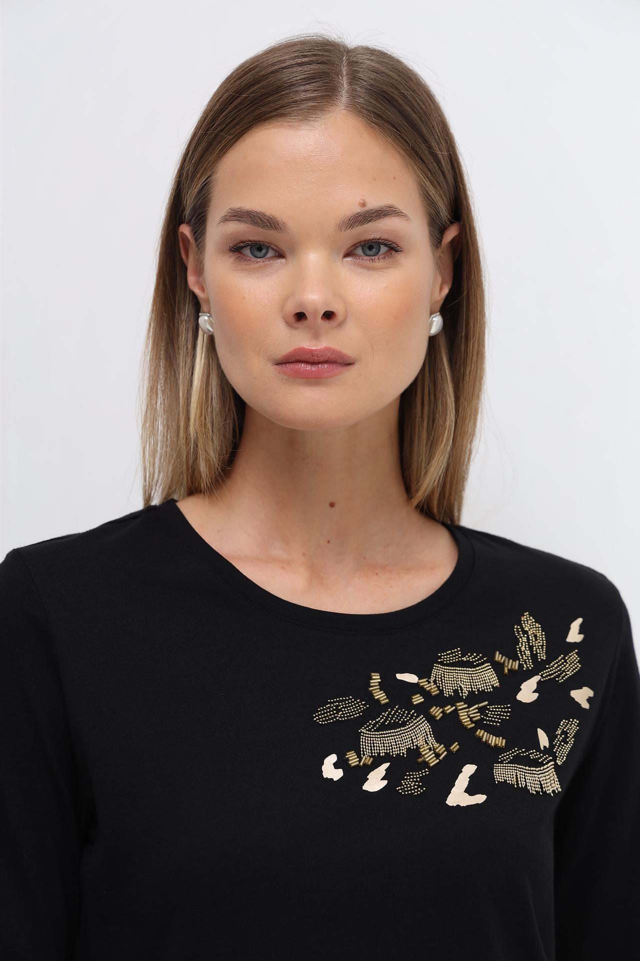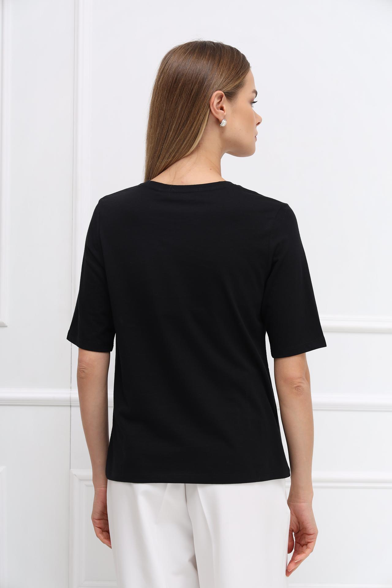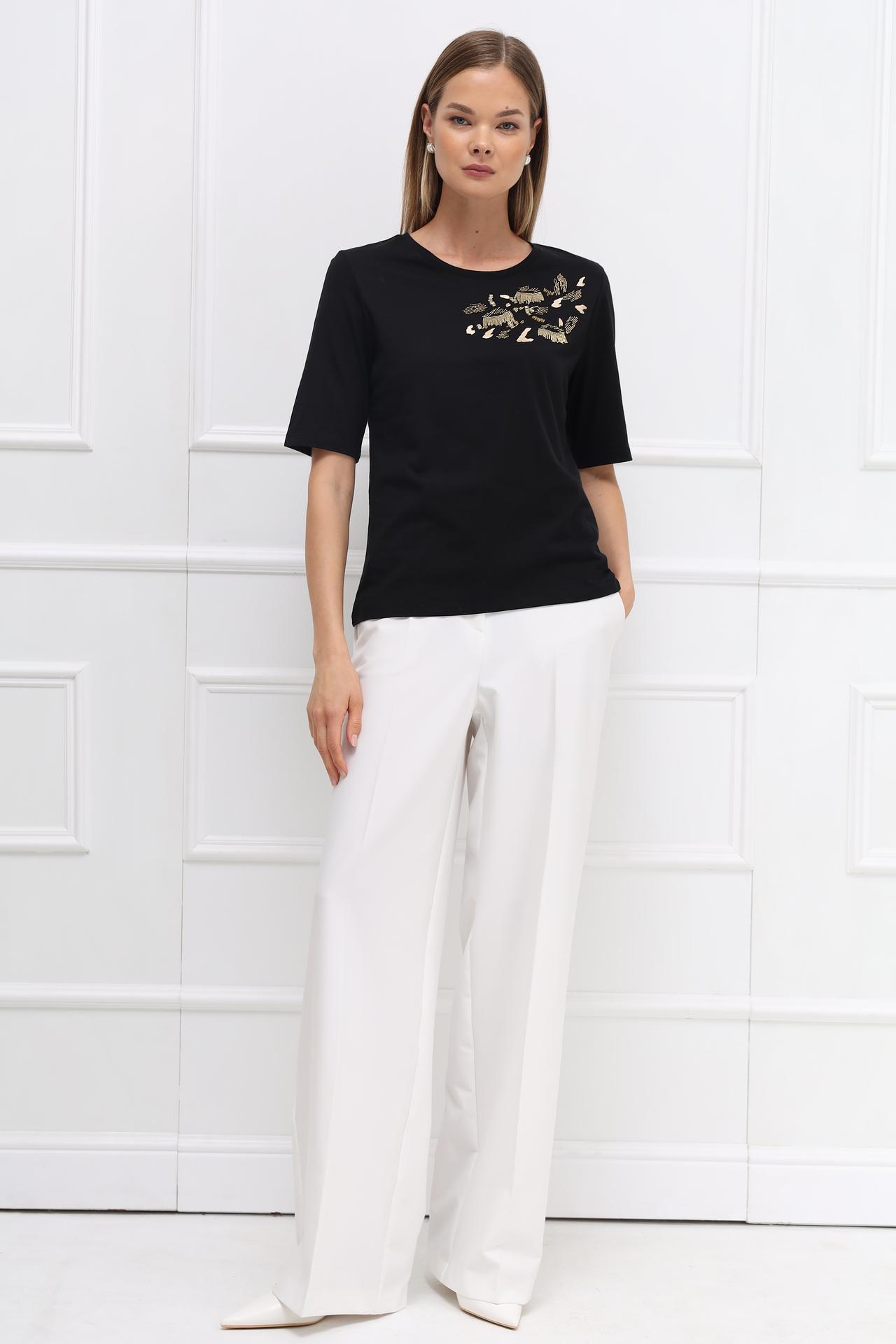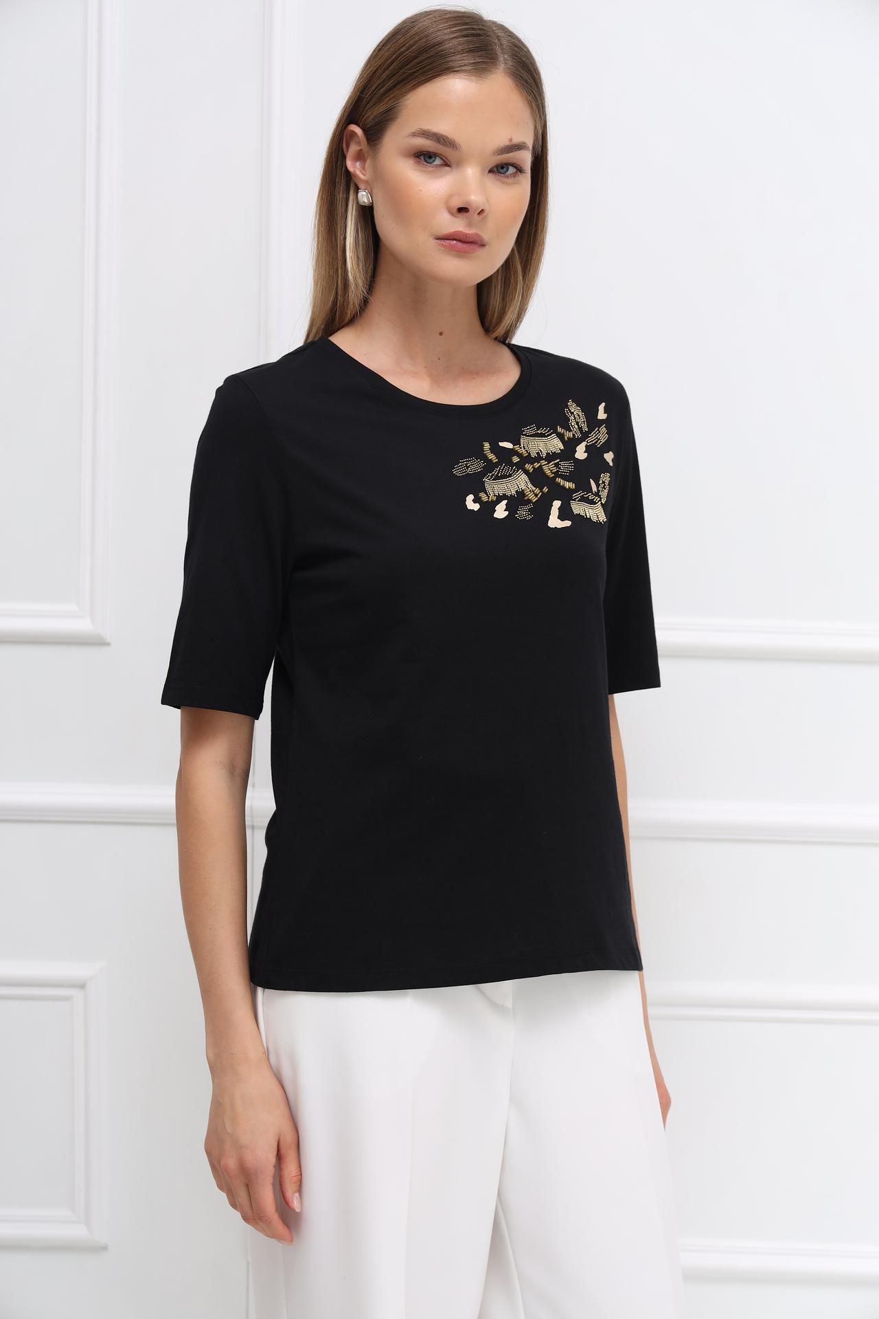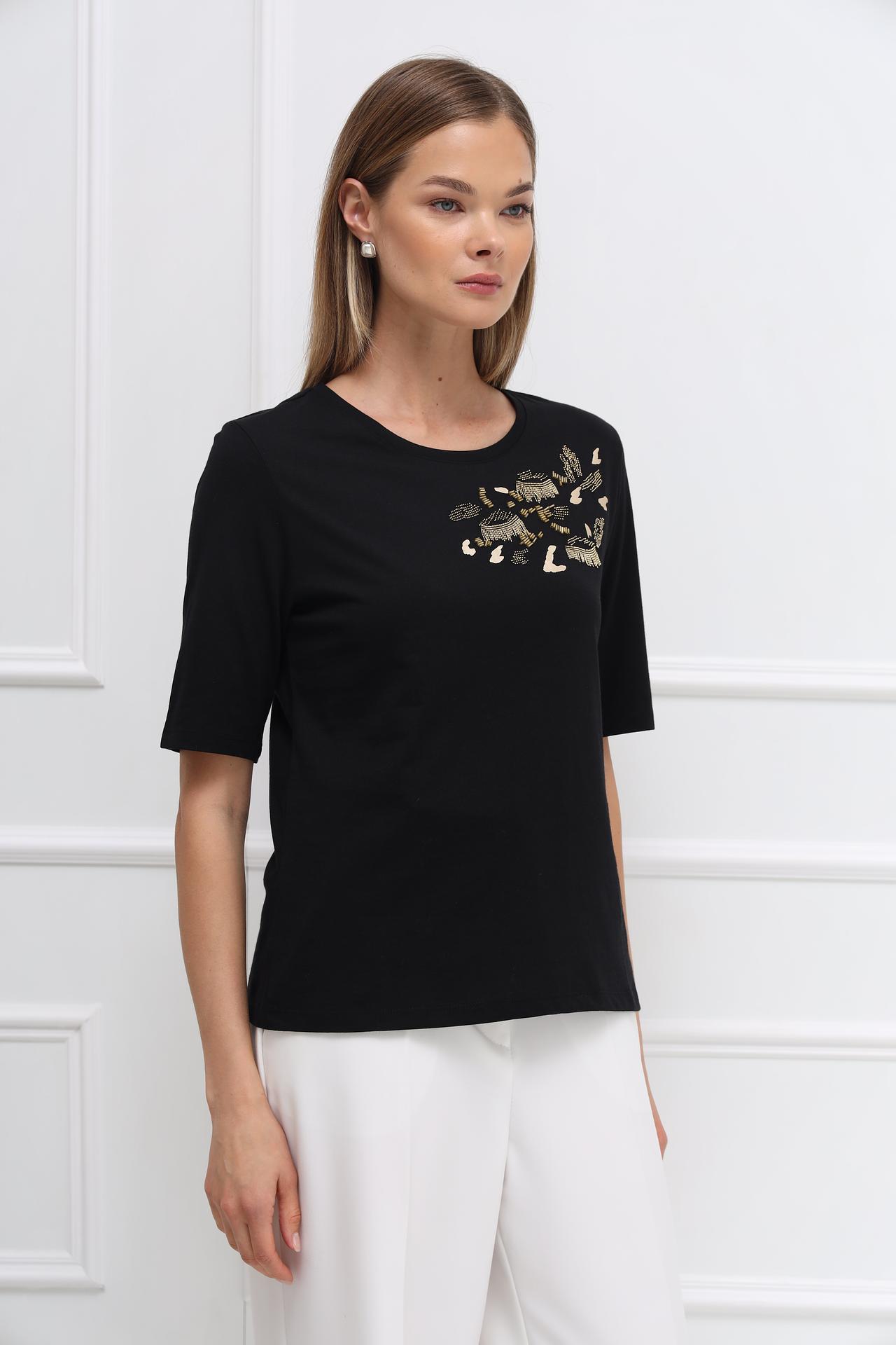Модель отличается лаконичным дизайном и комфортным кроем, дополненным изящной вышивкой с золотистыми и серебристыми элементами на груди. Такая футболка станет стильным акцентом вашего повседневного или вечернего наряда. Прекрасно сочетается с брюками, юбками и джинсами, позволяя создавать разнообразные комплекты.