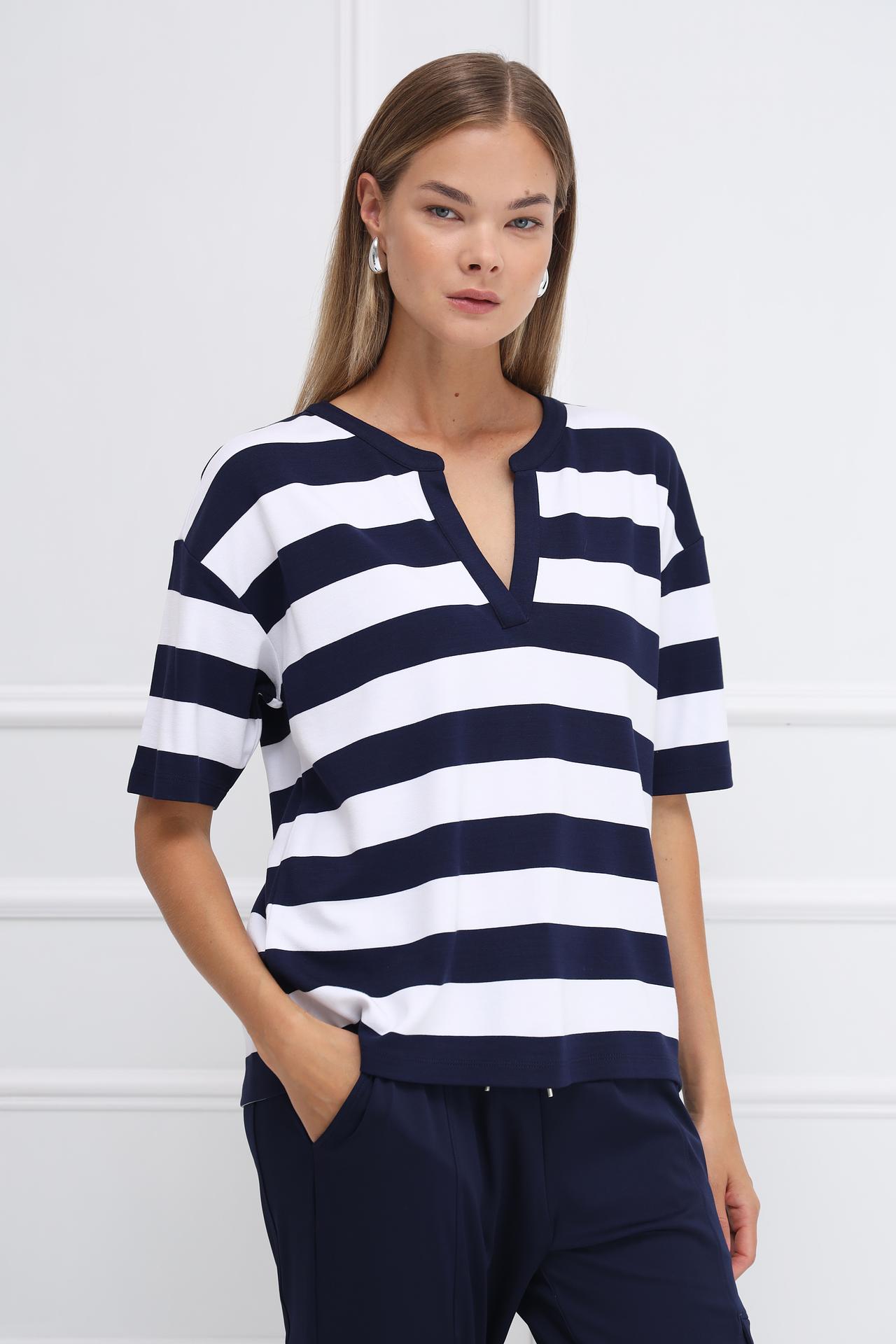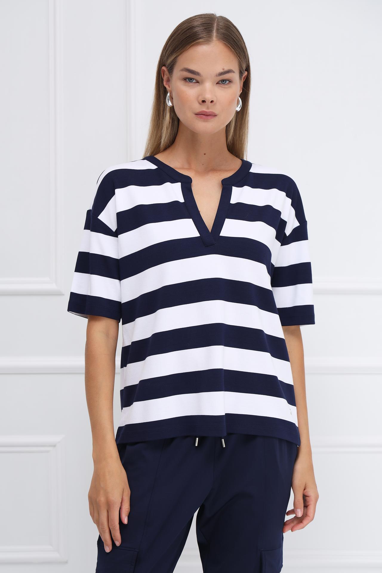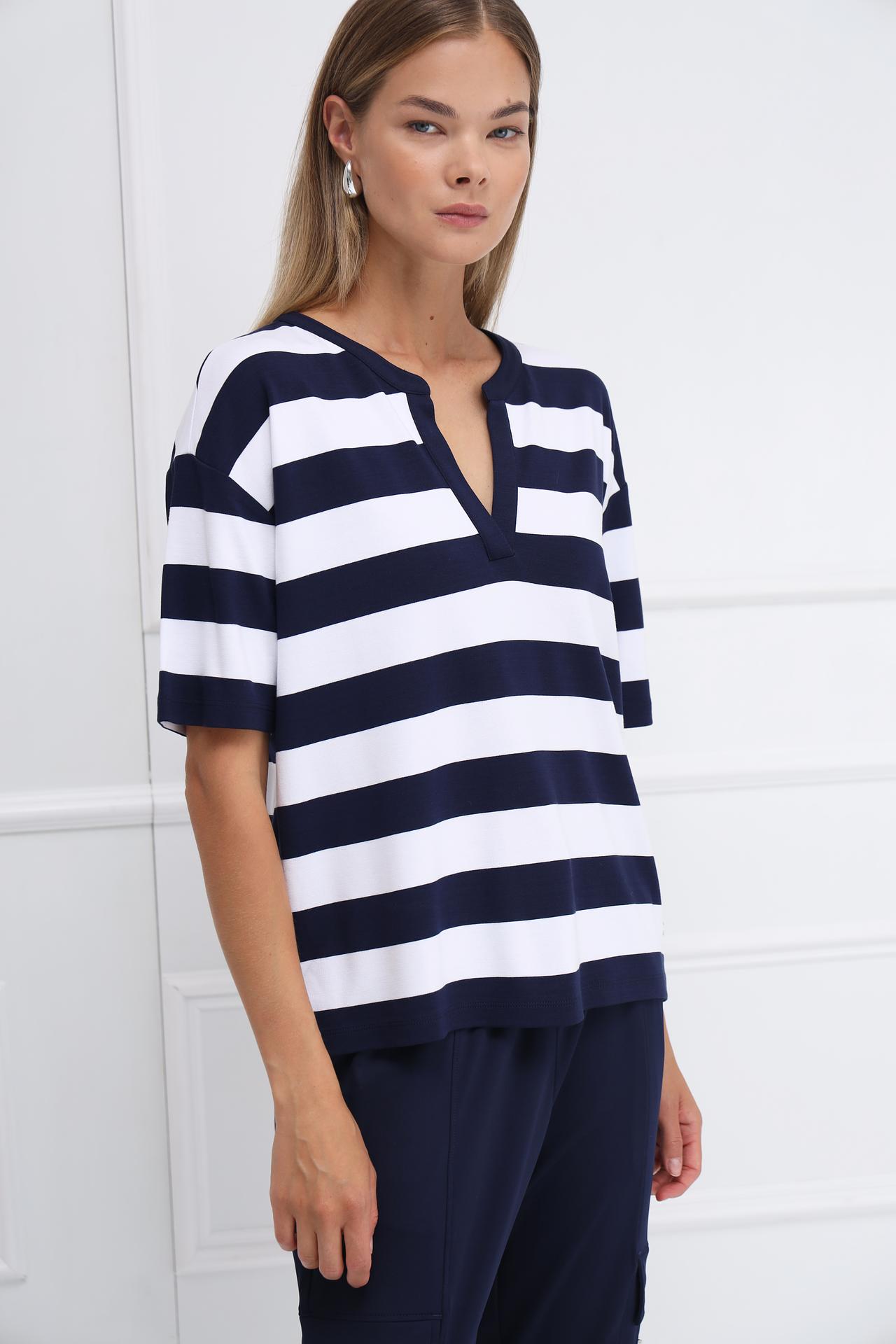 Повседневная футболка в полоску от Monari – это сочетание комфорта и стиля. Мягкая и приятная к телу ткань обеспечит комфорт в течение всего дня. Футболка идеально подойдет для создания стильных образов в морском стиле или для повседневной носки.