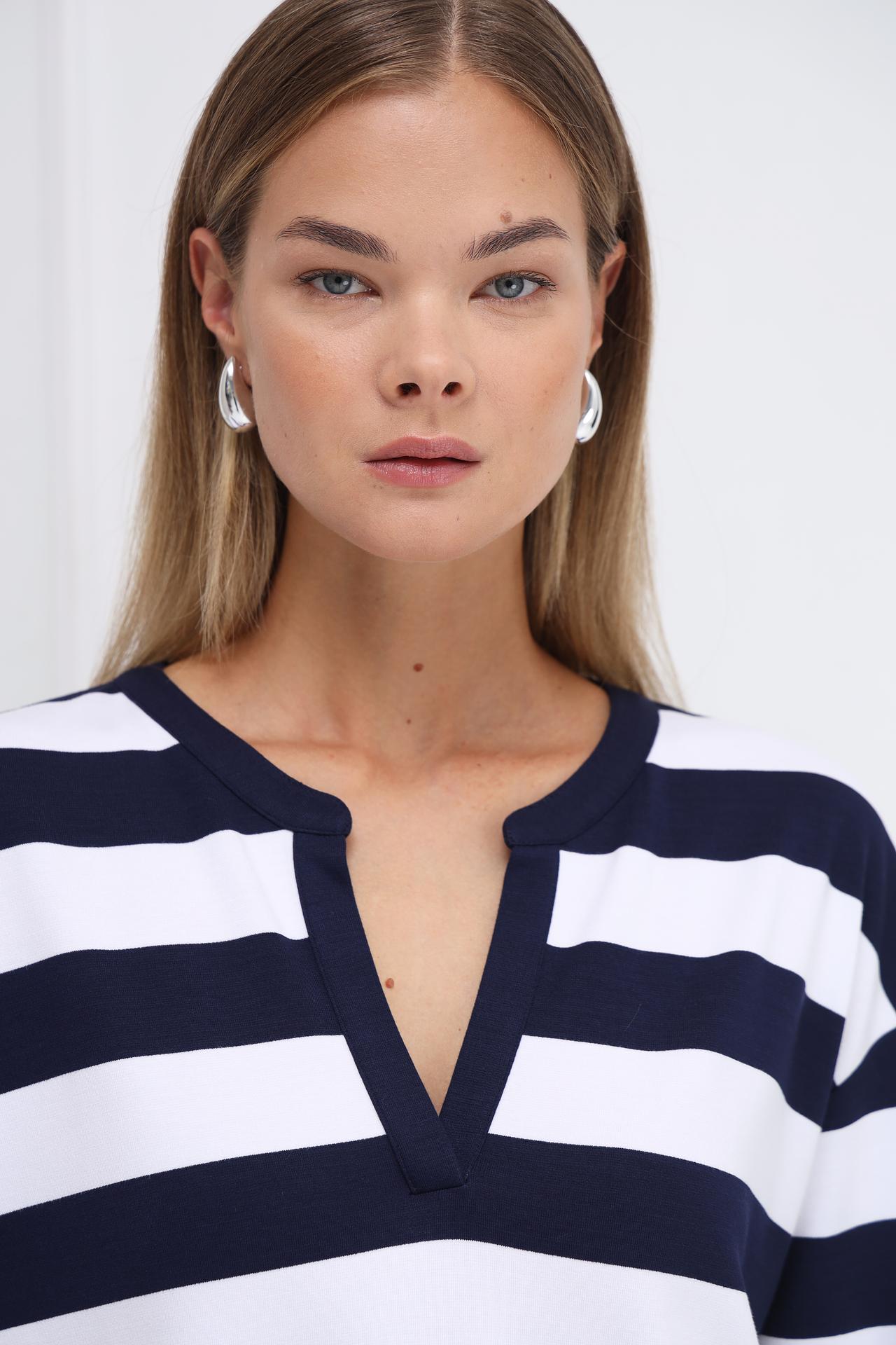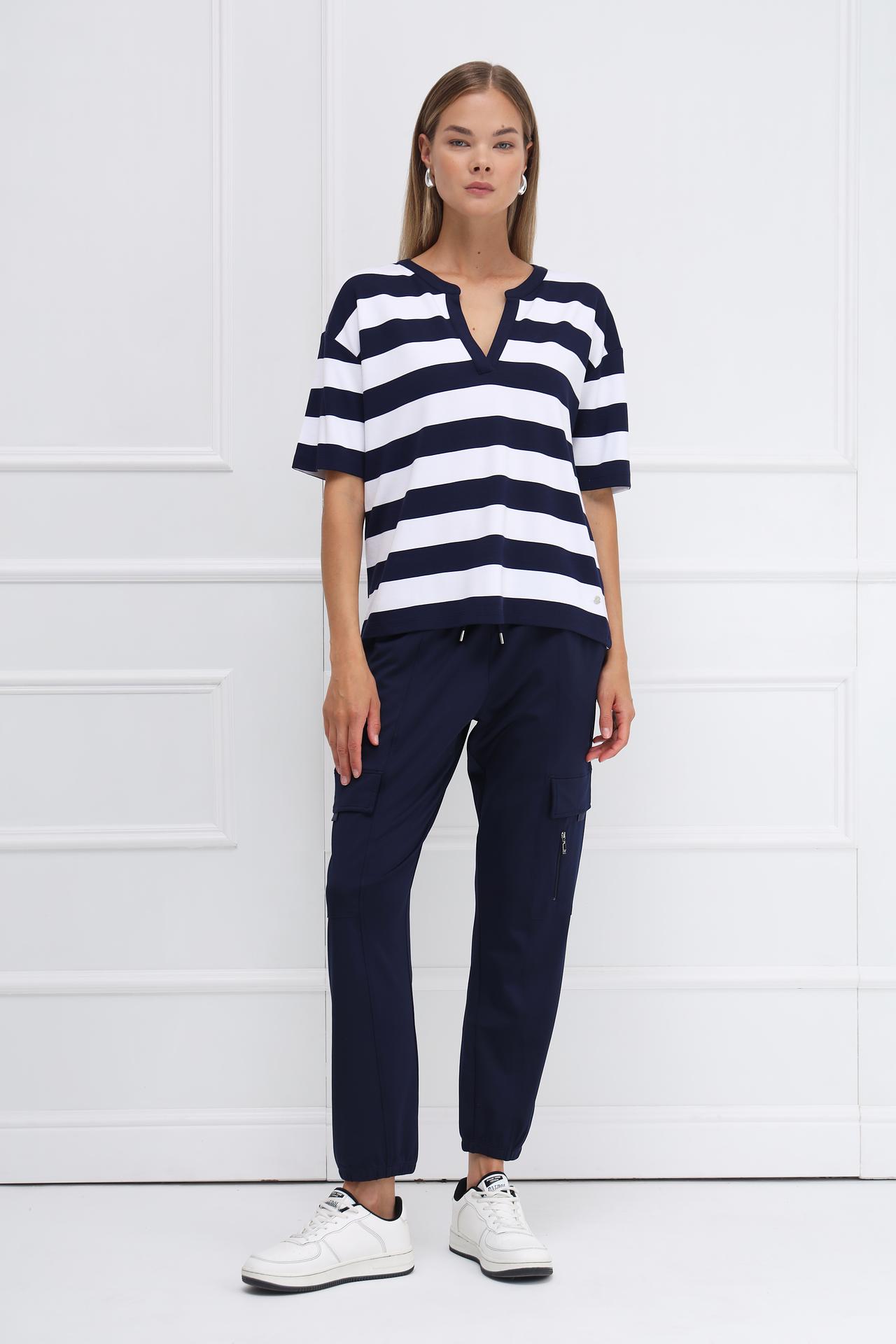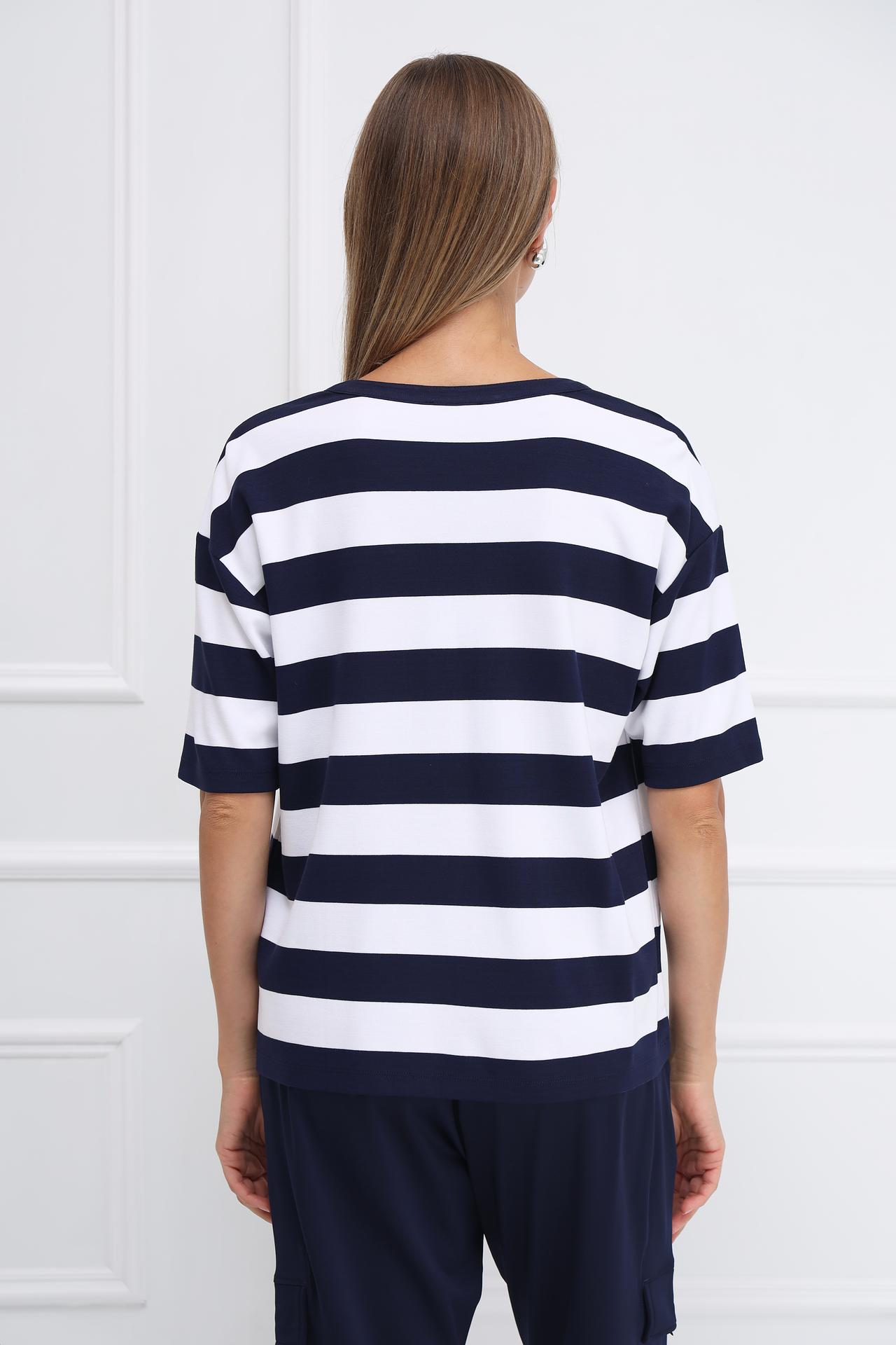 Повседневная футболка в полоску от Monari – это сочетание комфорта и стиля. Мягкая и приятная к телу ткань обеспечит комфорт в течение всего дня. Футболка идеально подойдет для создания стильных образов в морском стиле или для повседневной носки.