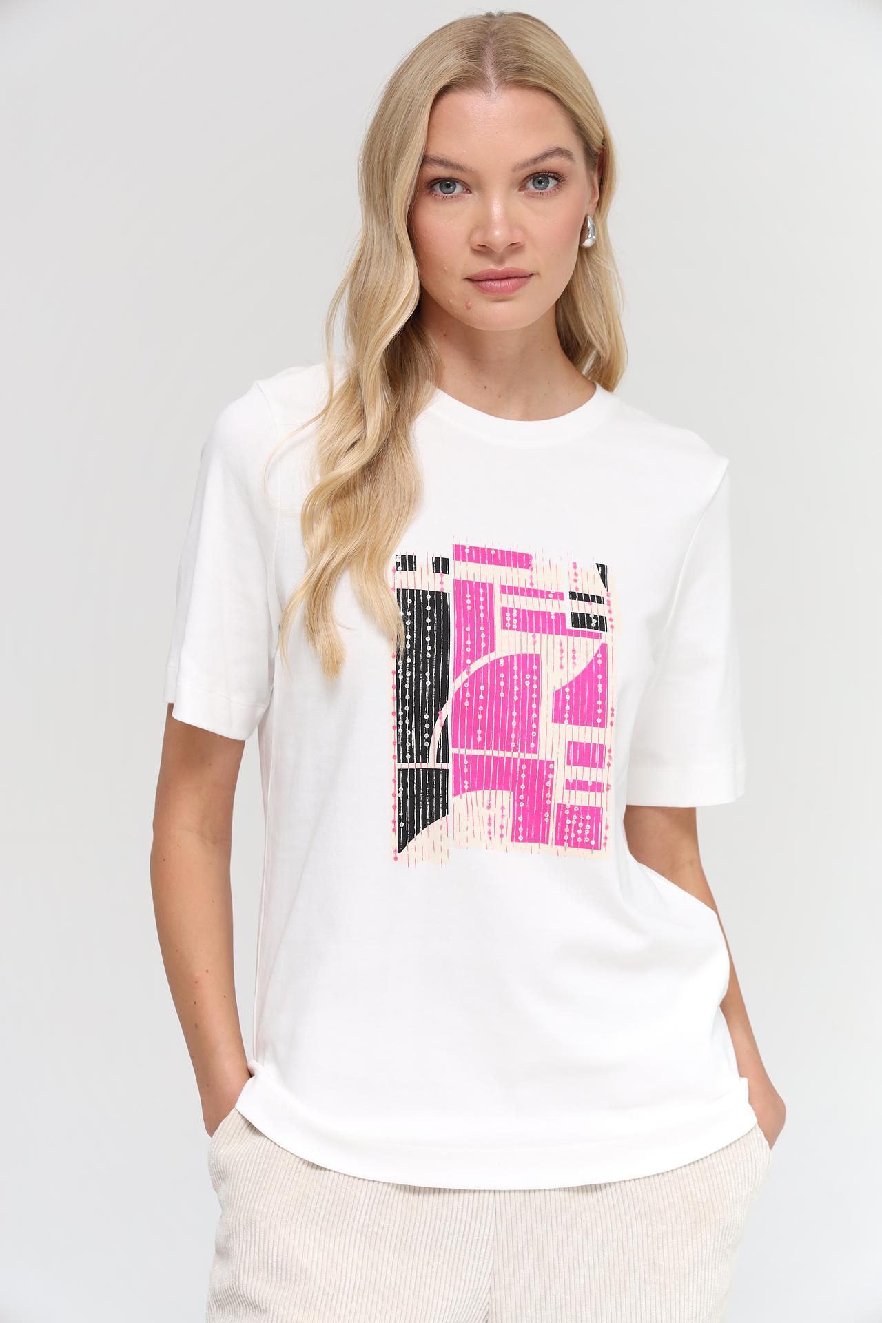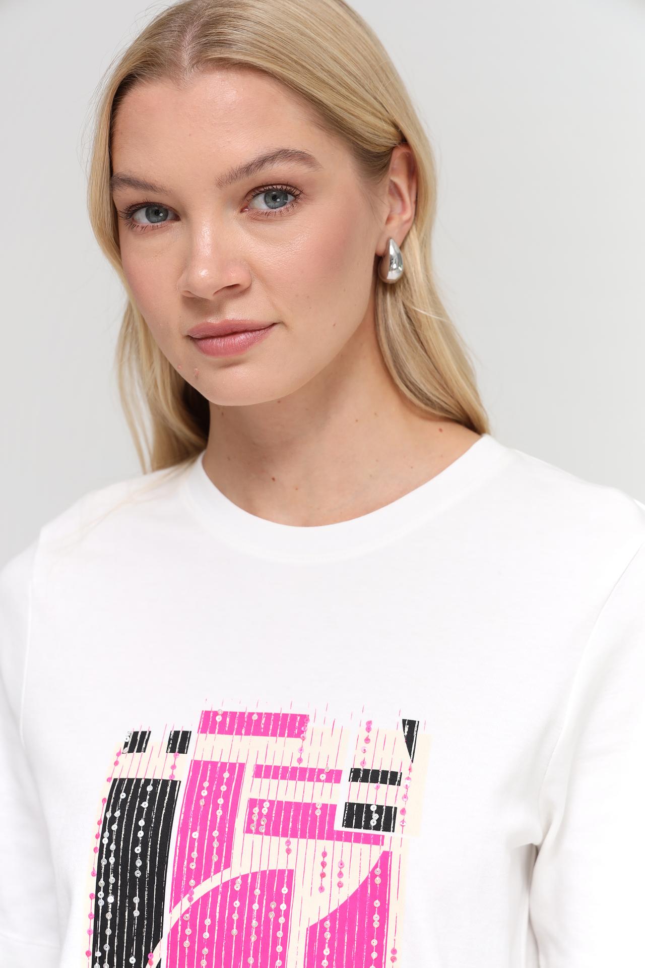 Изюминка модели – яркий абстрактный принт на груди, выполненный в современных геометрических формах и контрастных оттенках черного, розового и бежевого. Этот уникальный дизайнерский элемент придает футболке оригинальность и динамичность, позволяя легко создавать запоминающиеся ансамбли.
