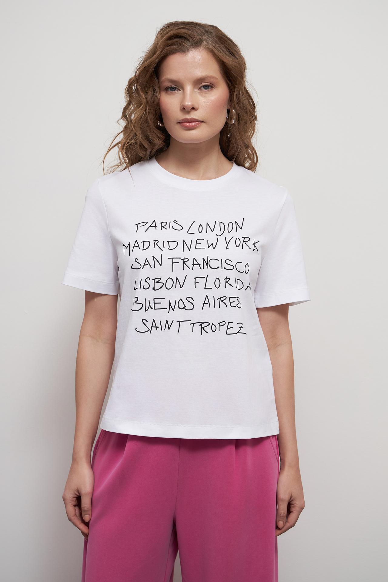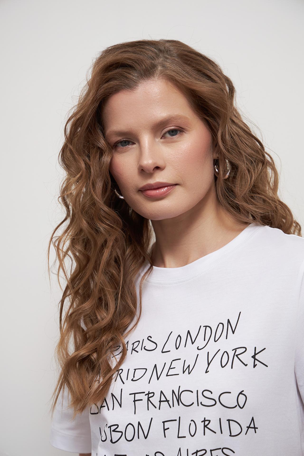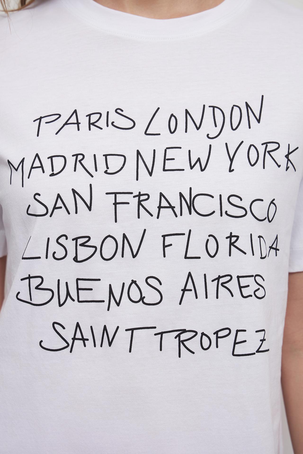 На белом фоне футболки расположен стильный принт с названиями городов, что придает ей неповторимый шарм. Футболка станет отличным дополнением к любому образу, подчеркивая вашу индивидуальность.