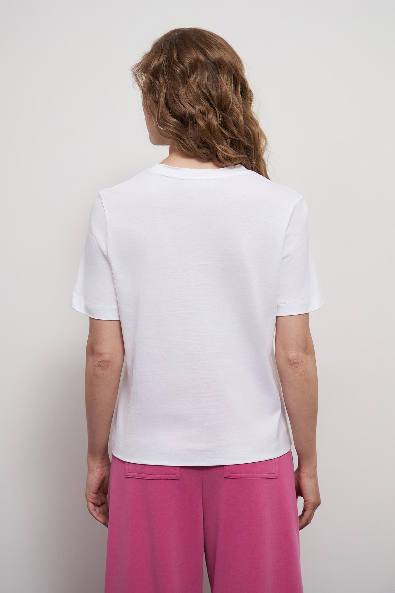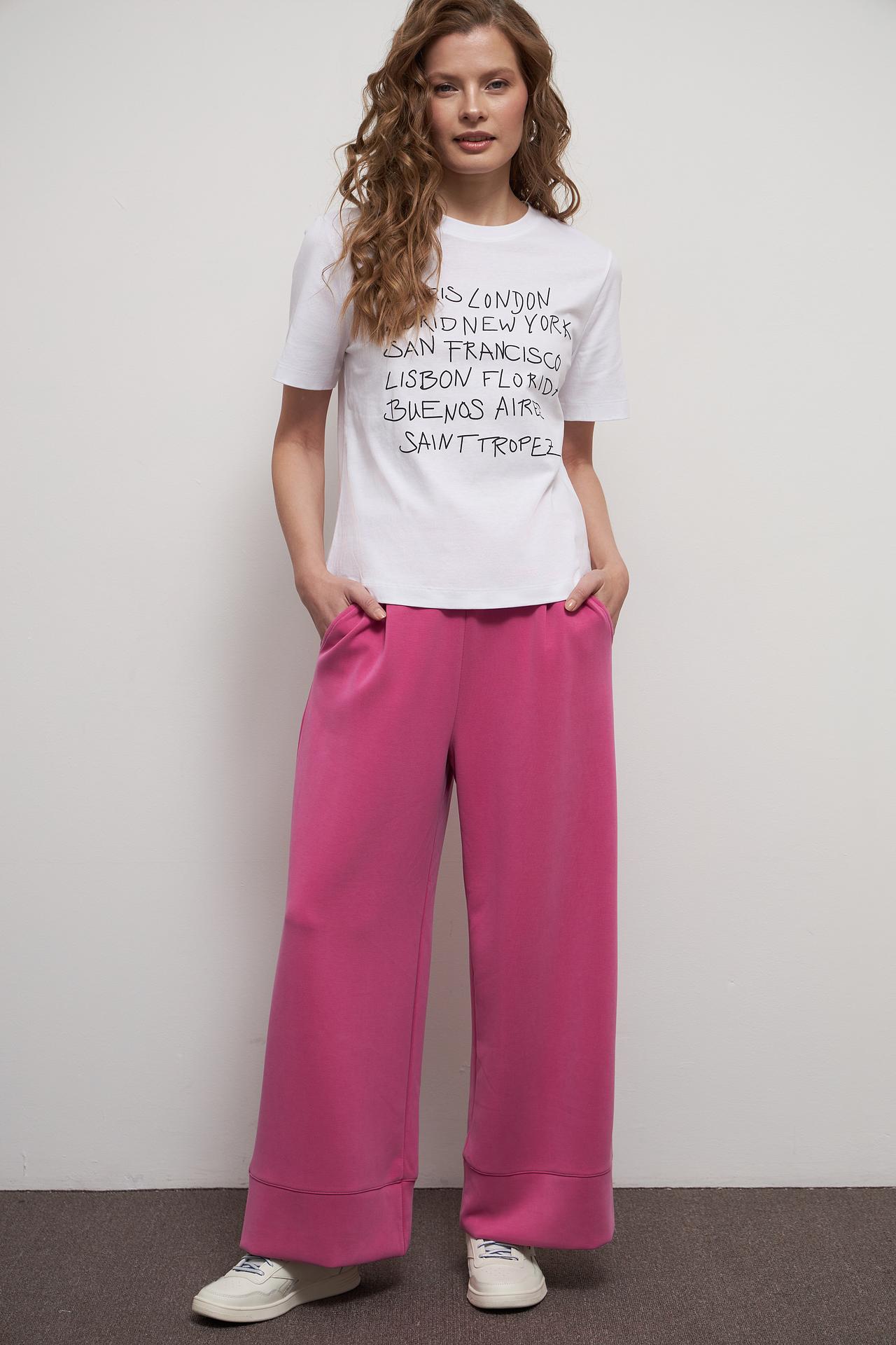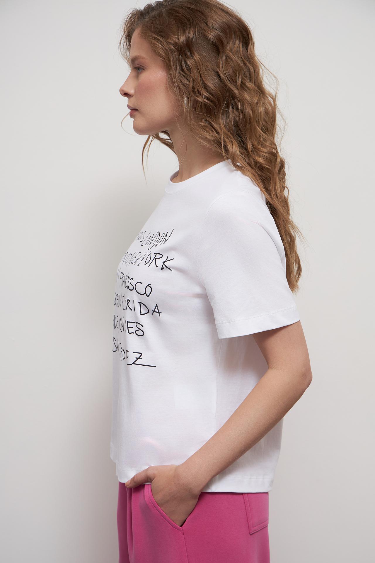 На белом фоне футболки расположен стильный принт с названиями городов, что придает ей неповторимый шарм. Футболка станет отличным дополнением к любому образу, подчеркивая вашу индивидуальность.
