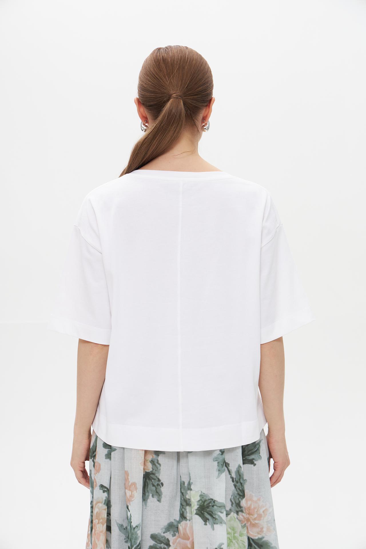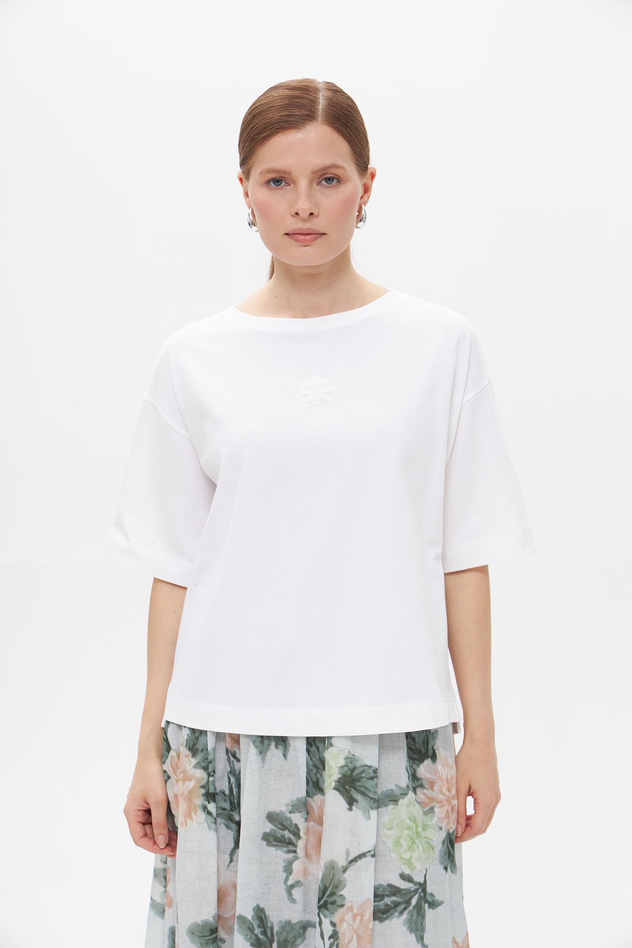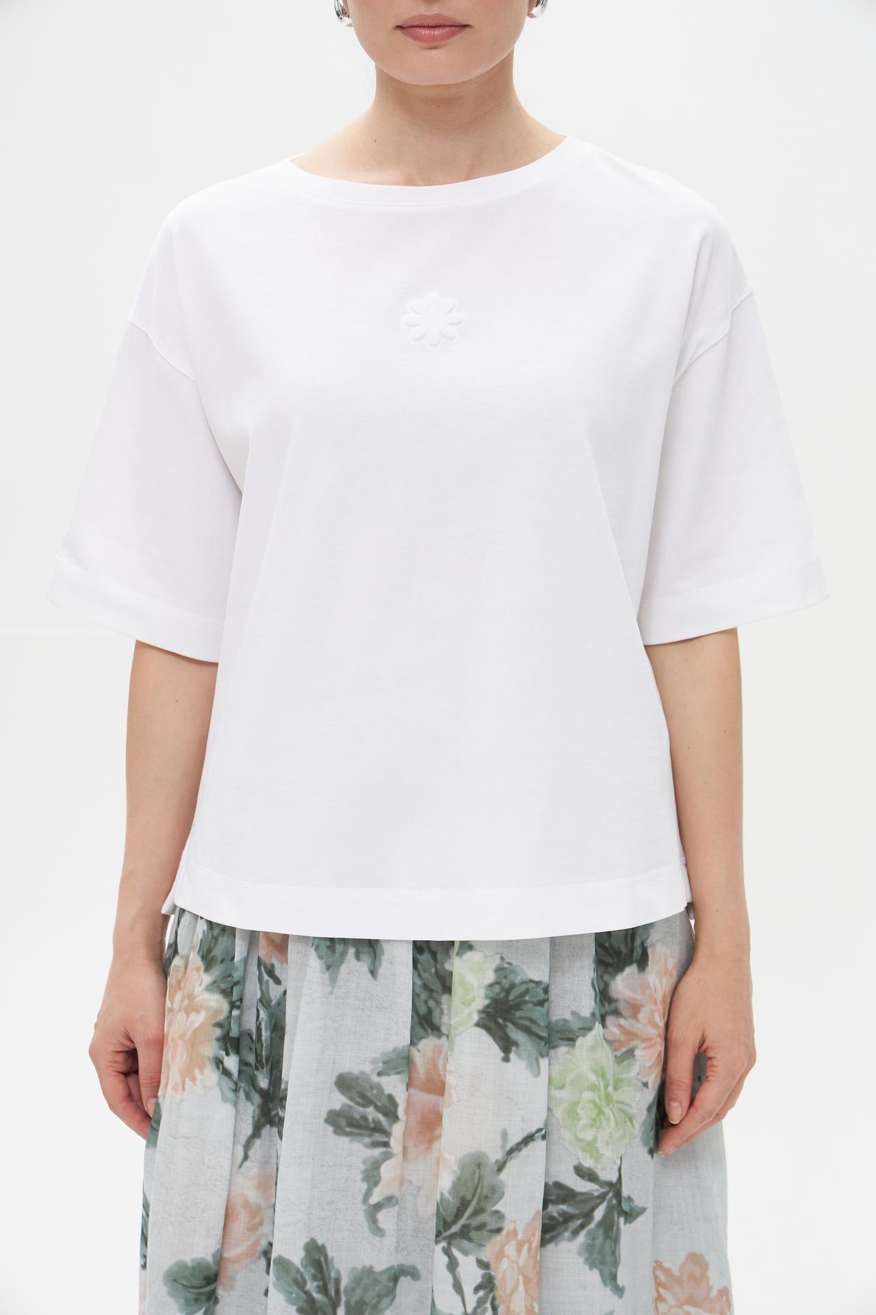 Особенностью этой футболки является утонченный декоративный элемент, который придает ей изысканность и индивидуальность. Прямой крой обеспечивает свободу движений и универсальность в сочетании с другими предметами гардероба.