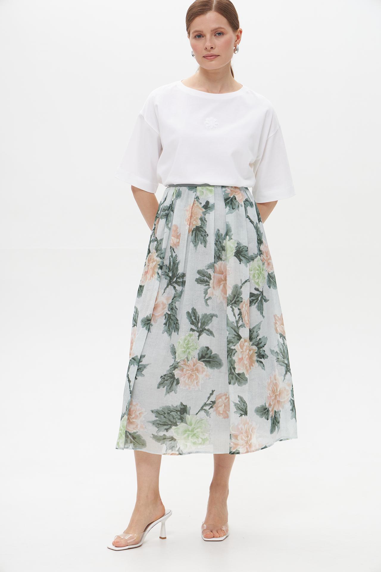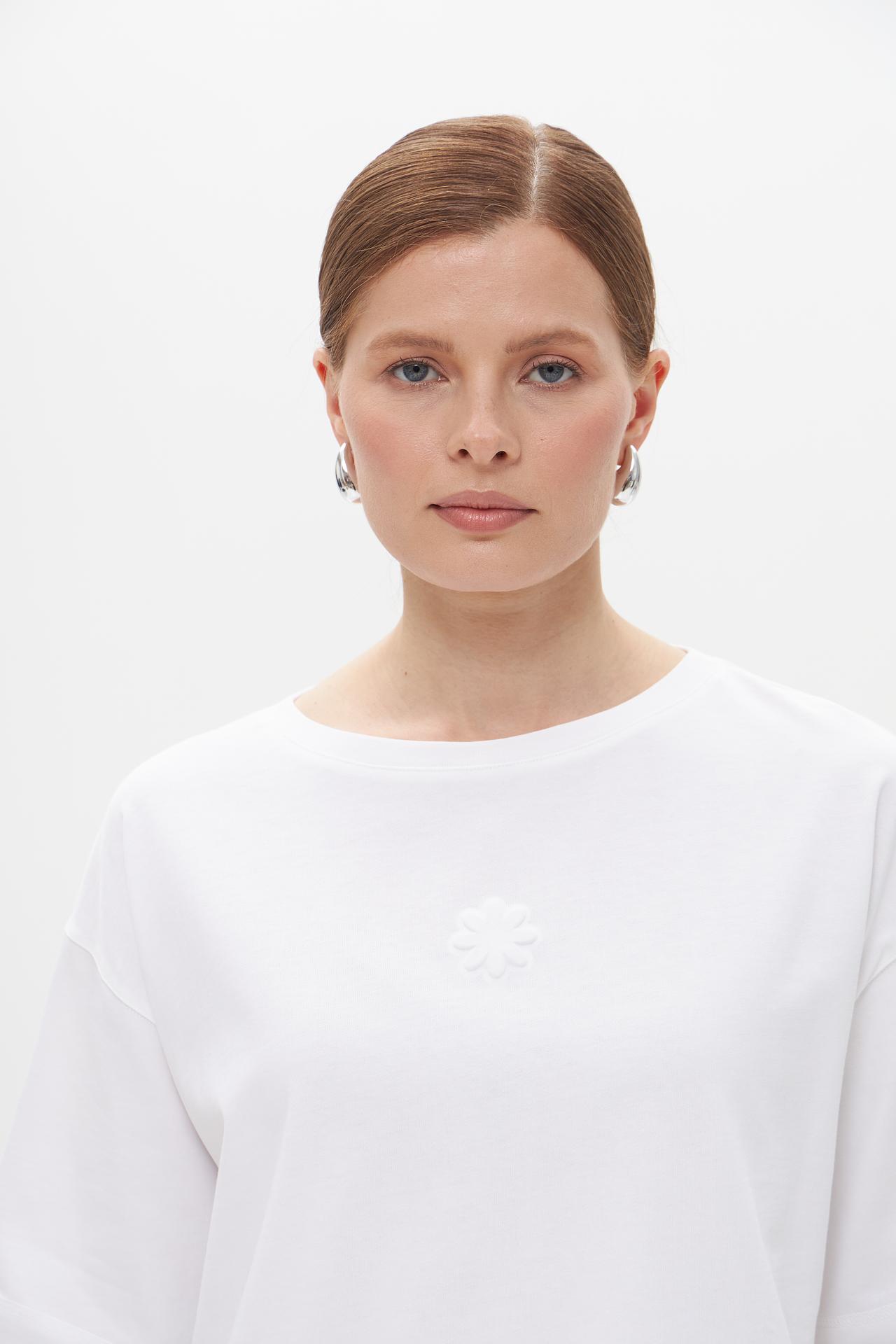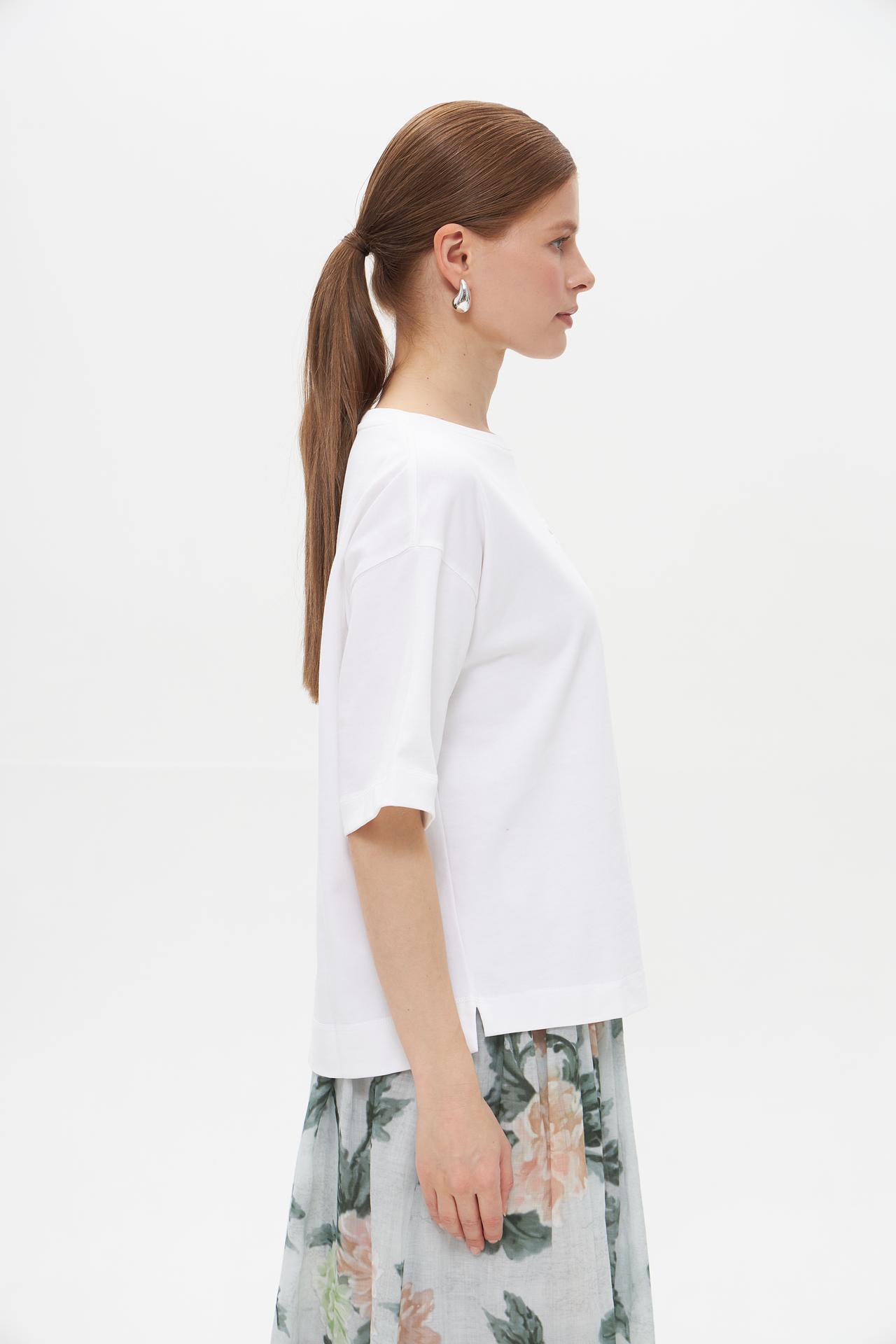 Особенностью этой футболки является утонченный декоративный элемент, который придает ей изысканность и индивидуальность. Прямой крой обеспечивает свободу движений и универсальность в сочетании с другими предметами гардероба.