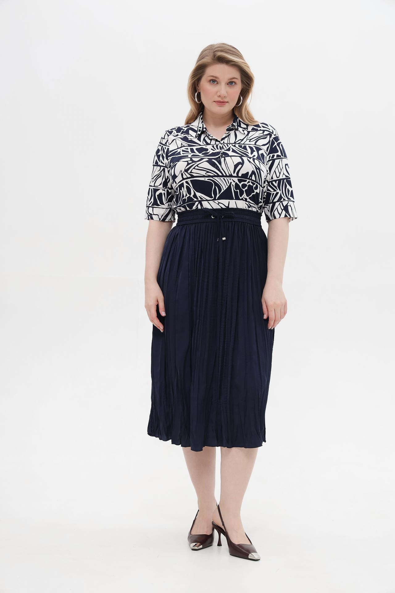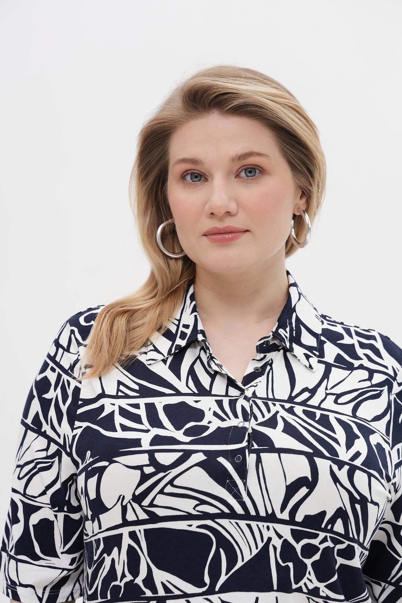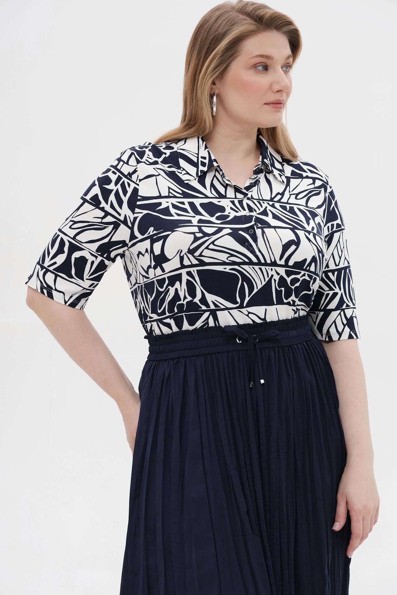 - Изысканный дизайн: Классический воротник и короткие рукава создают элегантный и универсальный образ. Белый фон с контрастным синим абстрактным узором придает модели современный и стильный вид.