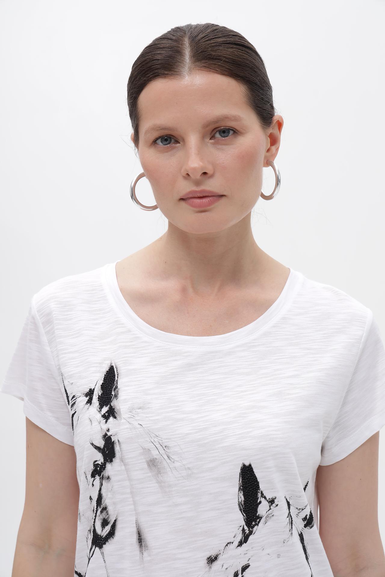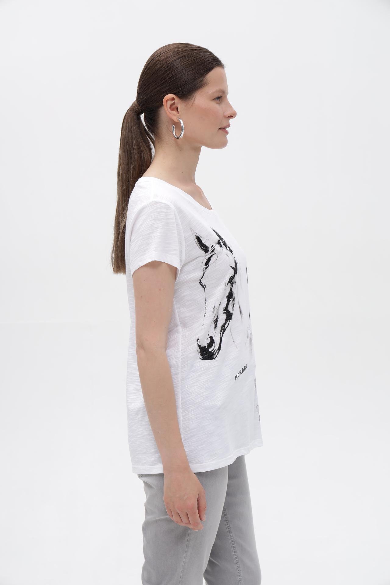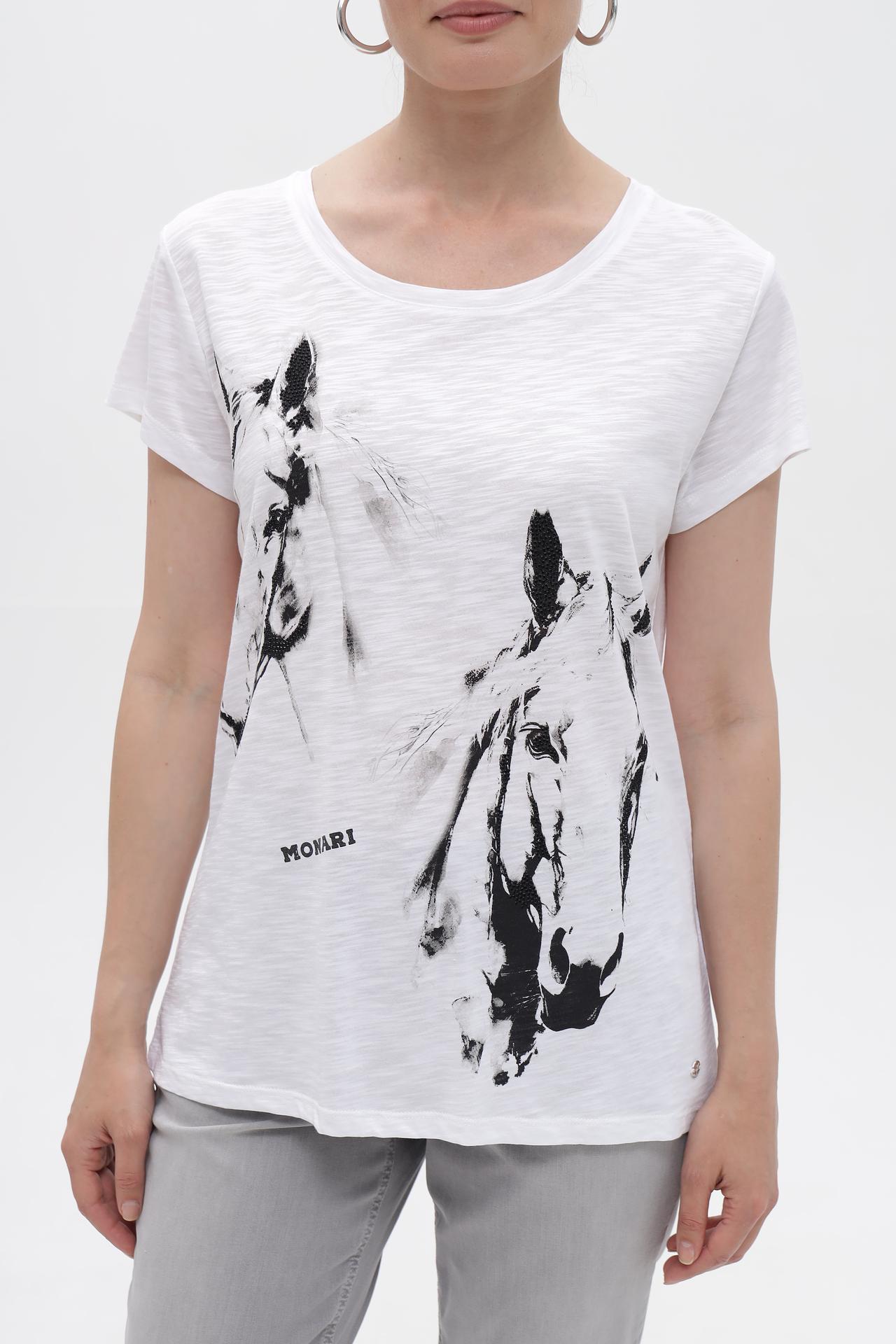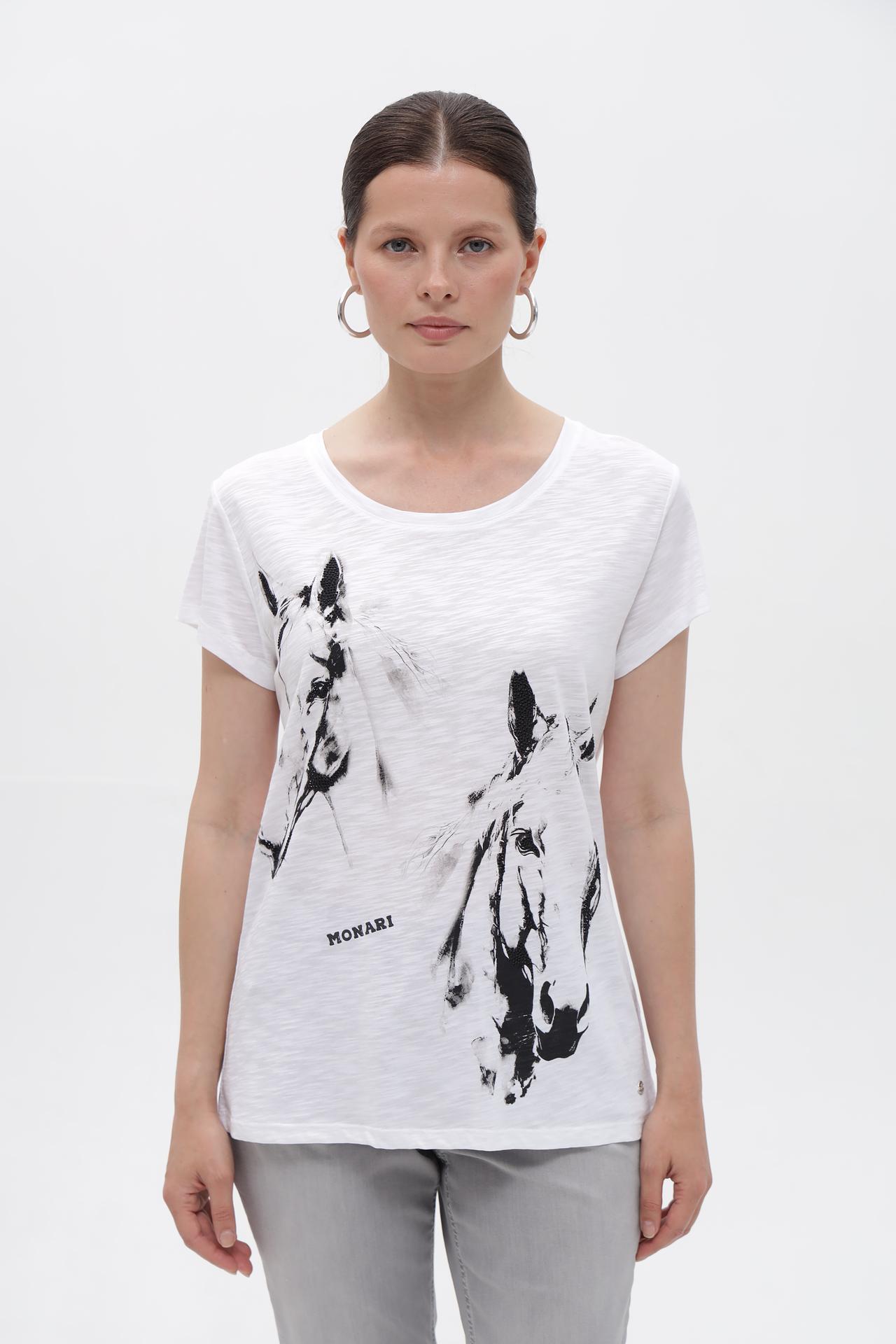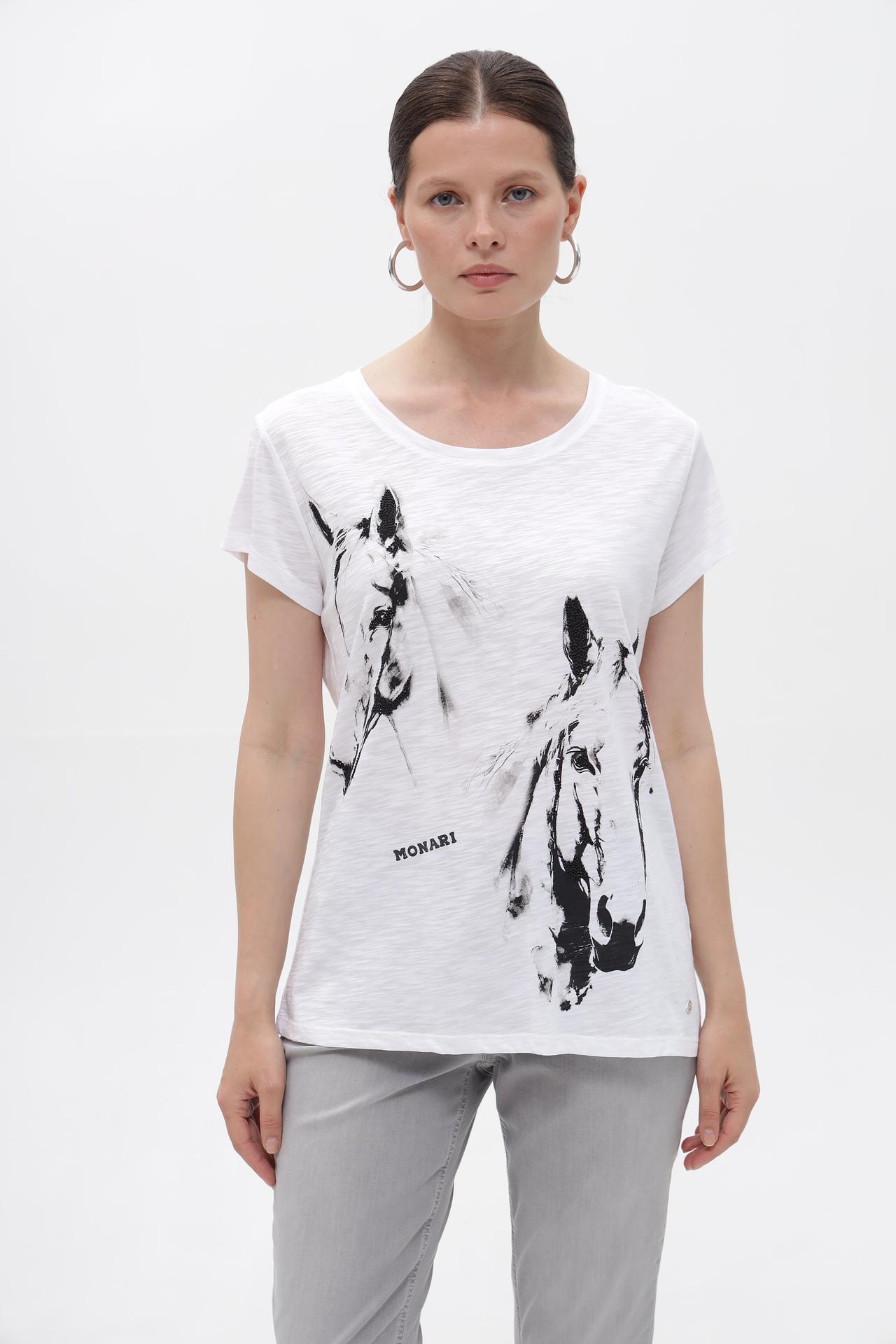 Элегантная футболка Monari выполнена из смесового материала (50% хлопок, 50% модал), что обеспечивает комфорт и мягкость при носке. Нежный и стильный принт с изображением лошадей придает образу неповторимый шарм и индивидуальность. Идеальный выбор для создания утонченных повседневных образов.
