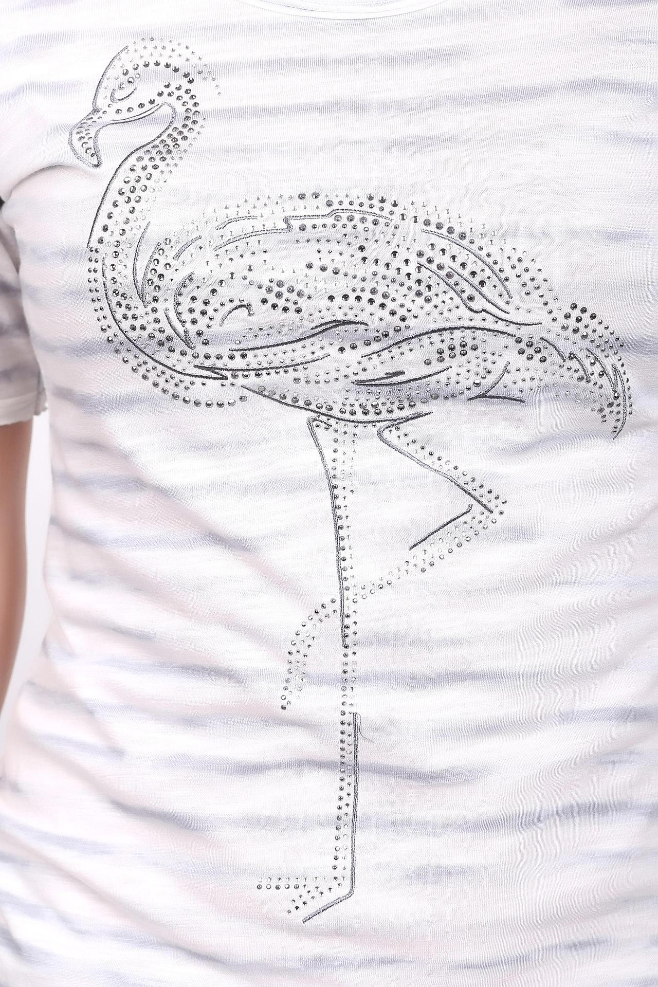 Белая футболка в полоску станет отличным дополнением к вашему гардеробу, а оригинальный принт в виде фламинго, украшенный стразами, добавит образу изюминку и неповторимость. Эта футболка отлично сочетается с джинсами, шортами, юбками, позволяя создавать разнообразные и актуальные образы для любого случая.
