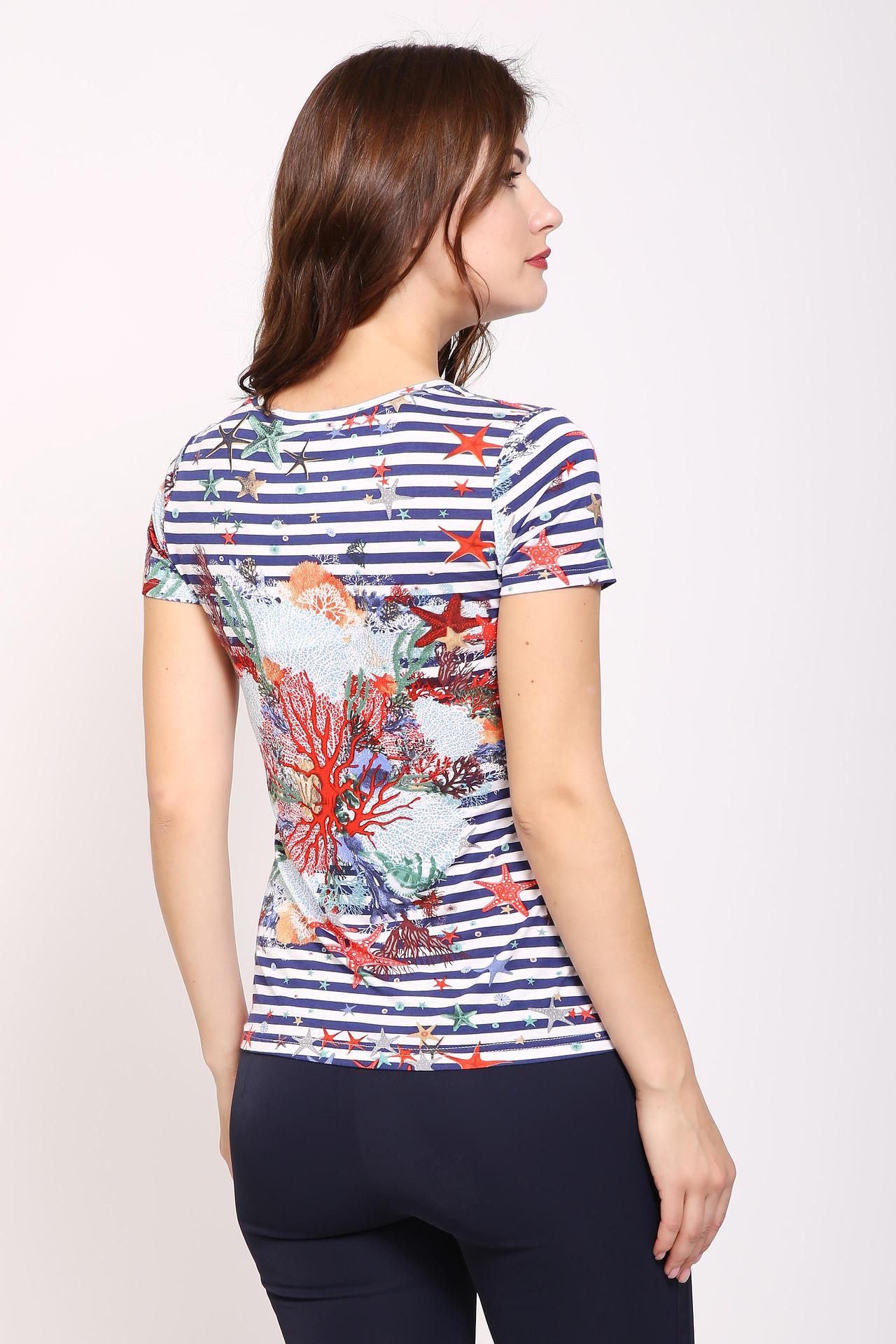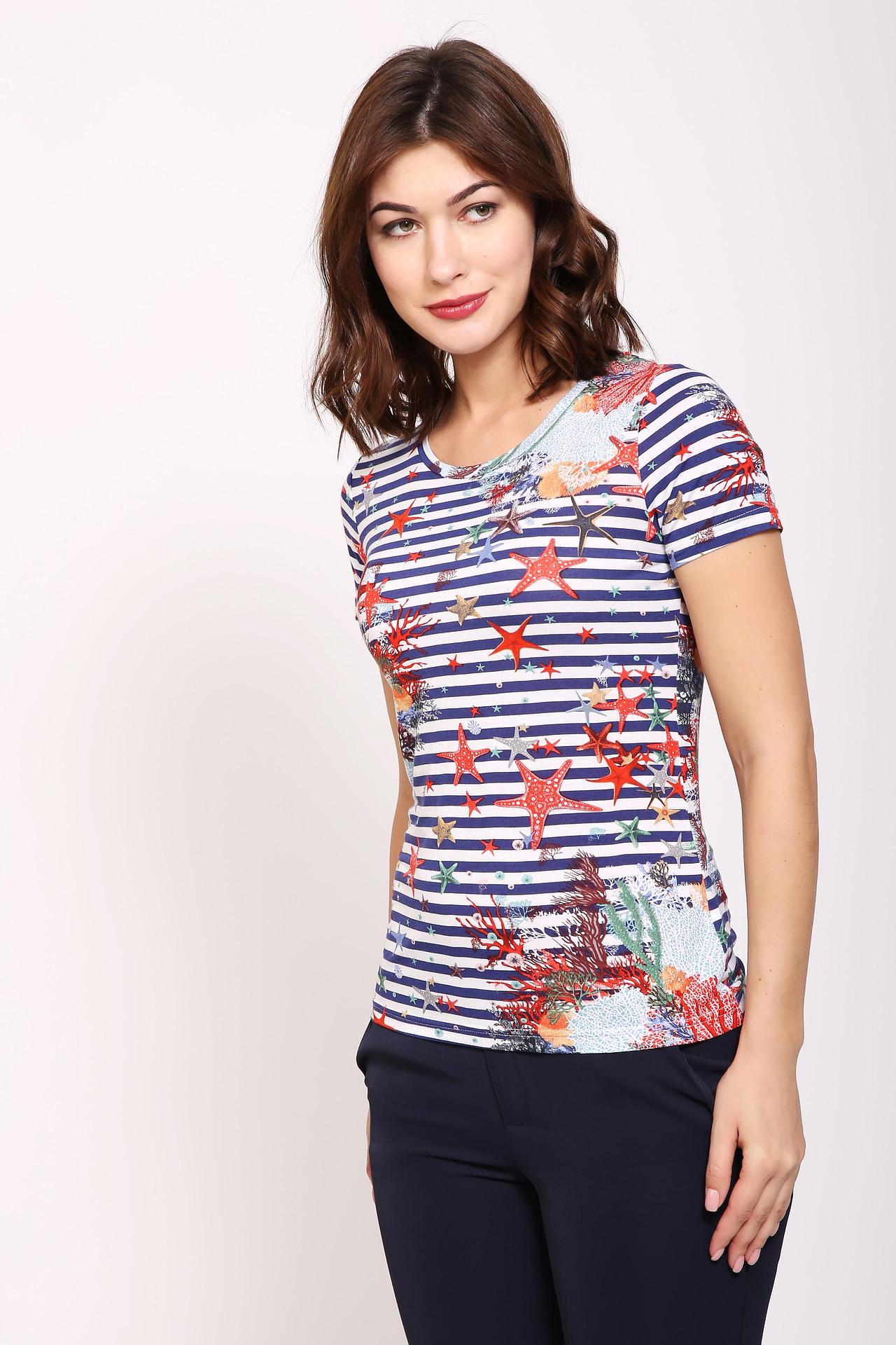 Эта футболка Pezzo – идеальный выбор для создания легкого и стильного образа. Модель выполнена из приятной к телу ткани на основе вискозы с добавлением эластана, обеспечивающей комфорт и свободу движений. Полосатый принт в сочетании с яркими элементами морской тематики придает футболке свежий и запоминающийся вид. Классический круглый вырез горловины и короткие рукава делают ее универсальной для различных сочетаний в вашем гардеробе.