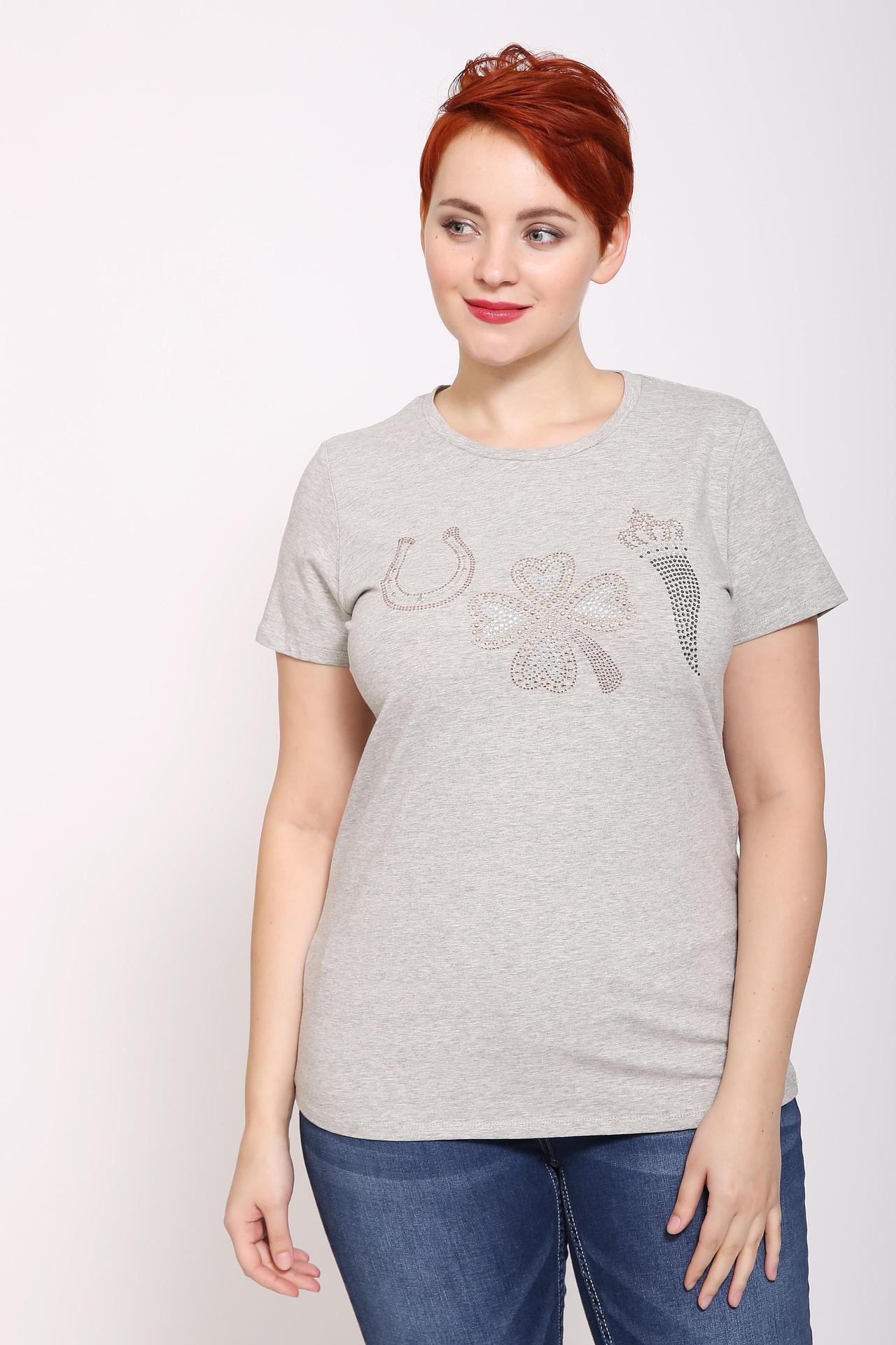 - Декор: Футболка украшена сверкающими стразами, образующими композицию из подковы, клеверного листа и короны. Этот элемент притягивает взгляды и делает образ более выразительным.