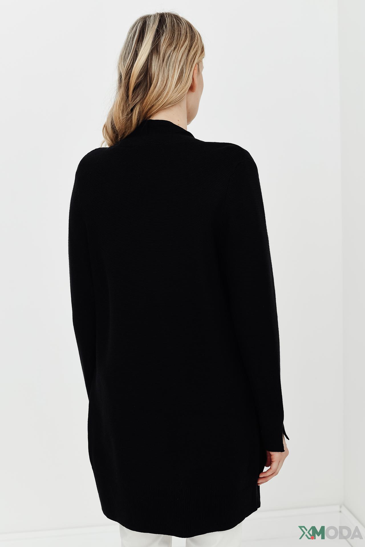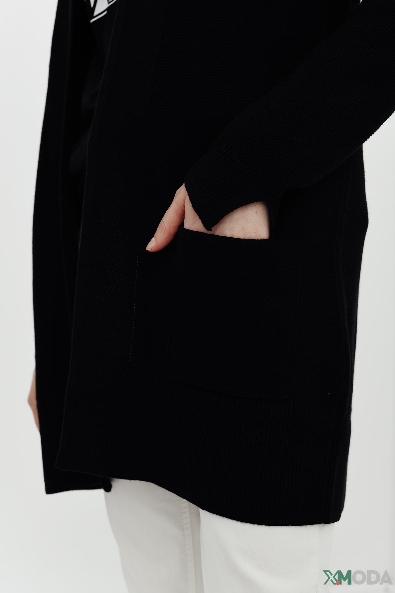 - Дизайн и крой: Модель выполнена в классическом черном цвете с V-образным вырезом и отсутствием застежки. Прямой удлиненный силуэт и накладные карманы придают кардигану функциональность и стильный вид.