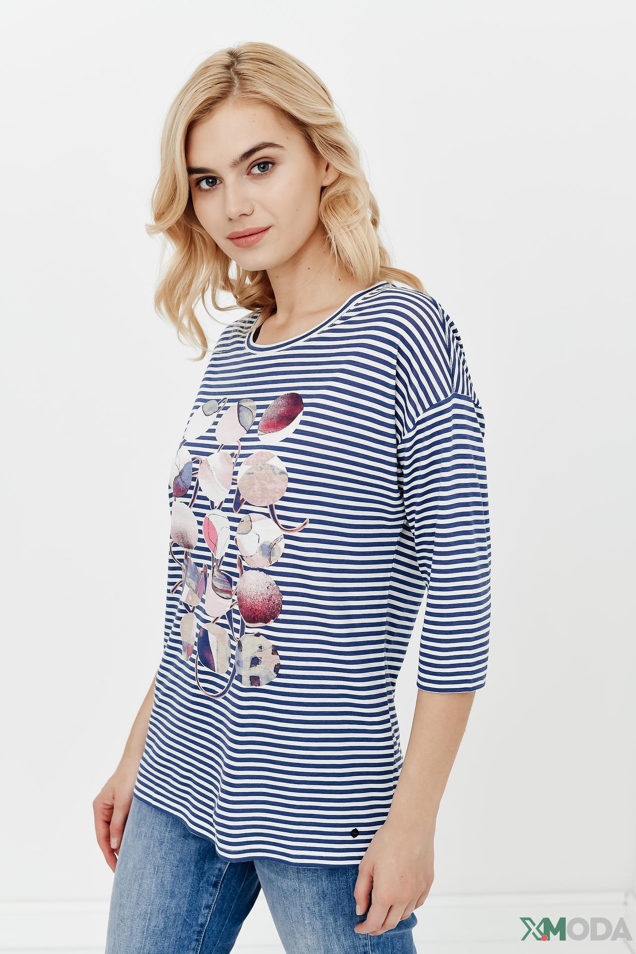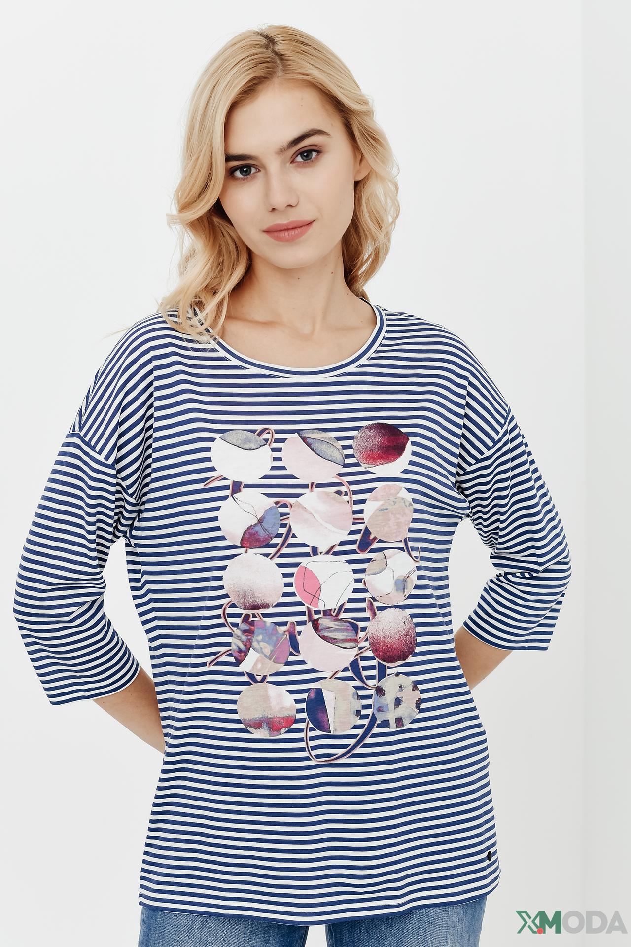 Стильный лонгслив от Olsen — идеальное дополнение к вашему повседневному гардеробу. Модель выполнена в классическую сине-белую полоску, которая никогда не выходит из моды. Оригинальный принт в виде композиции из кругов добавляет образу динамичности и уникальности. Лонгслив прекрасно сочетается с джинсами, брюками и юбками, позволяя создавать разнообразные образы.