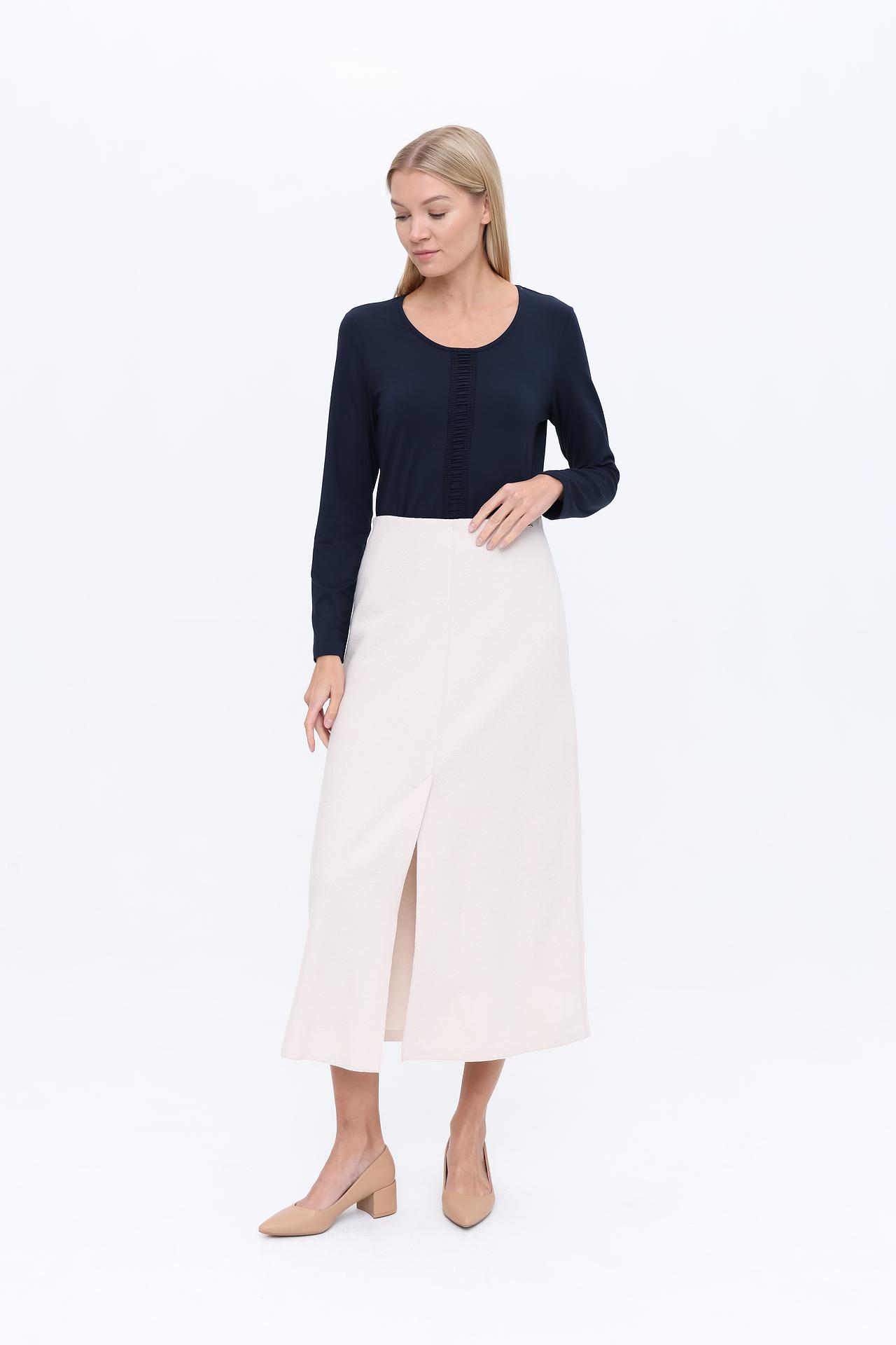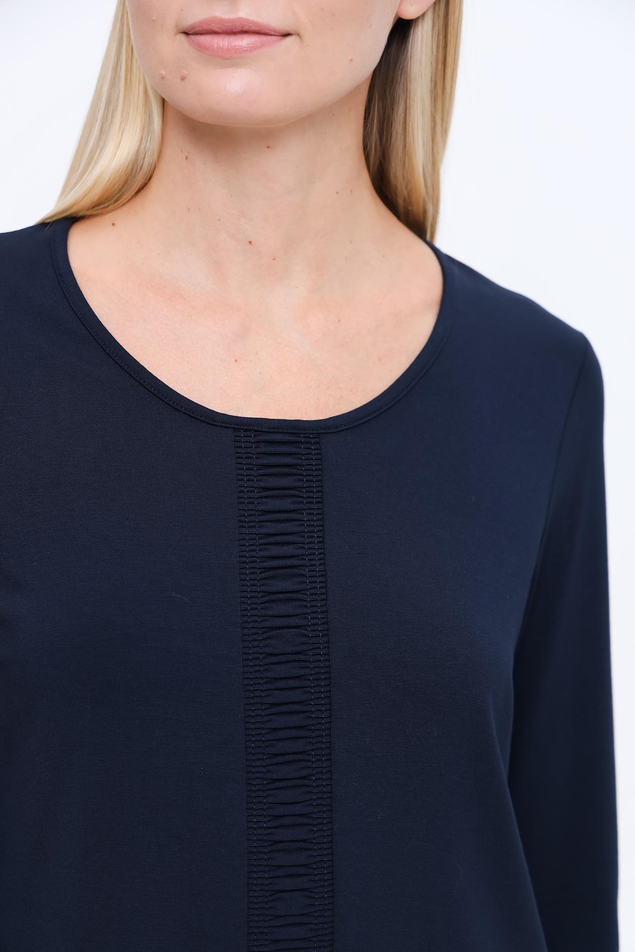 Элегантный женский лонгслив имеет классический крой и длинные рукава, что делает его универсальным для любого сезона. Изделие дополнено изящной вертикальной драпировкой на груди, которая придает модели утонченность и индивидуальность. Это прекрасный выбор для работы, прогулок или встреч с друзьями, обеспечивающий комфорт и уверенность в течение всего дня.
