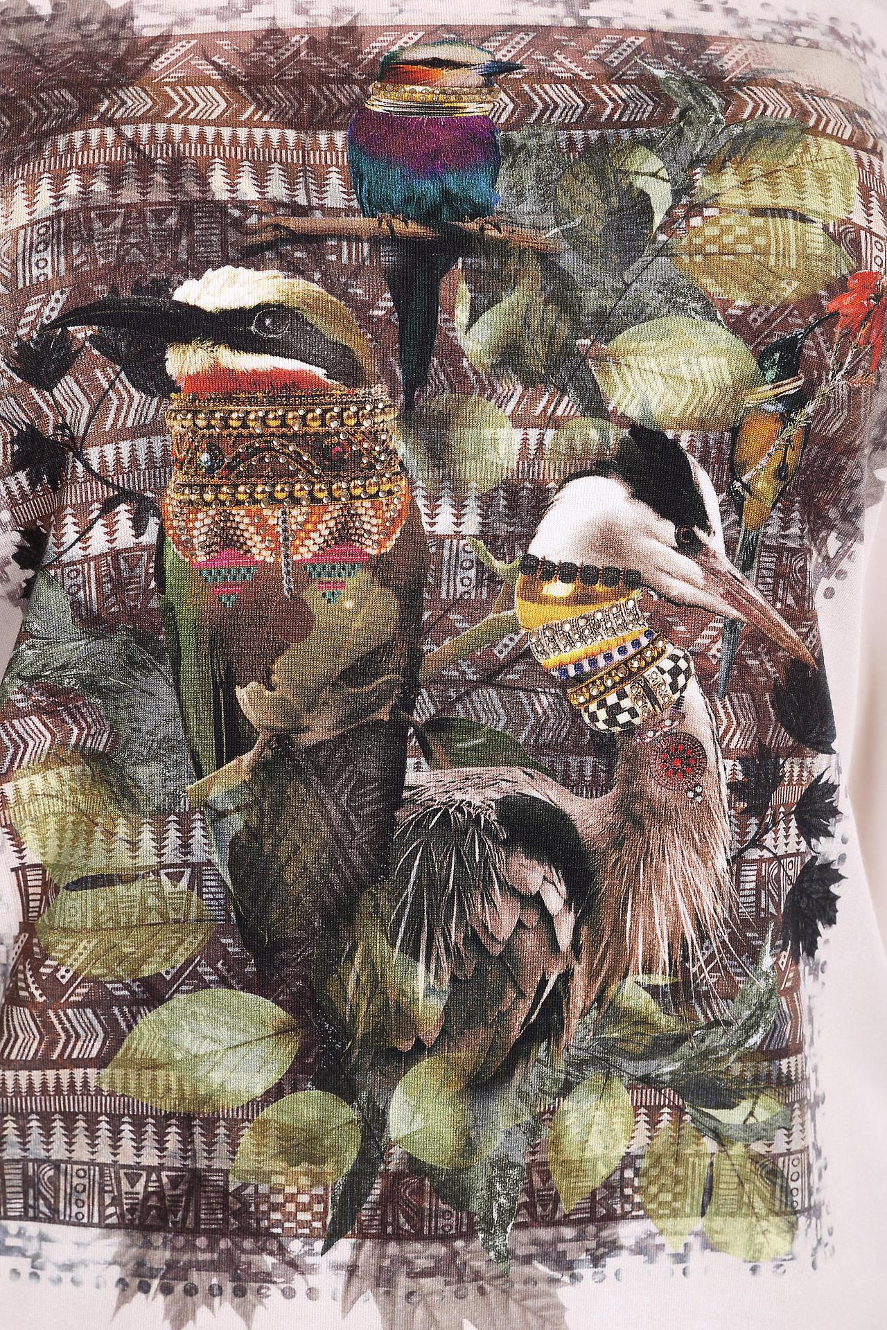 Центральный элемент дизайна – уникальный принт, изображающий экзотических птиц с элементами этнических орнаментов и бисера. Этот модный принт придает лонгсливу оригинальность и выразительность, делая его ярким акцентом в вашем образе. Детализированное изображение птиц на бежевом фоне создает гармоничное и привлекательное сочетание.