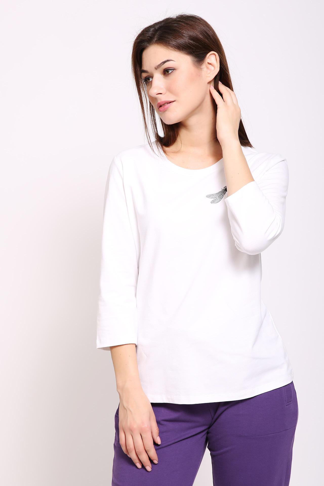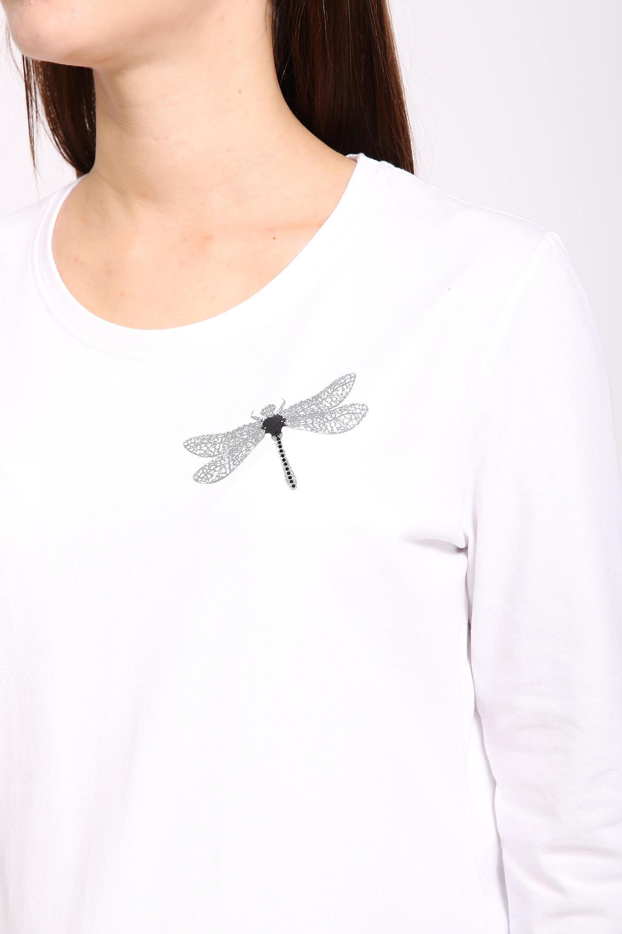- Дизайн: Классический крой с рукавом три четверти и элегантным круглым вырезом горловины. Особое внимание привлекает изящная вышивка в виде стрекозы, декорированная сверкающими стразами, расположенная на груди.