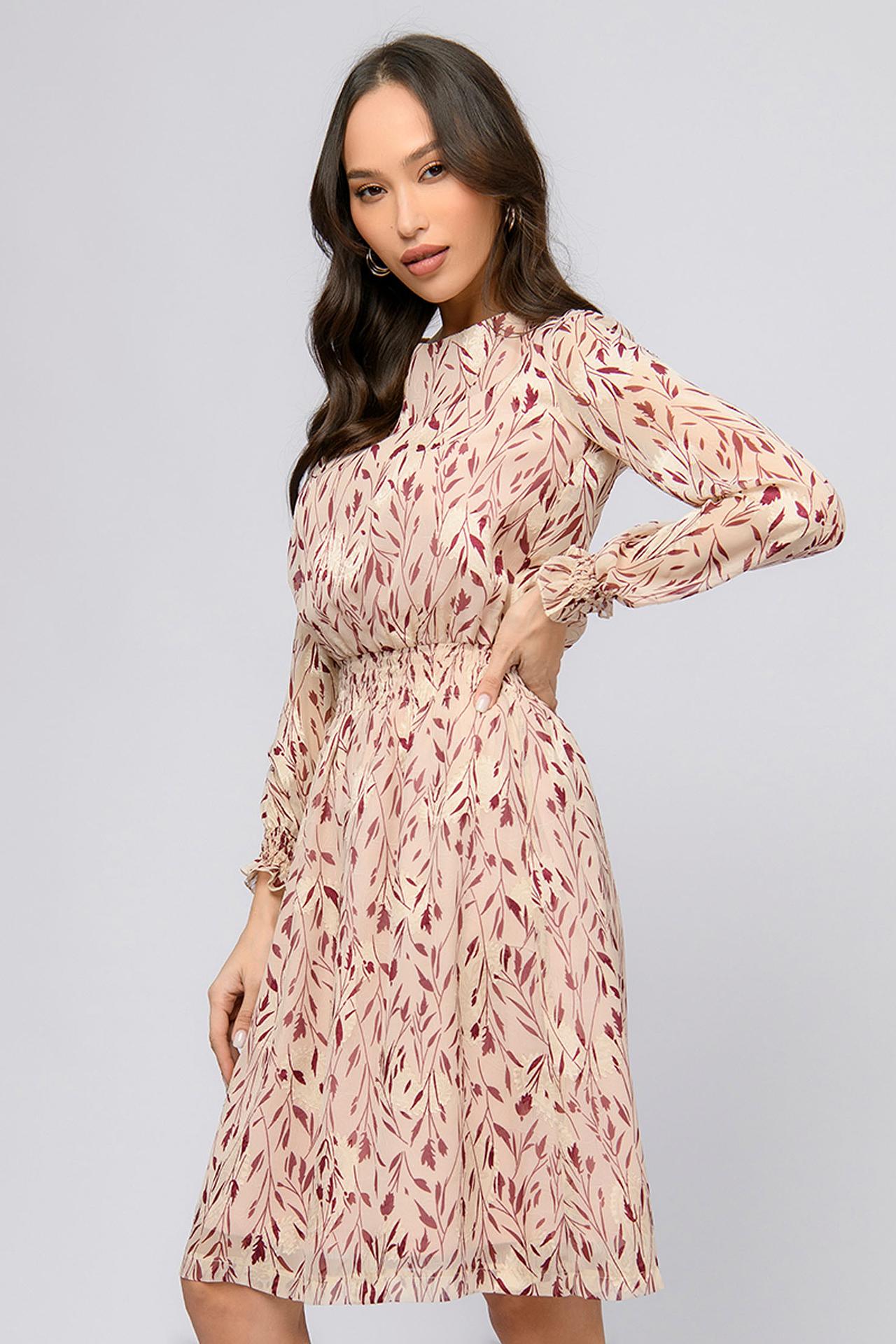 Платье 1001 DRESS бежевое с бордовым растительным принтом