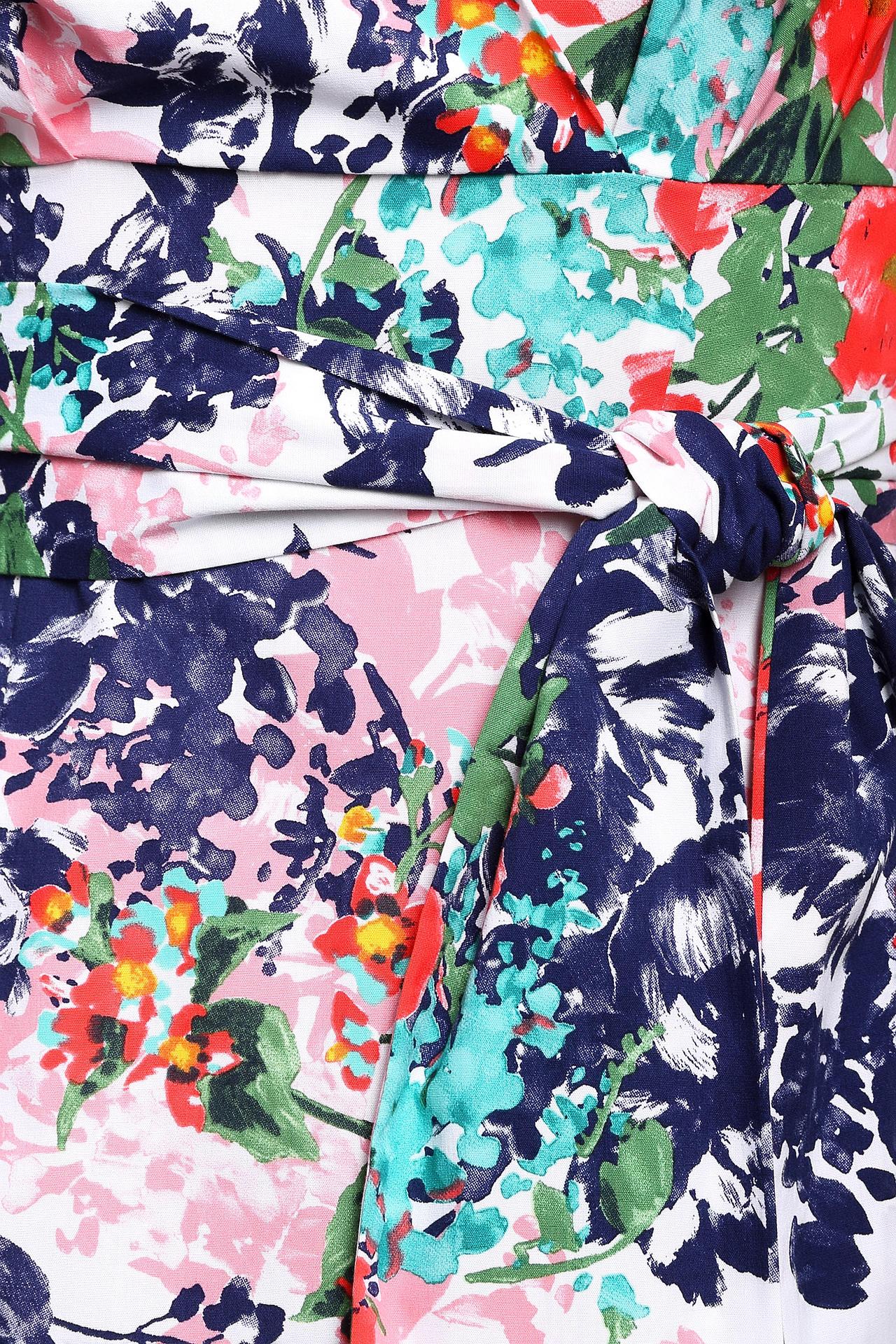 Элегантное летнее платье от бренда Argent, выполненное в цветочном стиле, идеально подойдет для создания яркого и женственного образа. Привлекательный V-образный вырез и расклешенный силуэт подчеркнут достоинства фигуры, а пояс на талии создаст изящный акцент. Платье украшено эффектным цветочным принтом, сочетающим в себе насыщенные оттенки красного, синего, бирюзового и розового на белом фоне.